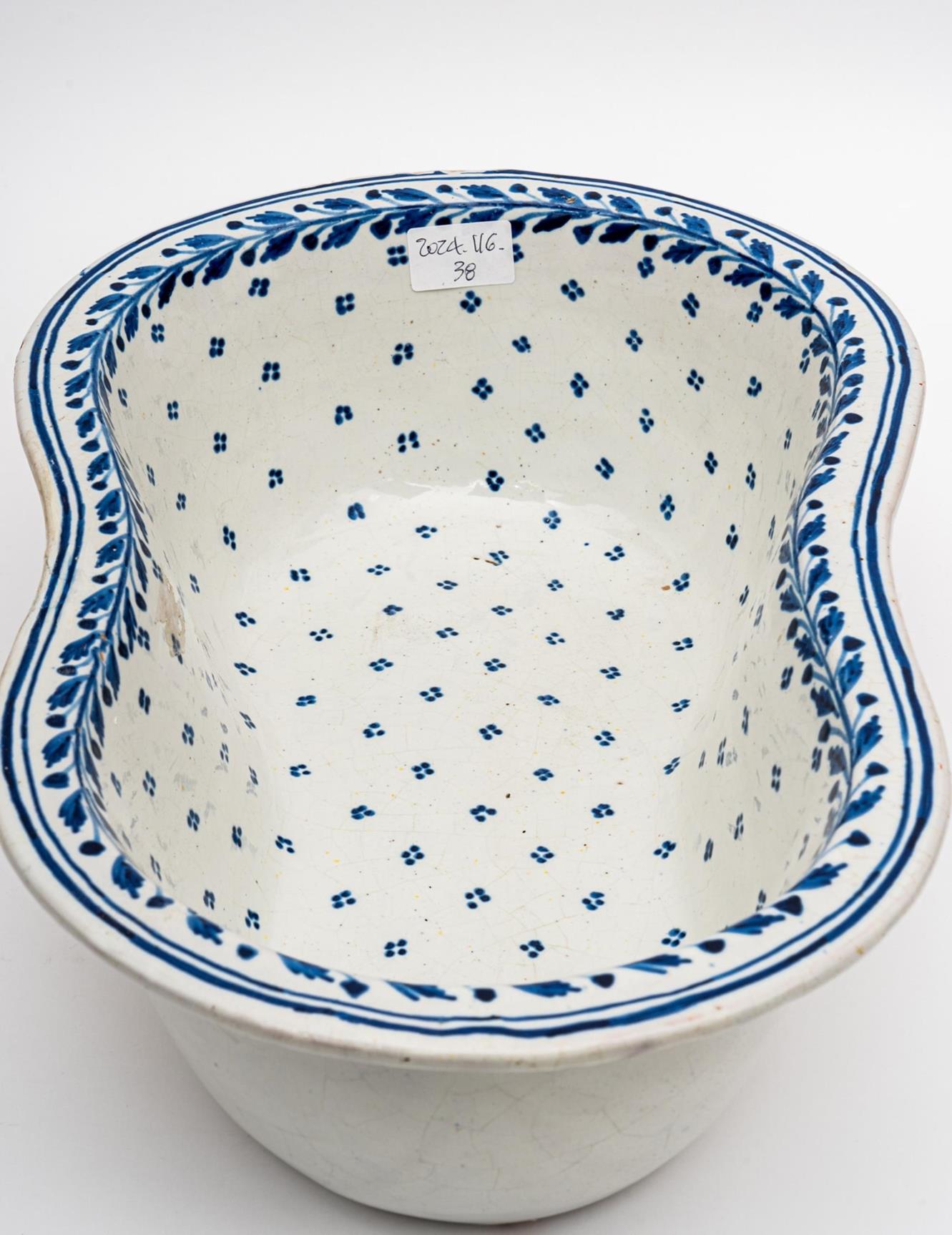 Bidet fine XIX secolo con bordo mistilineo decorato in blu a serto di fiori e a puntini all'interno