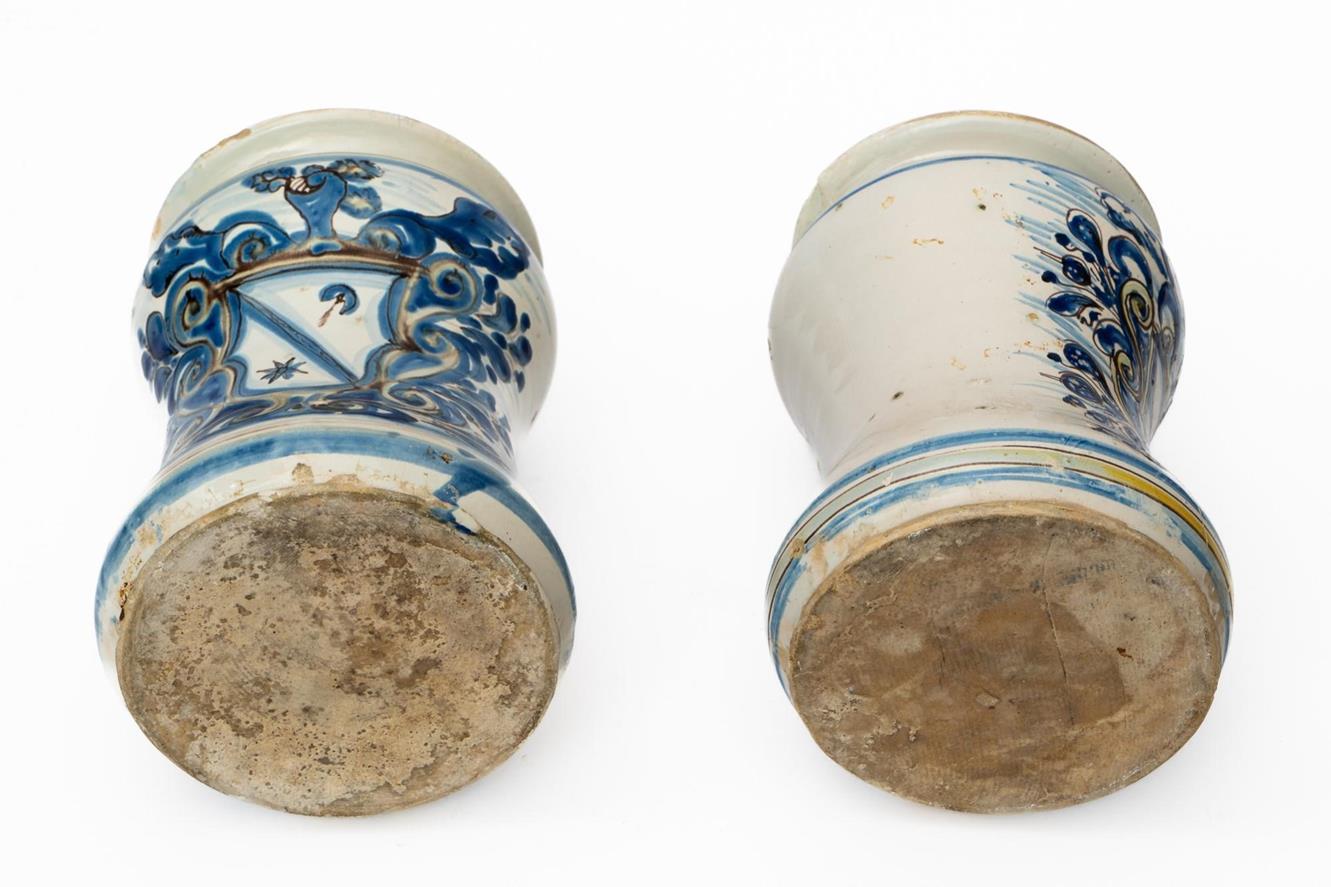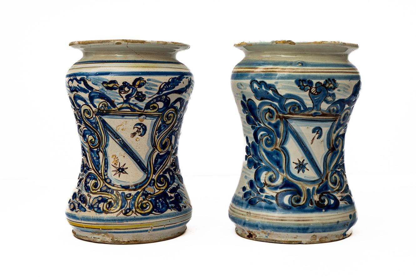 Coppia di albarelli da farmacia raffiguranti “Stemmi”. Manifattura di Laterza XVII secolo