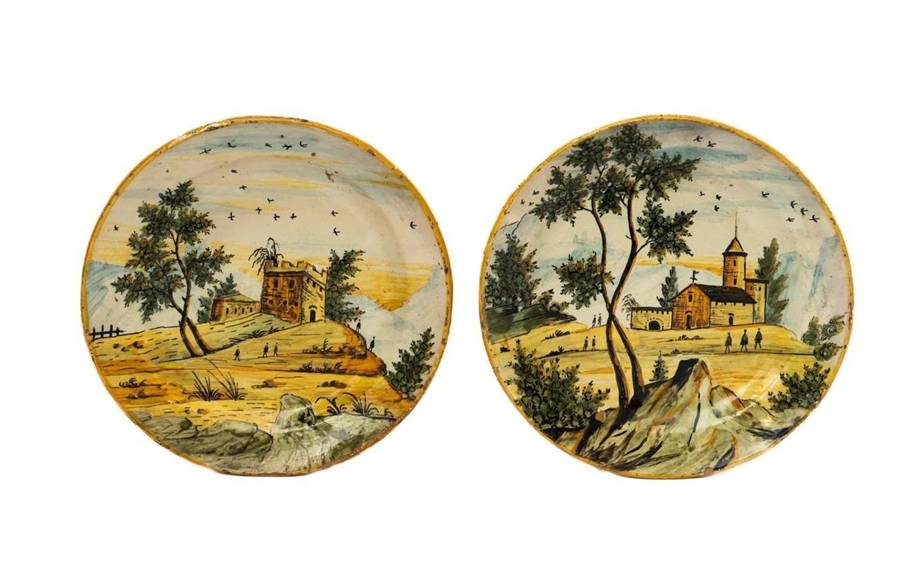 Lotto 27 | Coppia di piatti con decoro di città e viandanti Manifattura di Torre de' Passeri della fine del XIX secolo