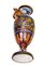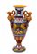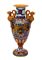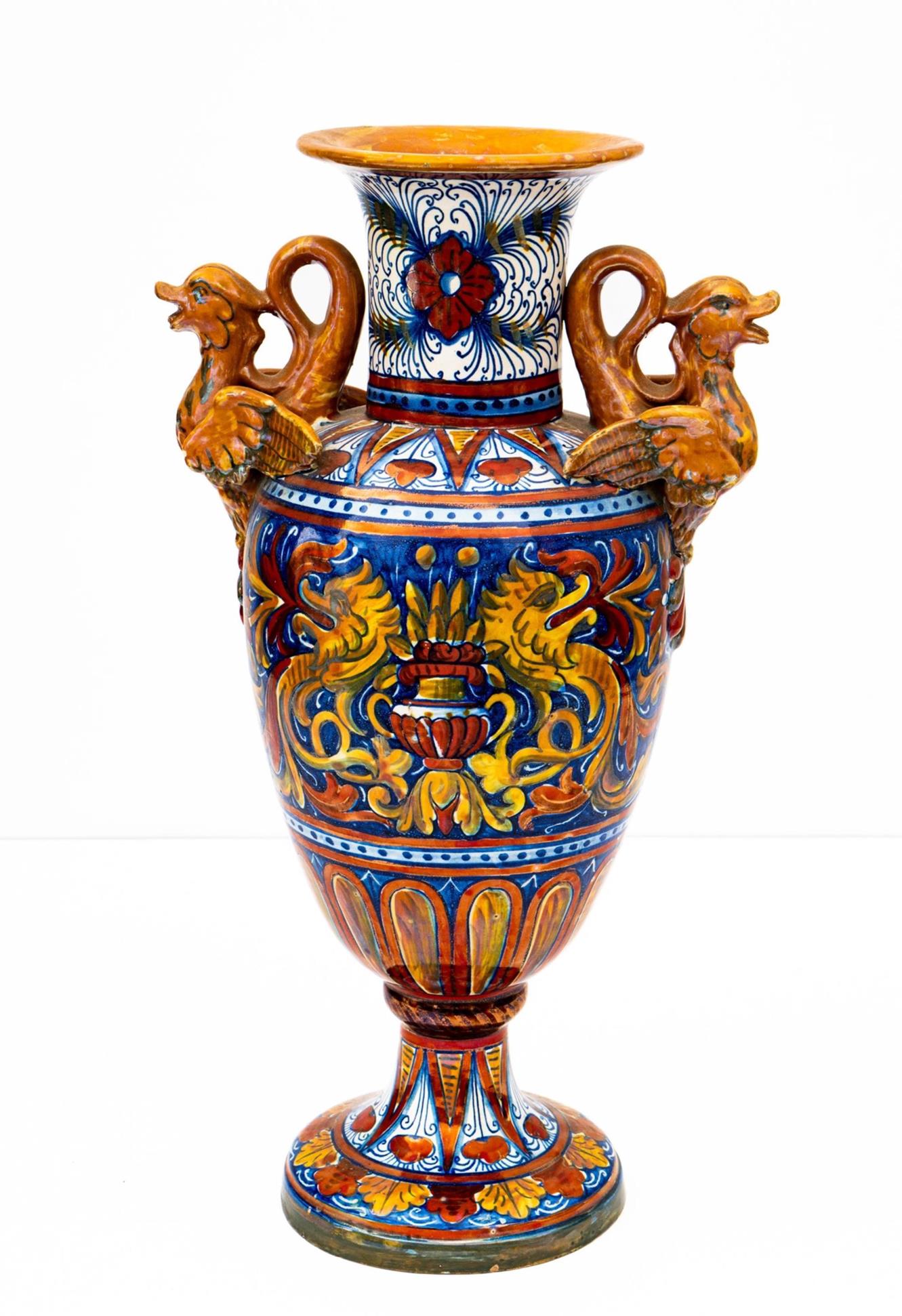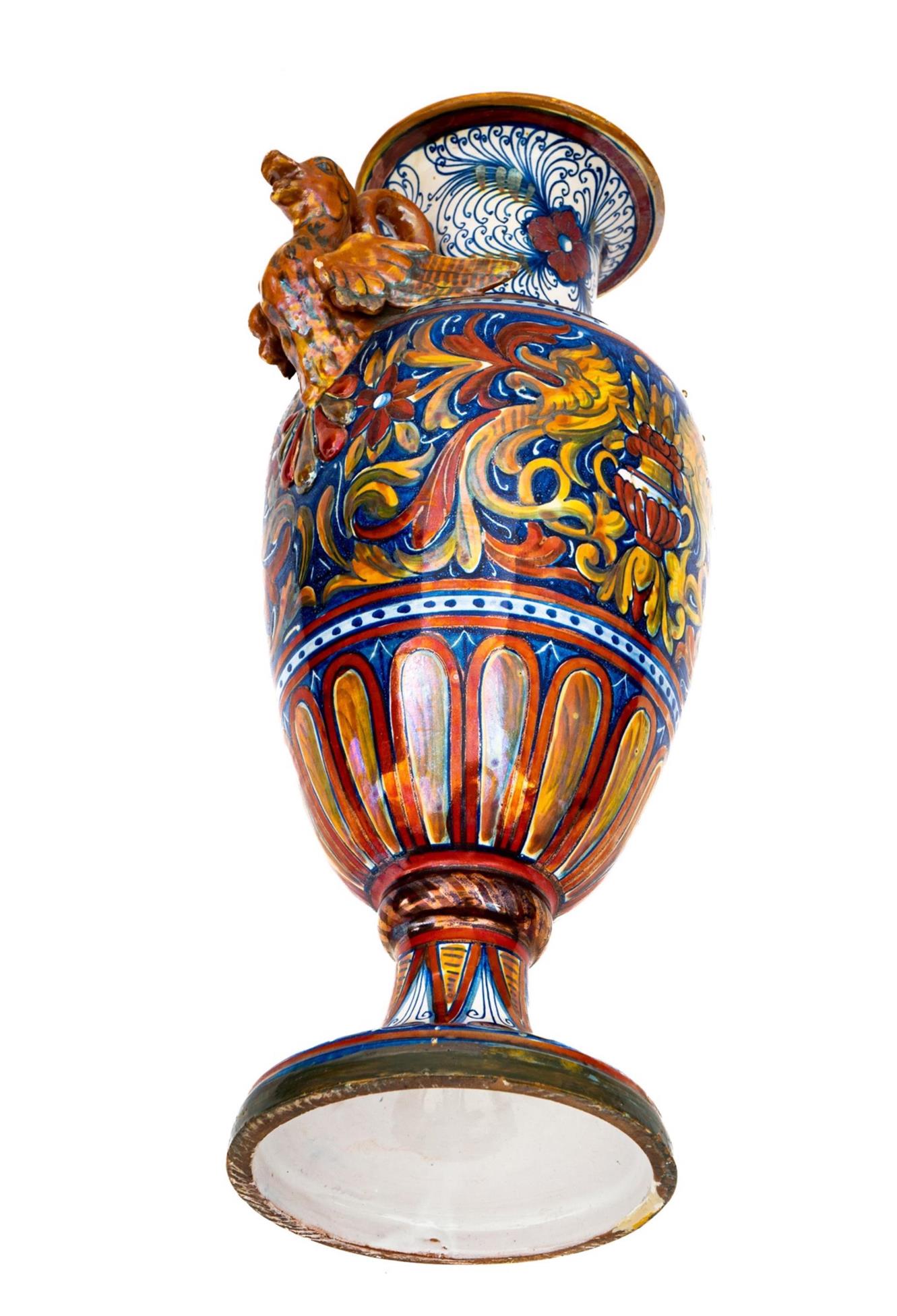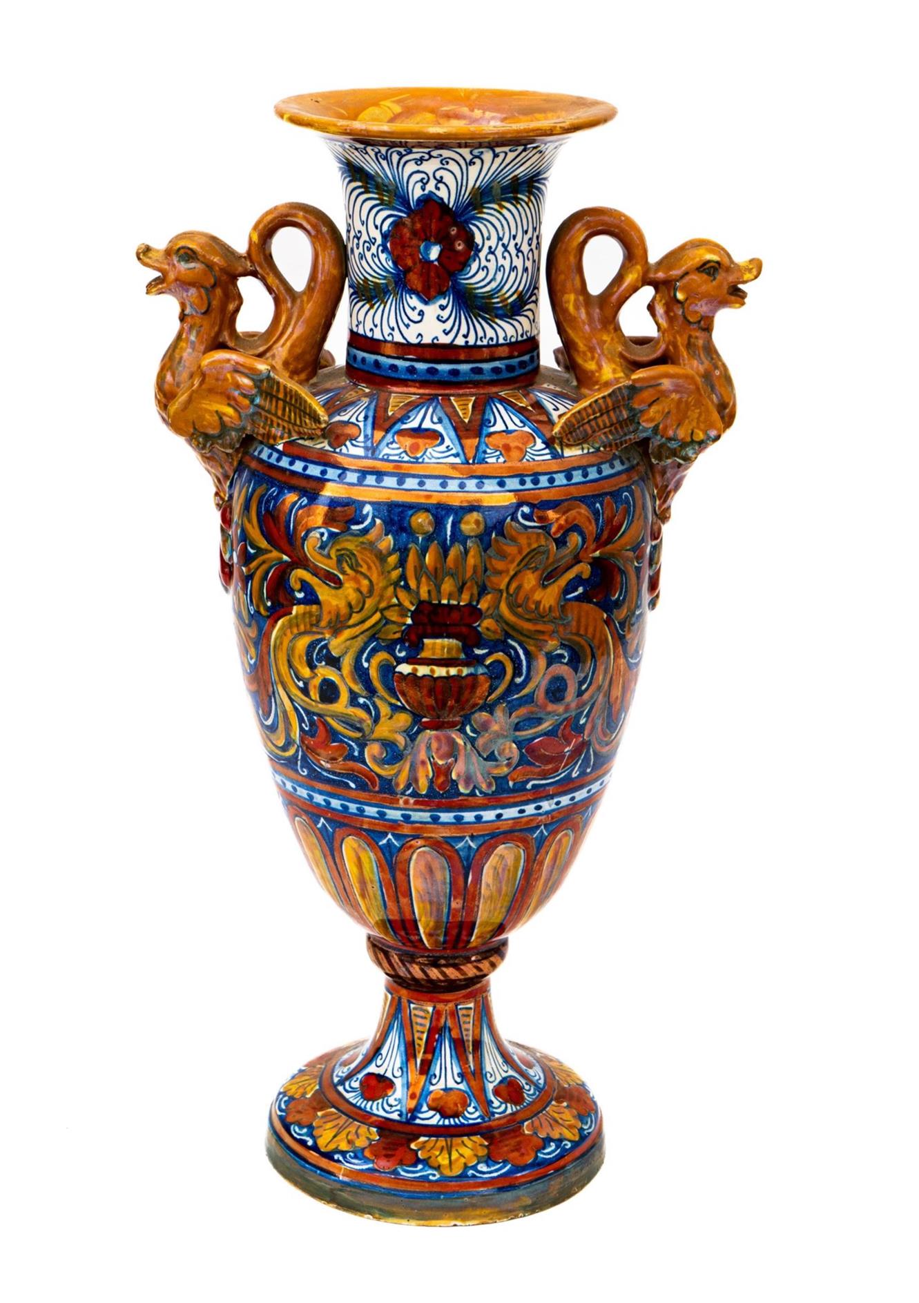 Anfora biansata in maiolia decorata a lustro metallico con anse a foggia di draghi alati. Al fronte e al retro anfora tra due animali fantastici