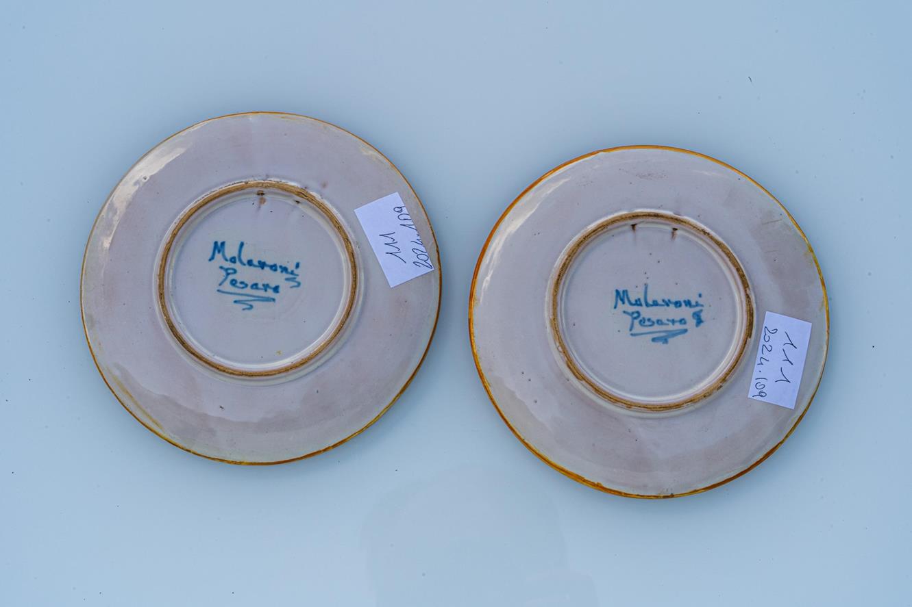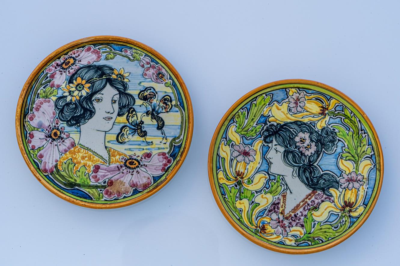 Coppia di piattini Art Nouveau con figure muliebri in serti di fiori e insetti. Manifattura Molaroni Pesaro degli anni Venti del XX secolo