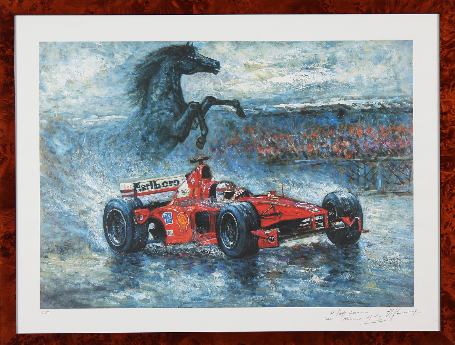 GONZAGA GIOVAN FRANCESCO (1921 - 2007) Ferrari. Litografia. Cm 79,00 x 59,00. 69/150. Tiratura a matita in basso a sinistra. Firma e dedica a matita in basso a destra. Cornice presente