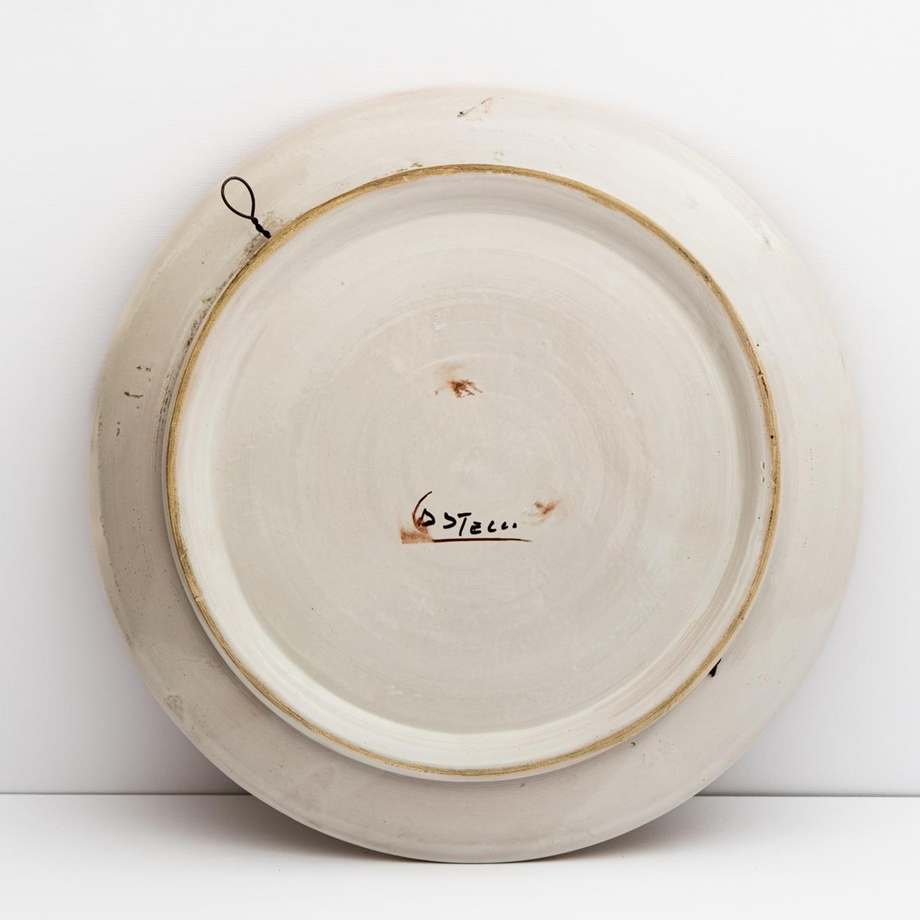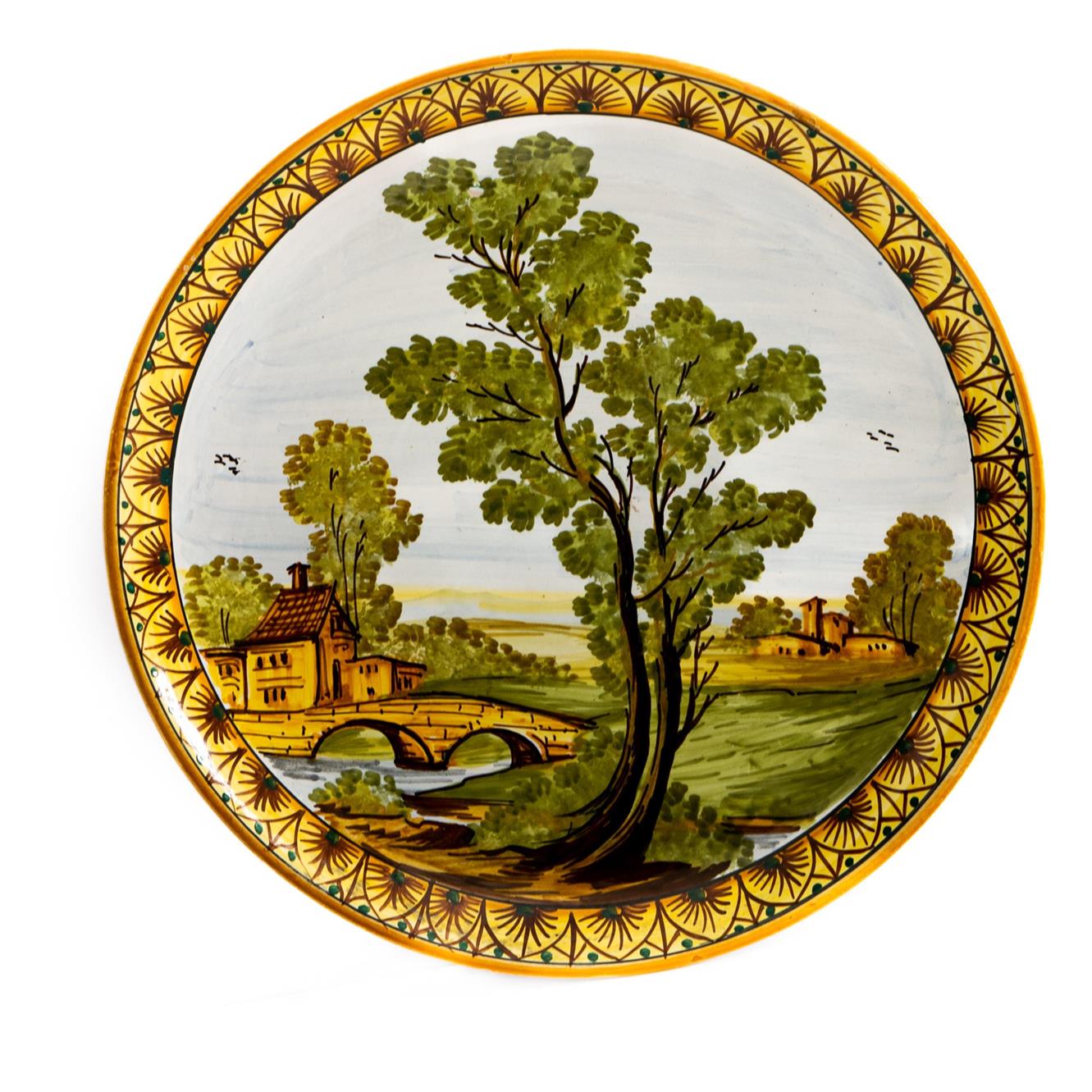 Piatto in maiolica decorato alla tesa con motivi fogliati alternati e nel cavo con ornato a paese Manifattura di Castelli della metà del XX secolo