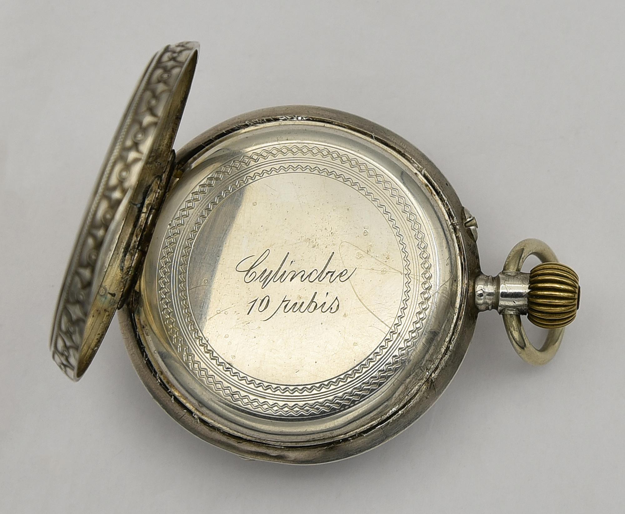 CASSA: in argento con doppio fondello lavorata a sbalzo e incisione; referenza, titolo e punzone (gallo) dell'argento visibili sulla superficie interna di entrambi i fondelli; sulla superficie esterna del fondello piu' interno inciso: "Cylindre/10 rubis"
