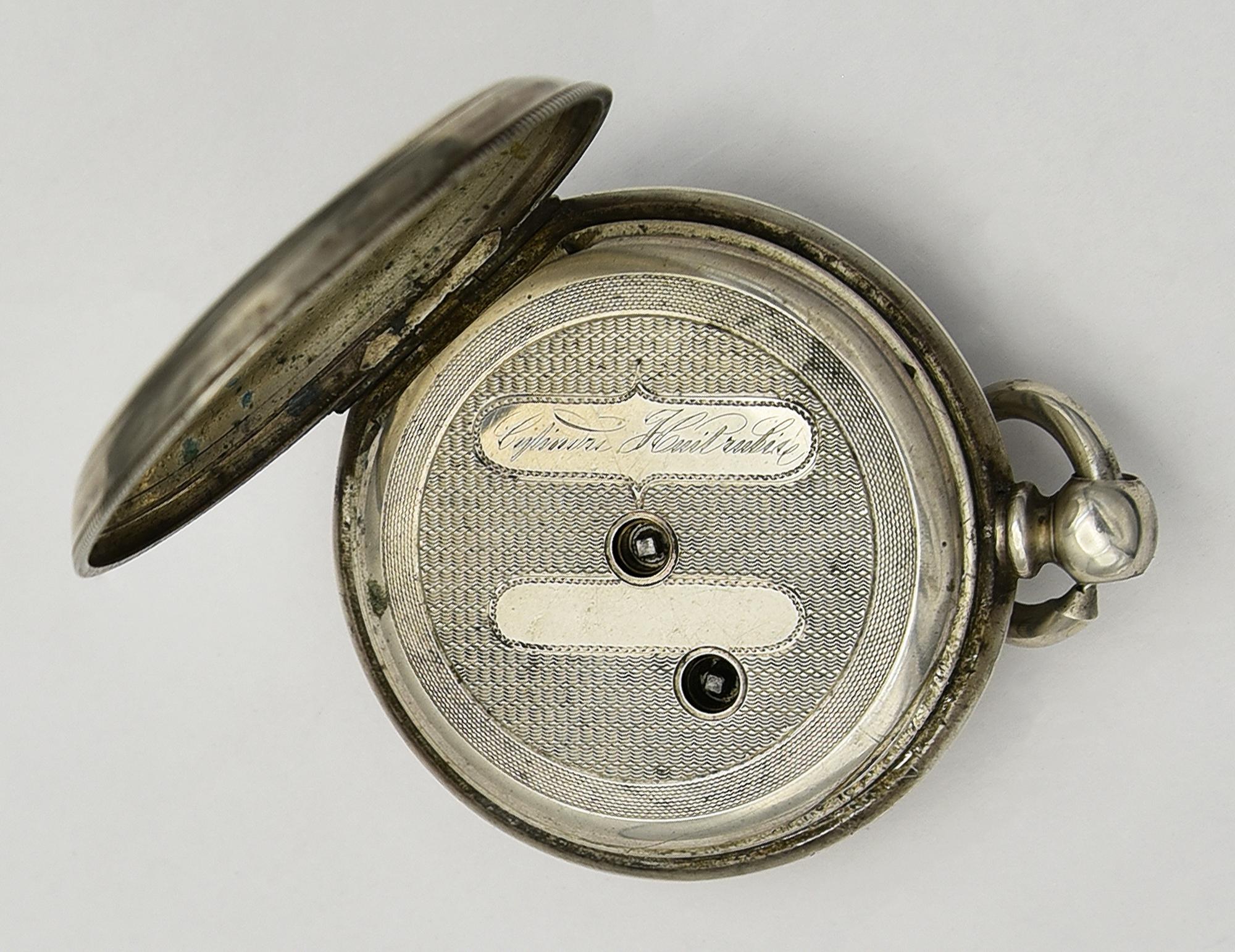 CASSA: in argento con doppio fondello lavorata sul retro a sbalzo e incisione; referenza e punzone dell'argento (granchio) visibili sulla superficie interna di entrambi i fondelli; sulla superficie esterna del fondello piu' interno inciso: "Cylindre Huit rubis"