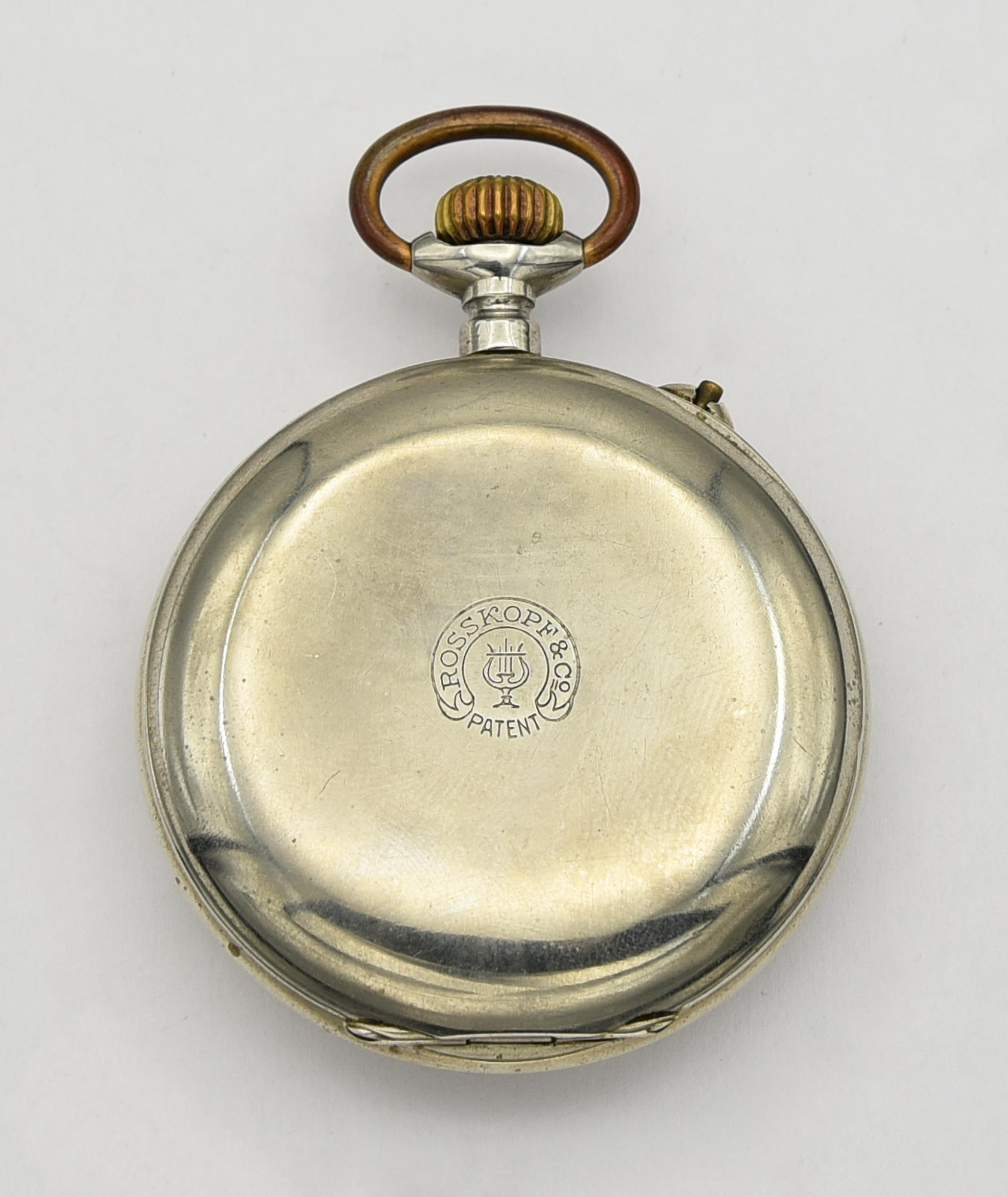 CASSA: in acciaio a doppio fondello; sulla superficie esterna del fondello piu' interno inciso: "Grand prix paris 1904", "Budapest 1903/Parigi 1904/Londra 1903/Berlino 1901", "Rosskopf&Co", "Medailles d'or".