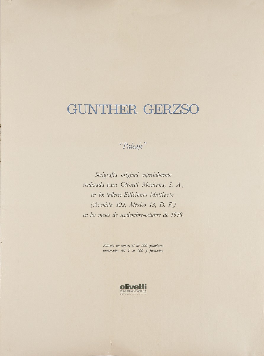 GERSZO GUNTHER (1915 - 2000) Paisaje. 1978. Portfolio.. Cm 73,00 x 55,00. Tiratura 42/200. Cartella contente una serigrafia realizzata per Olivetti Mexicana S.A. completa di colophon e confezione (leggermente danneggiata) originale.