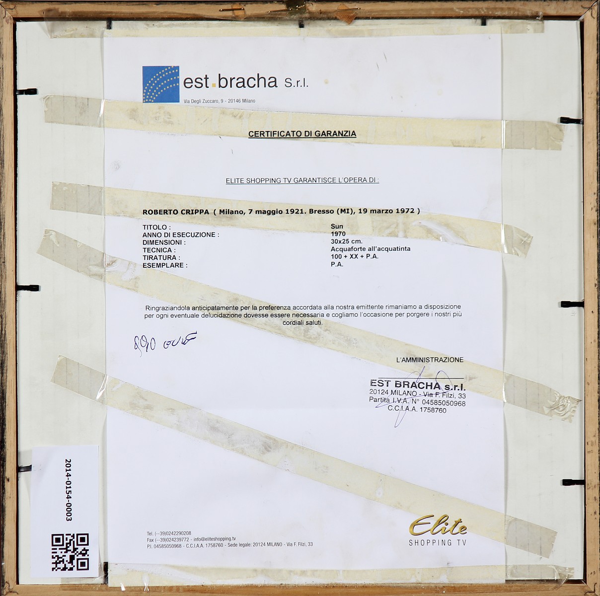 CRIPPA ROBERTO GAETANO (1921 - 1972) Sun. Acquaforte, acquatinta. Cm 25,00 x 30,00. Prova d'autore a matita in basso a destra. Firma a matita in basso a sinistra. Certificato di garanzia Elite Shopping Tv come da documentazione allegata all'opera e posta al retro. Cornice presente