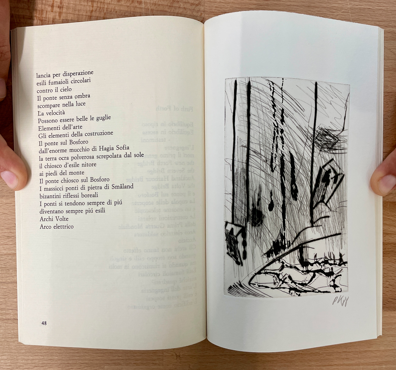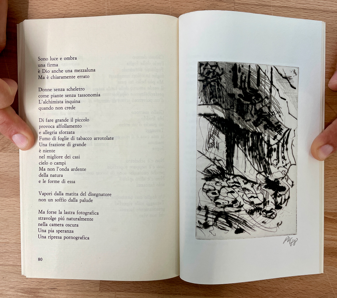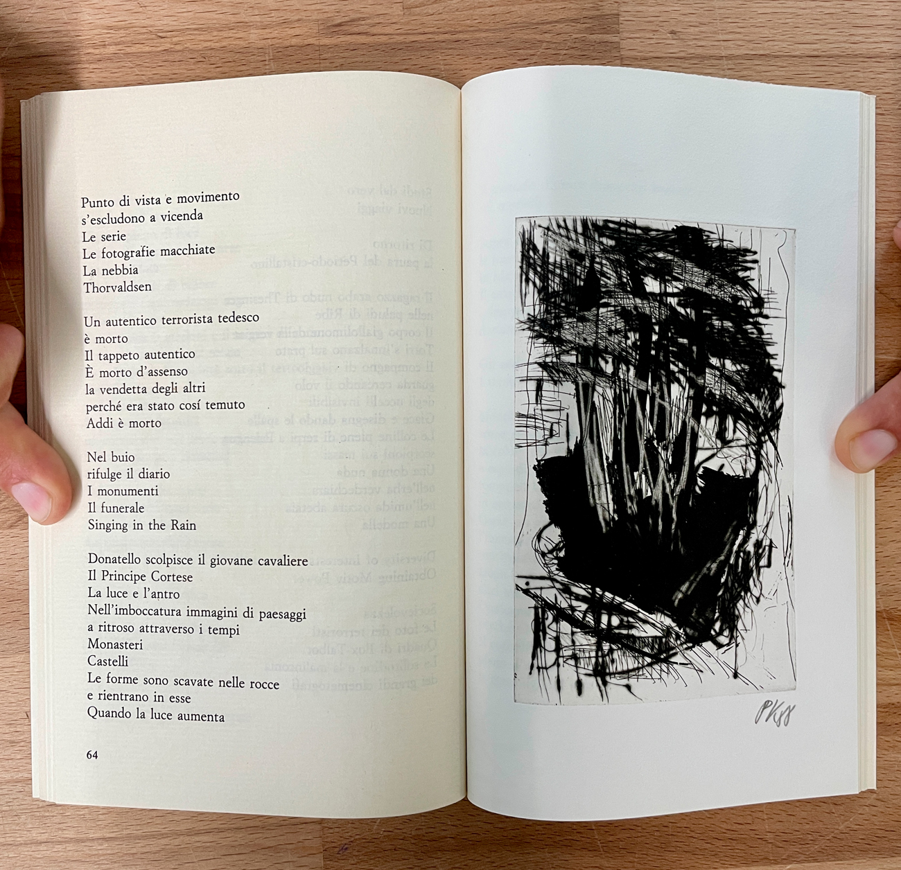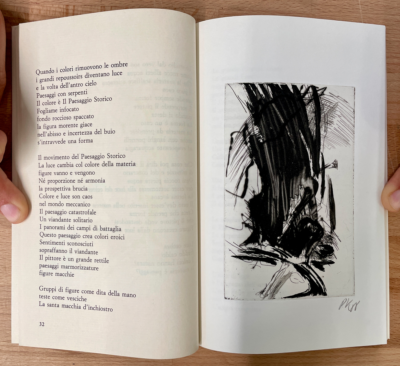 Catalogo riccamente illustrato, edito per la collana 'Poesie' diretta da Demetrio Paparoni, contenente all'interno 4 grafiche incisioni originali di Per Kirkeby, ciascuna recante sigla dell'Artista e datazione (1988) a matita al fronte