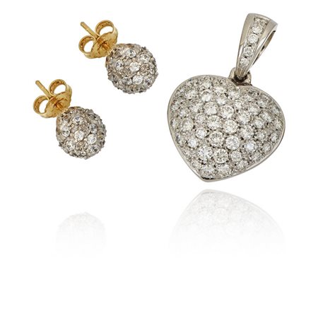 Parure in oro bianco composta da ciondolo a forma di cuore interamente tempestato di piccoli diamanti taglio brillante per ct. 2 50 ca e orecchini a sfera con piccoli zirconi.