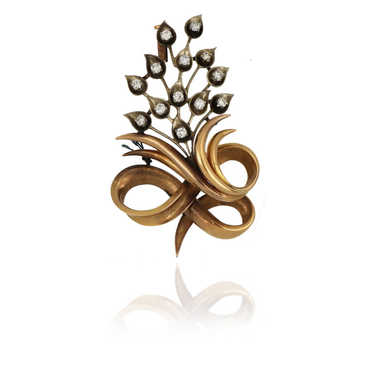 Spilla im oro anni 40 a guisa di fiore con diamanti incassati nei fiori.