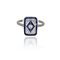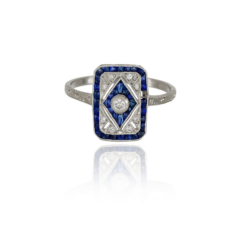 Anello stile decò in oro bianco con fine incassatura e lavorazione milligranata diamanti e zaffiri carrè e french cut. Gambo inciso