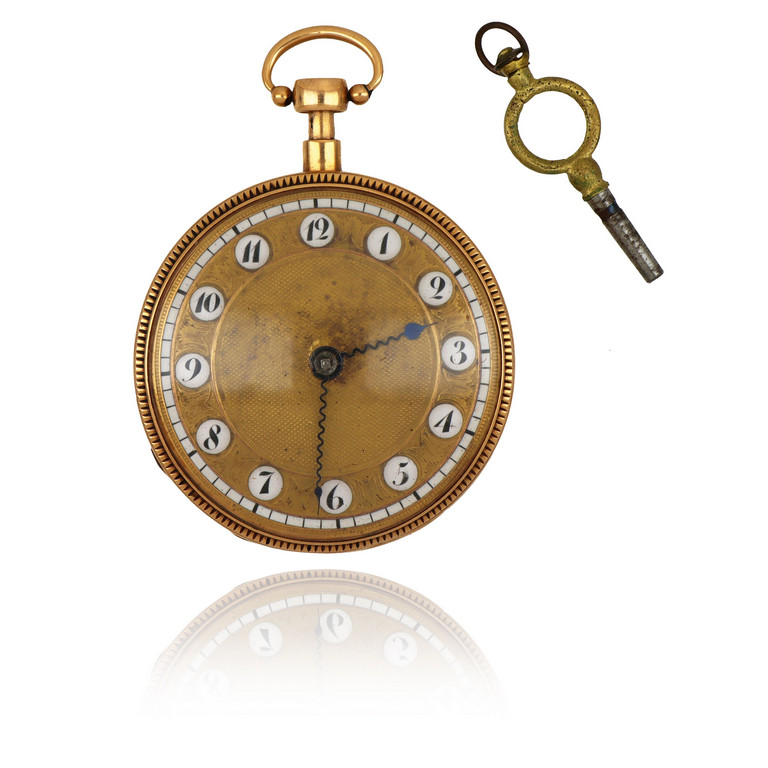 VACHERON CHOSSAT & C. Raro orologio da tasca in oro Ginevra primi anni del XIX secolo (1816-1817). Movimento n° 9541. Suoneria ripetizioni ore e quarti quadrante con indici arabi su cerchio ceramico fondo oro godronato particolari sfere Roskell ondulate retro cassa smaltato ed inciso.