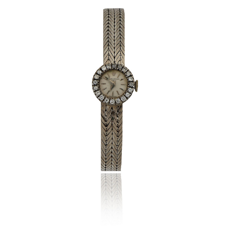 Baume & Mercier piccolo orologio gioiello per signora in oro bianco e diamanti con bracciale integrato movimento meccanico a carica manuale.