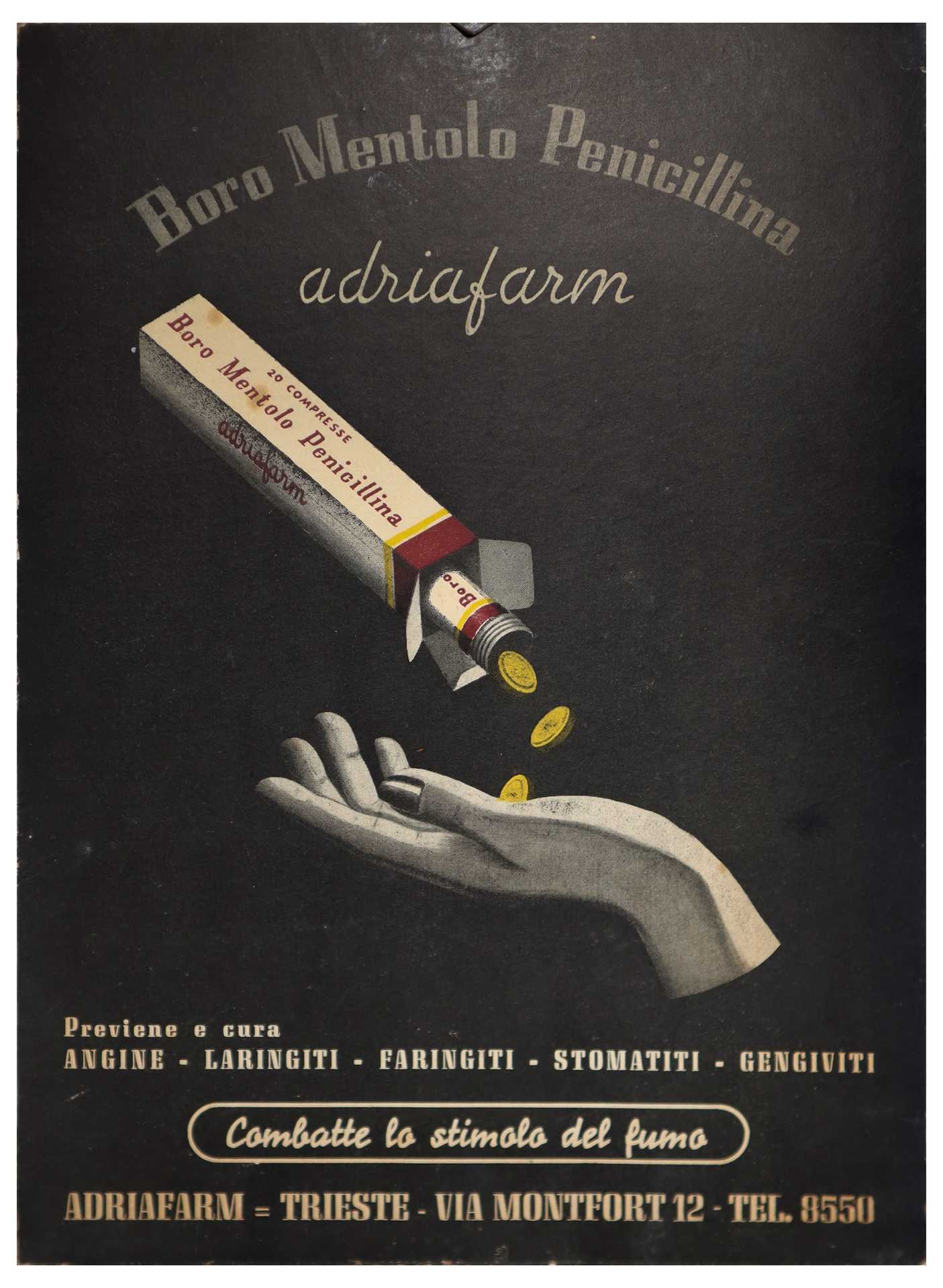 Locandina da banco per compresse Boro Mentolo Penicilina, 1940s/1950s cm 32x23 Articolo promozionale farmacia Adriafarm, Trieste. Presenti normali segni del tempoArticolo promozionale farmacia Adriafarm, Trieste. Presenti normali segni del tempo