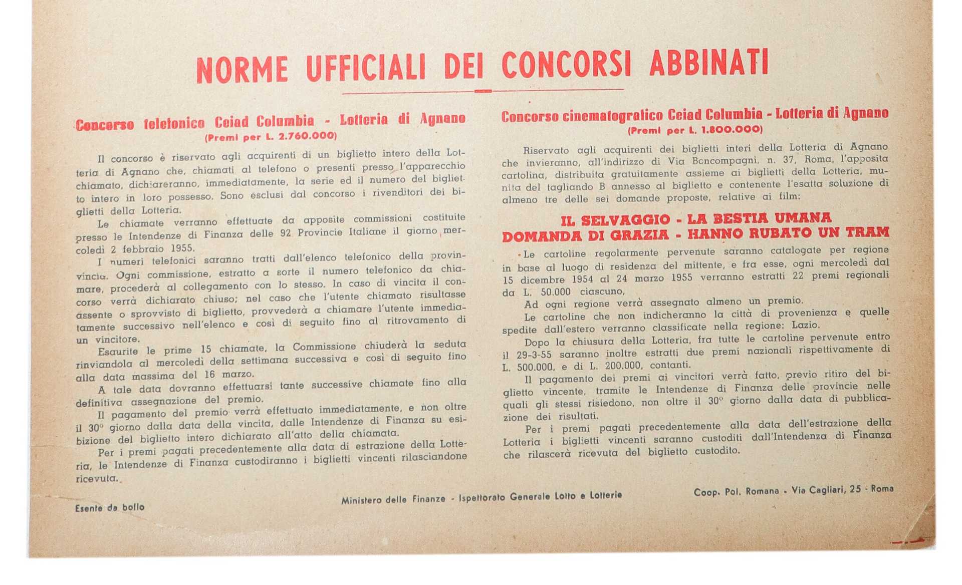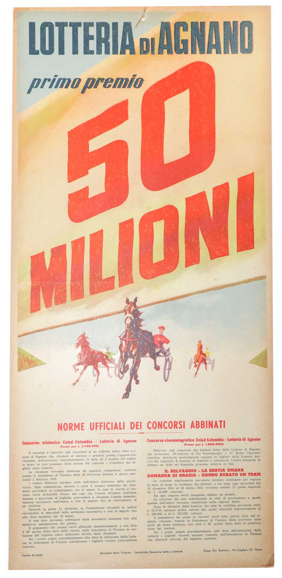 Lotto 52 | Locandina Cartonata Lotteria di Agnano, 1954