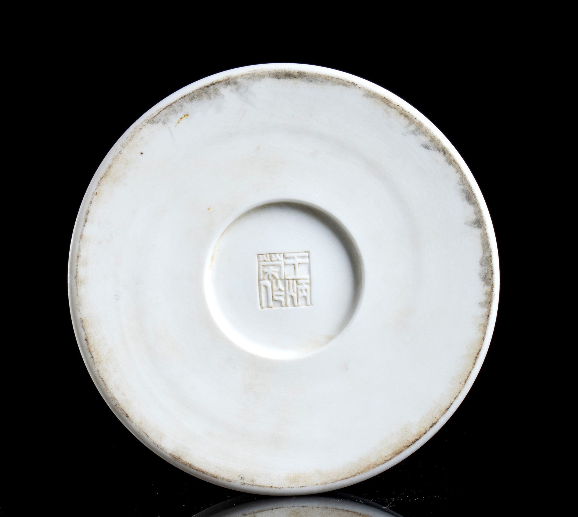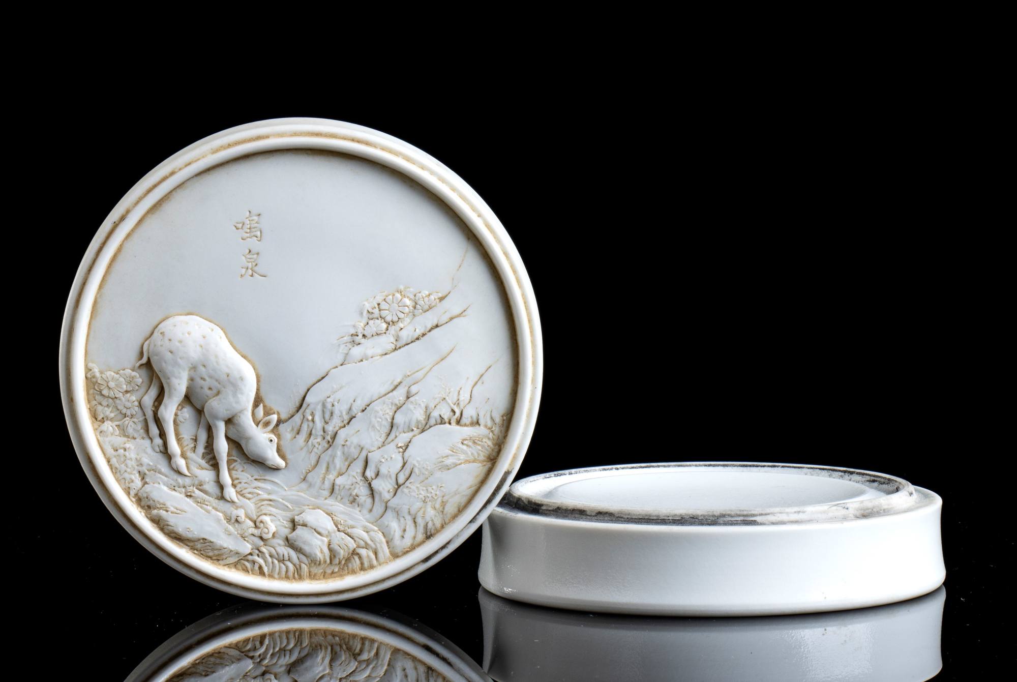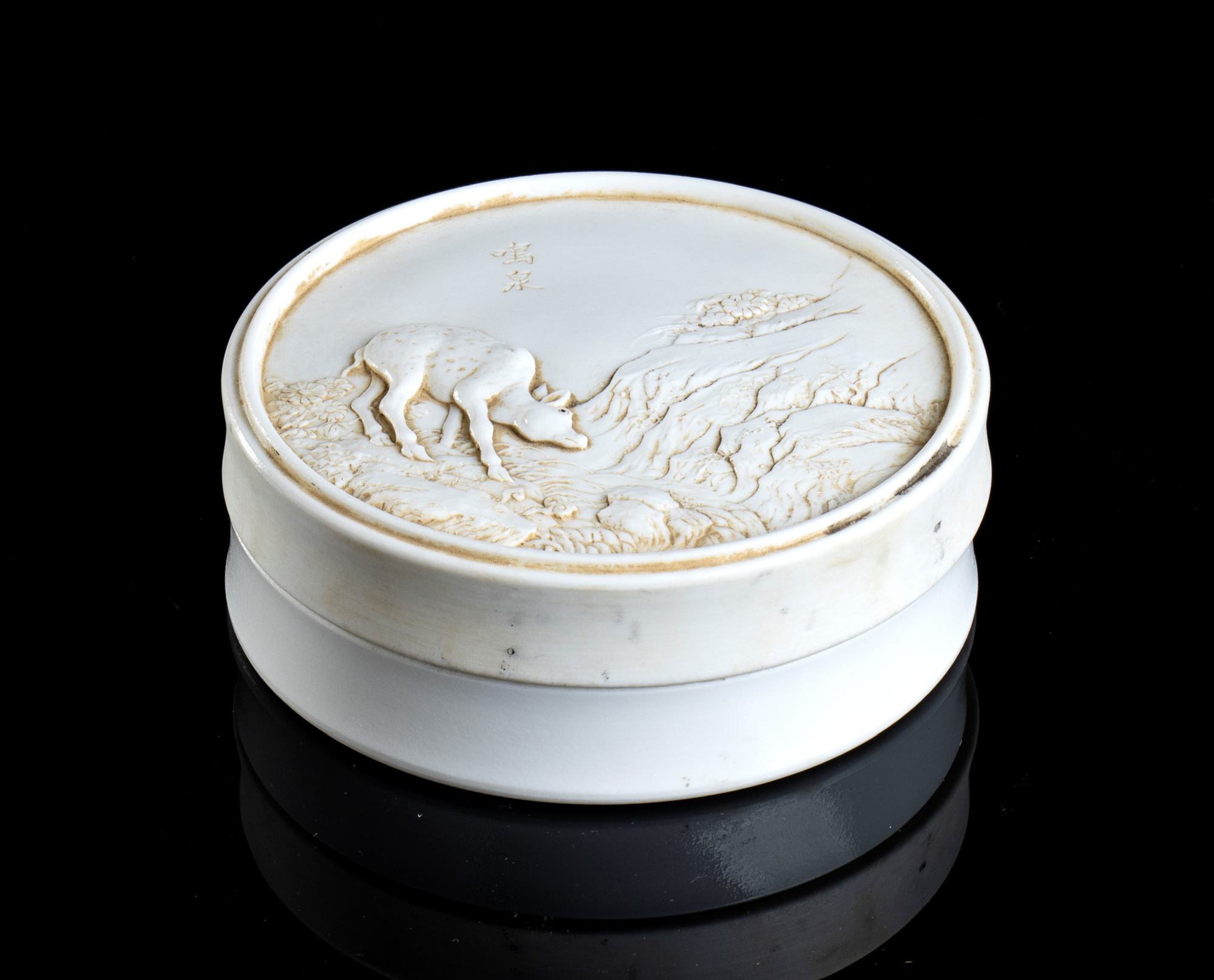 Di forma circolare, mostra sul lato superiore del coperchio una scena con un daino nel paesaggio; iscrizione 鸣泉 (ming quan, “Il mormorio della sorgente” in alto a destra; marchio 王炳荣制 (wang bing rong zhi, “Realizzata da Wang Bing Rong” al centro della base.
