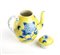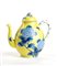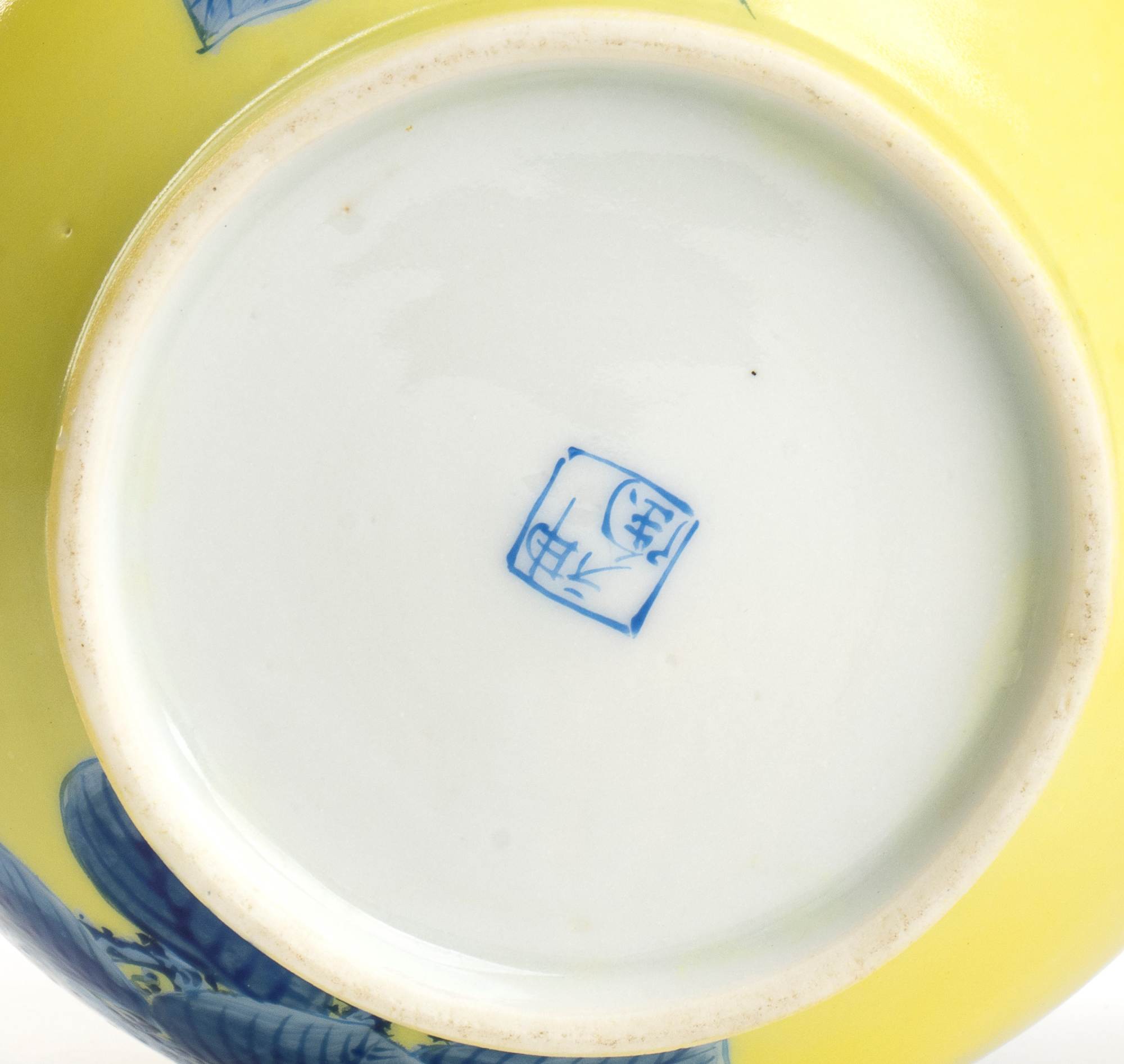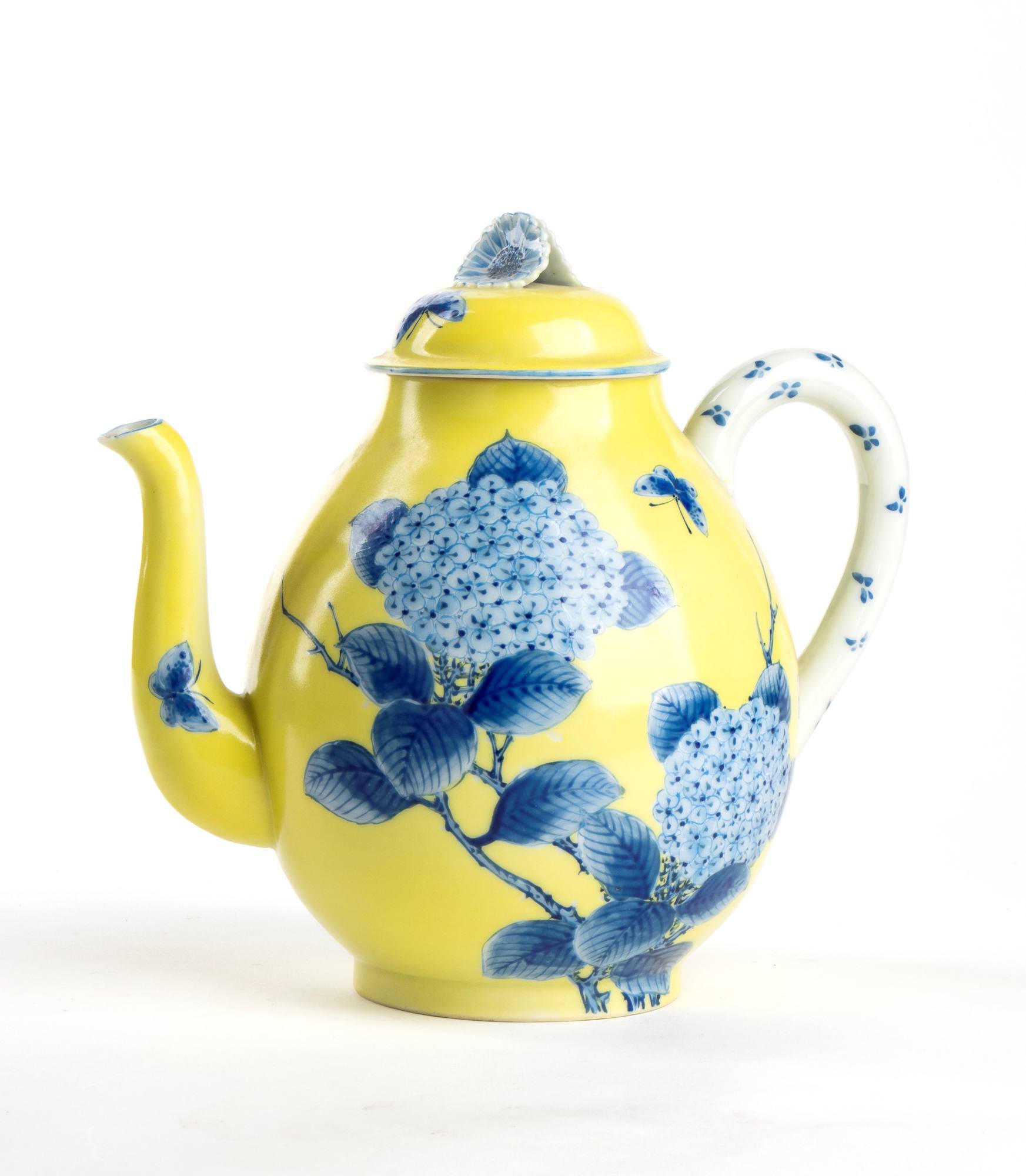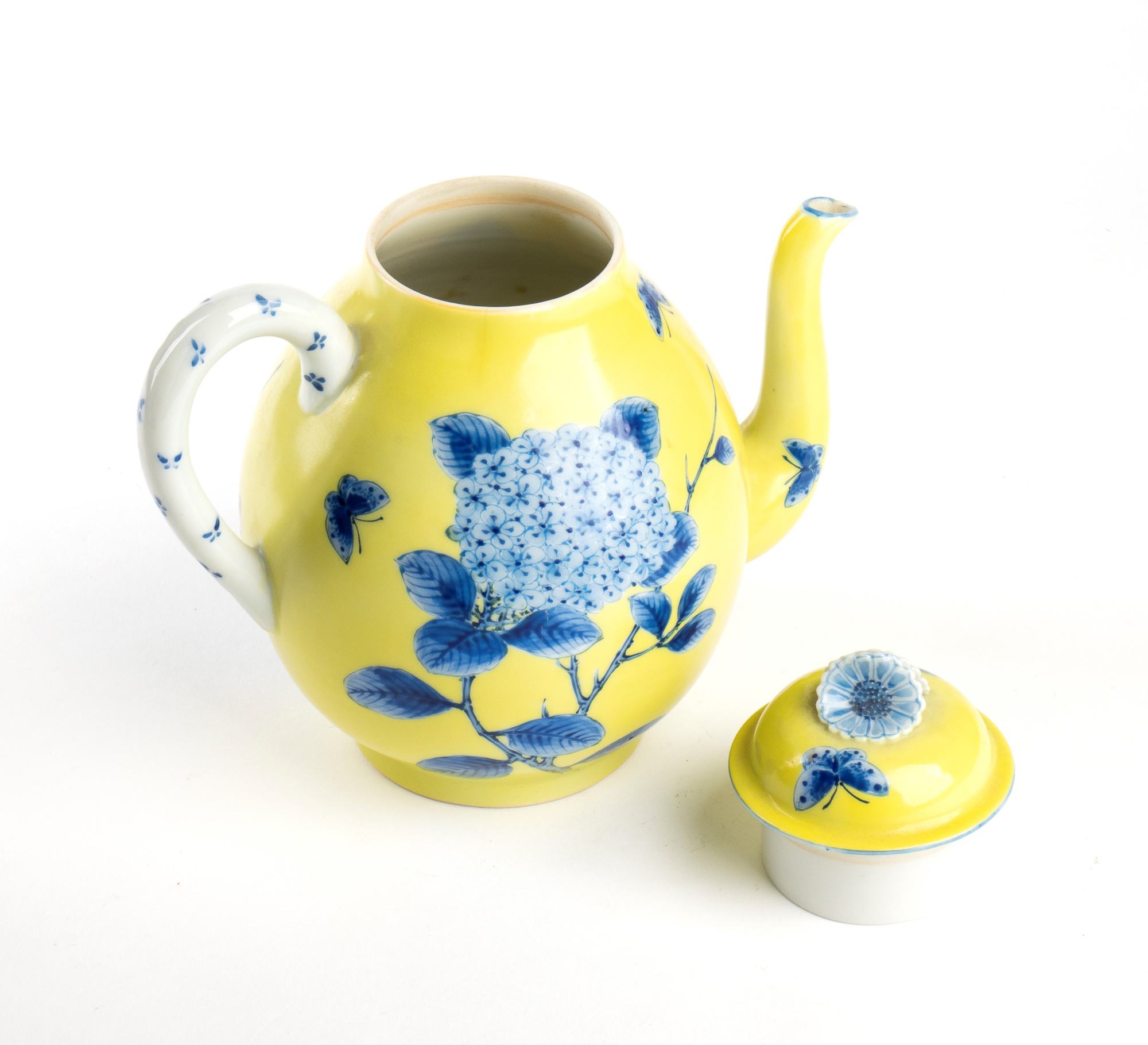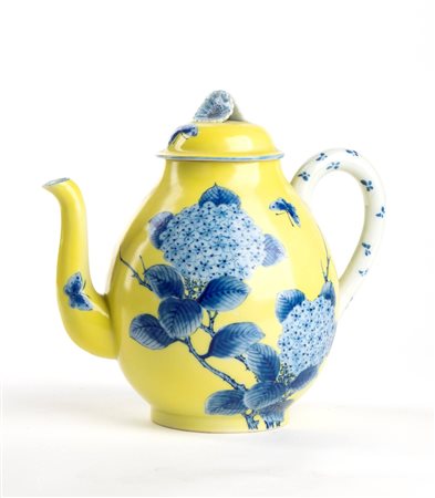 Decoro di fiori e farfalle in blu di cobalto sotto invetriatura a riserva su fondo giallo, la presa del coperchio modellata come due corolle di crisantemo, marchio in rosso sul corpo e marchio al centro della base.