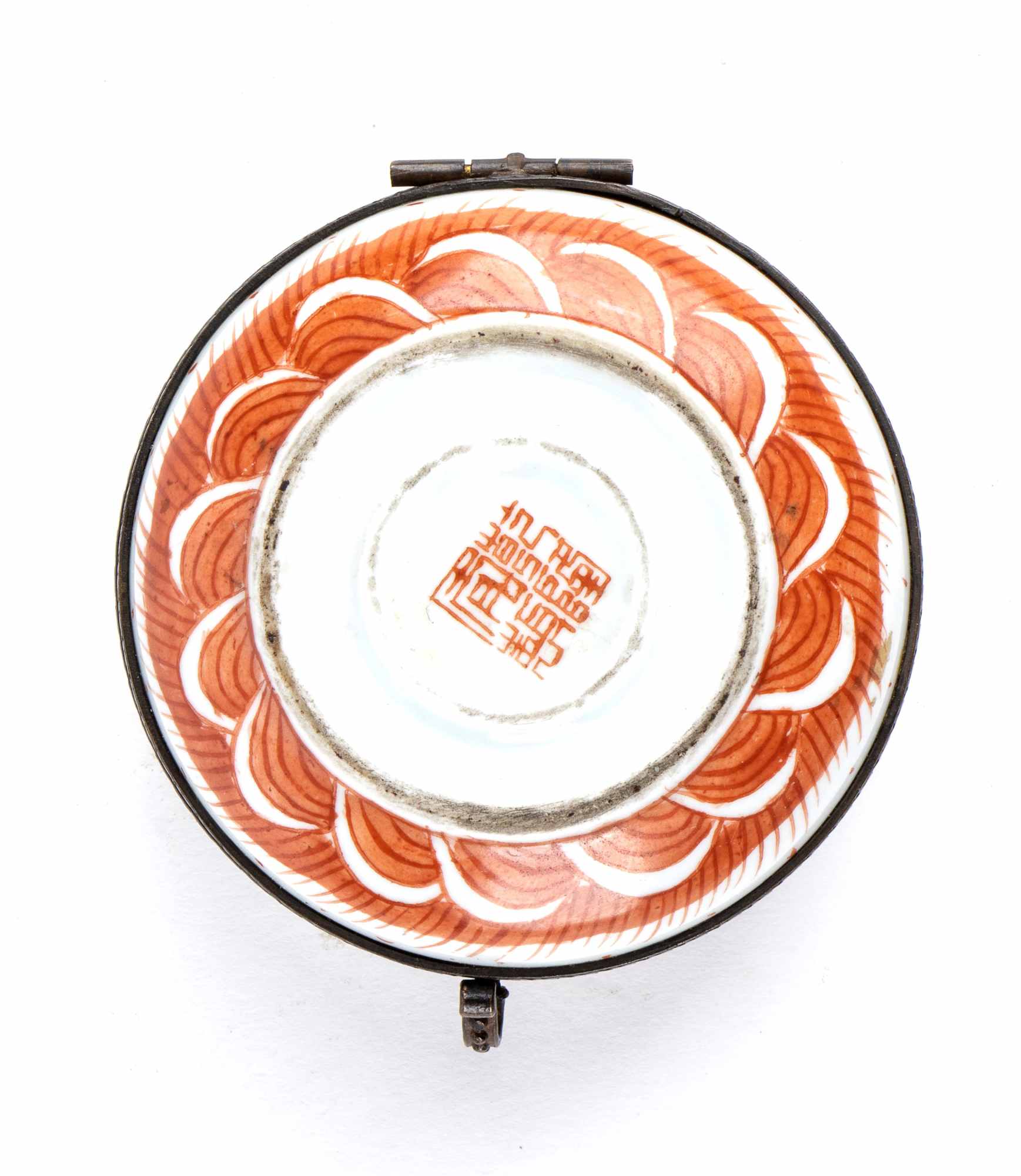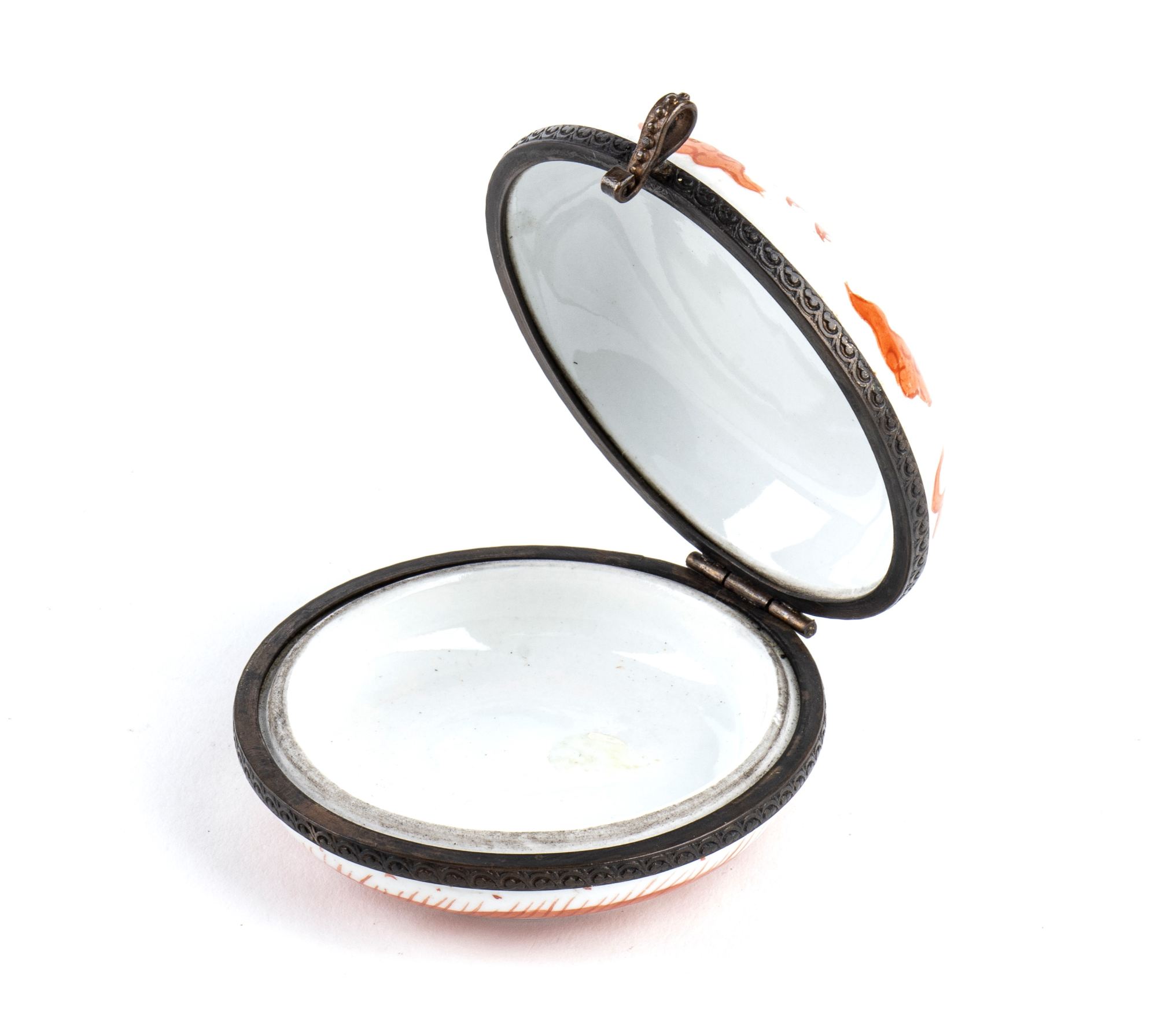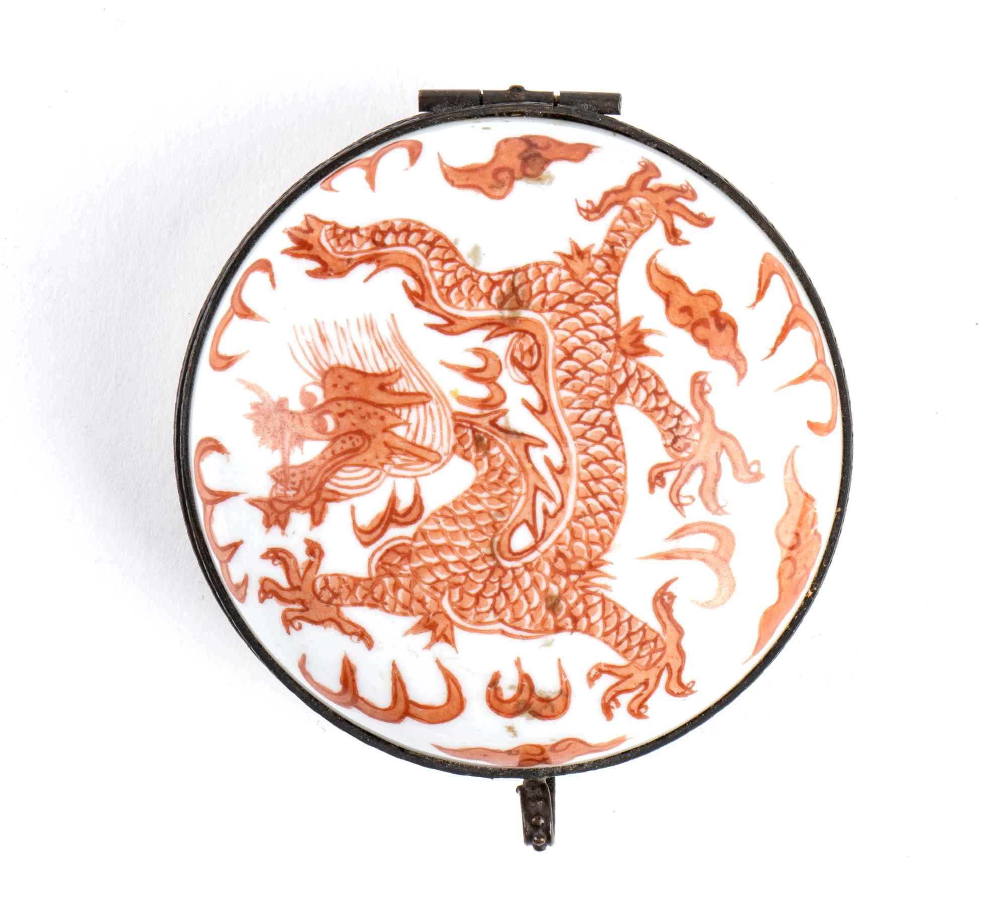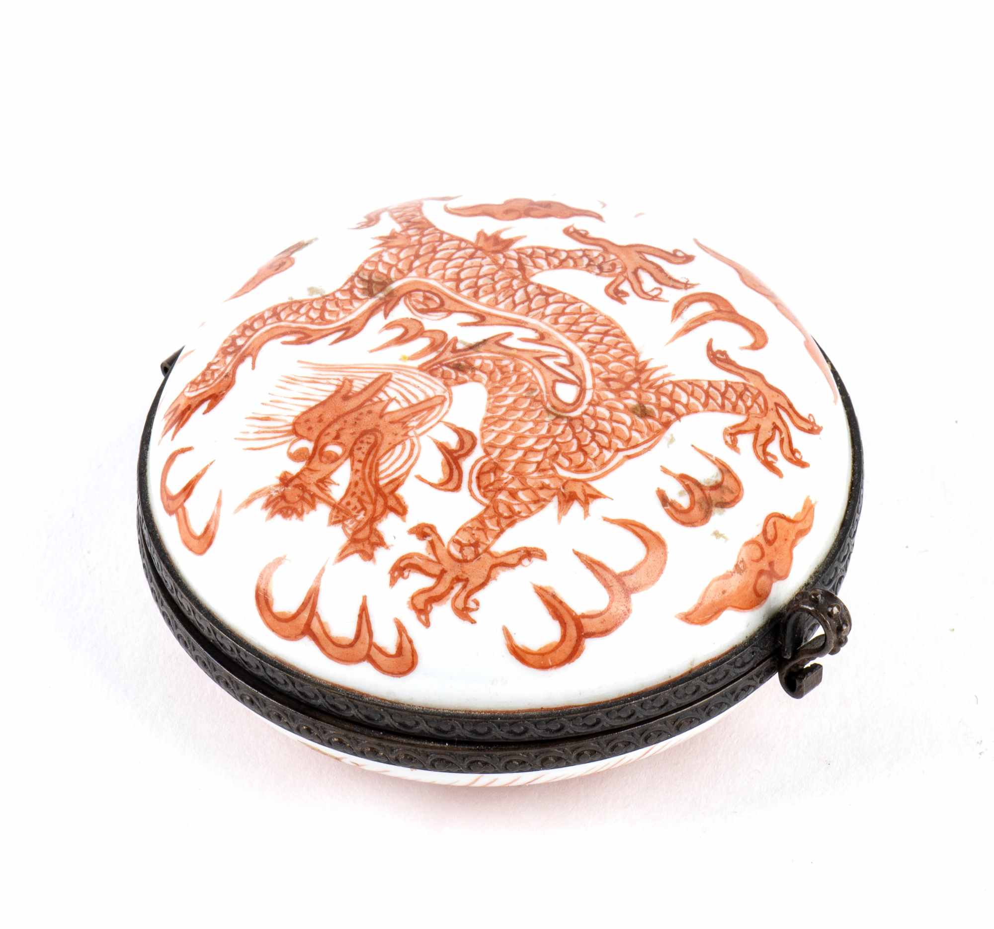 PICCOLA SCATOLA IN PORCELLANA CON DECORO DI DRAGHI IN ROSSO DI FERRO E MONTATURA IN METALLO