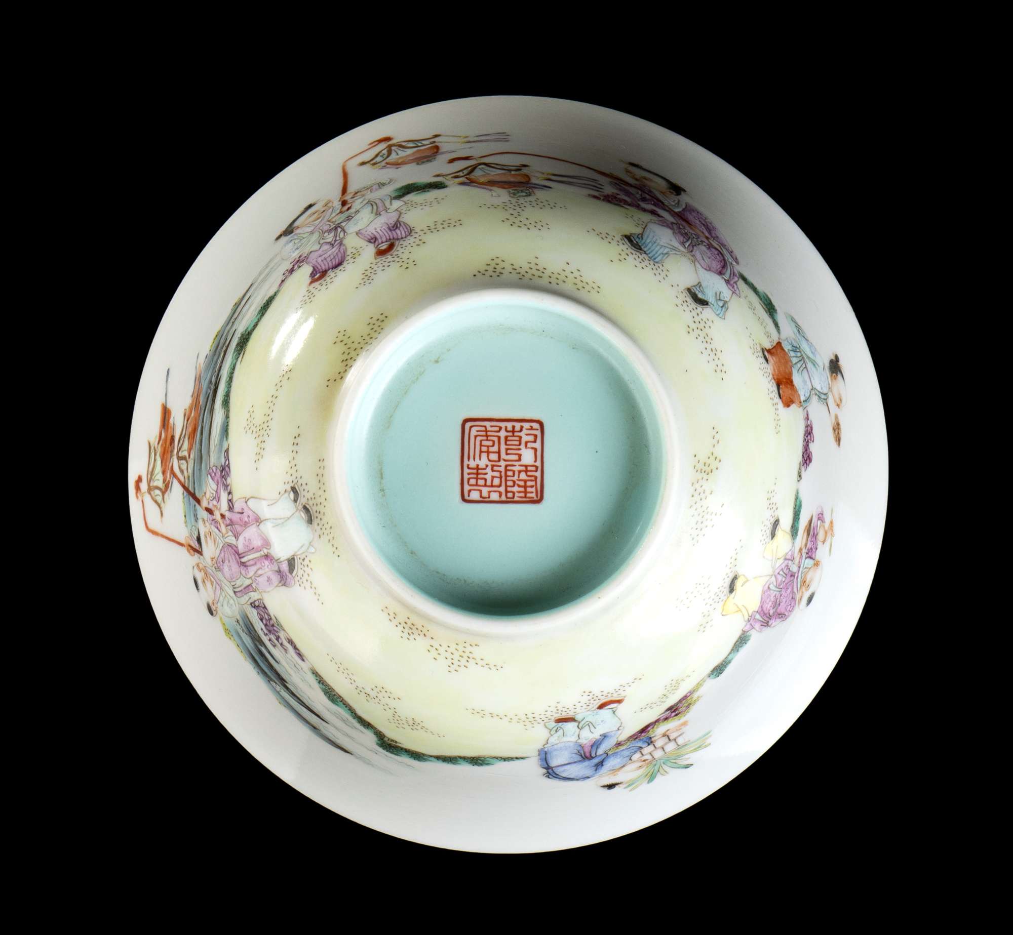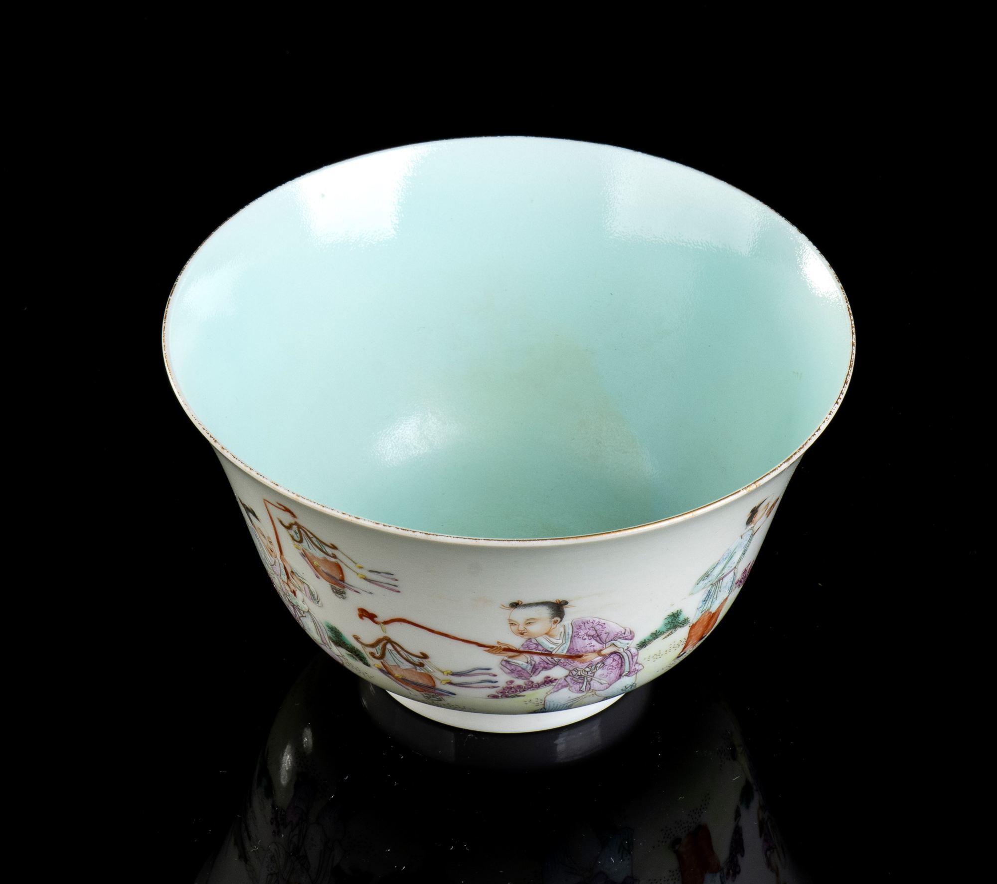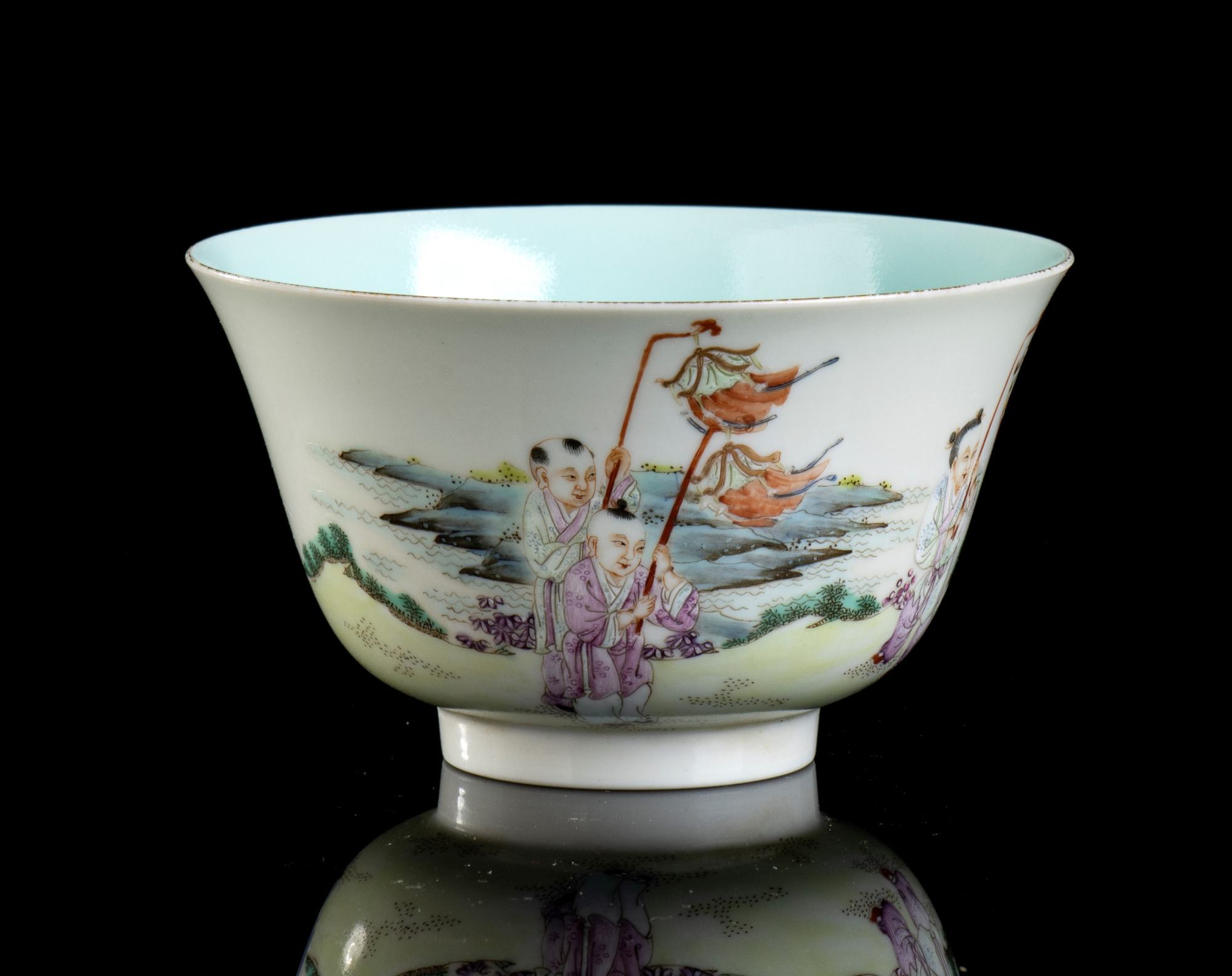 Sull'esterno una scena con bambini, marchio apocrifo di Qianlong al centro della base.