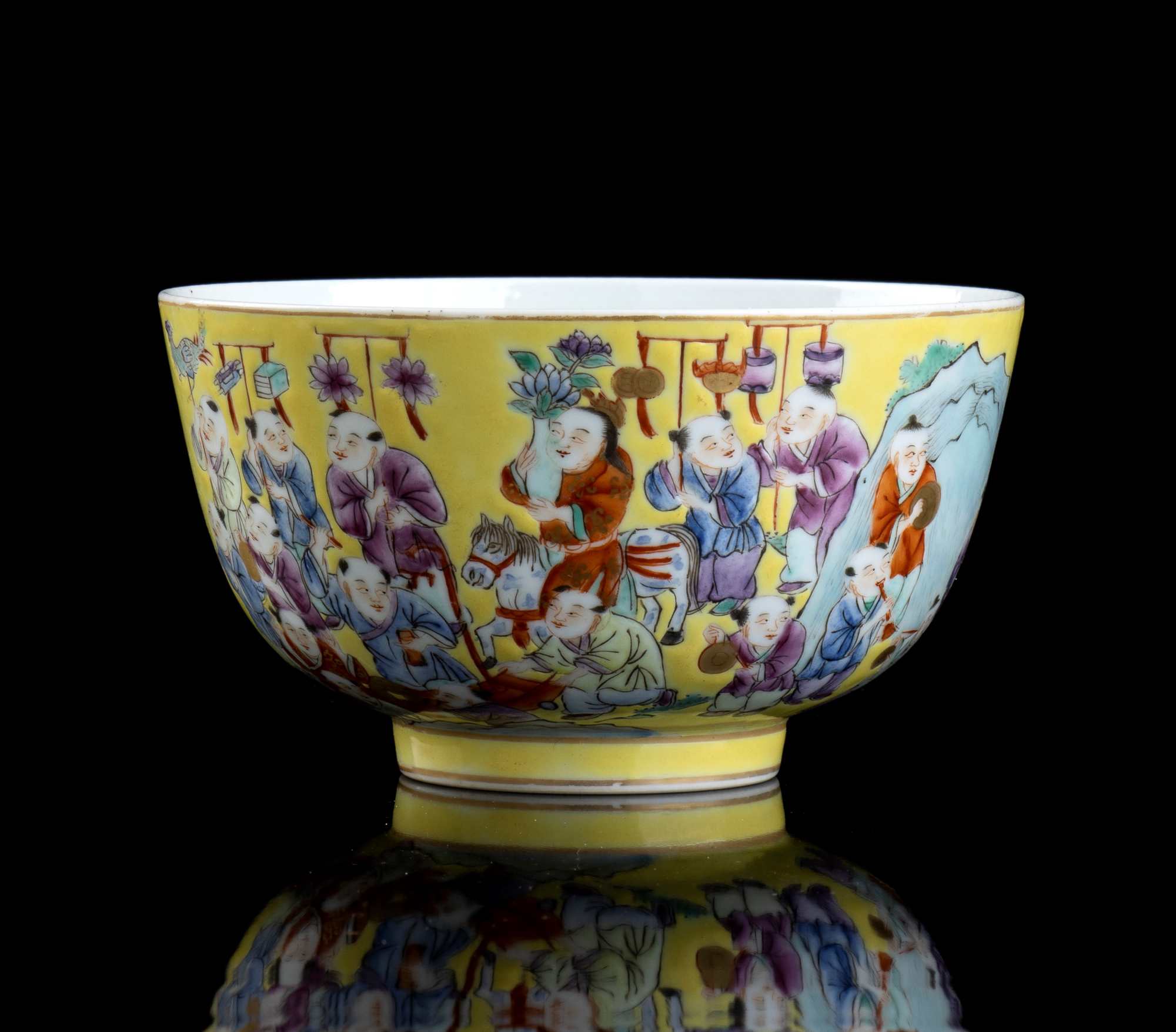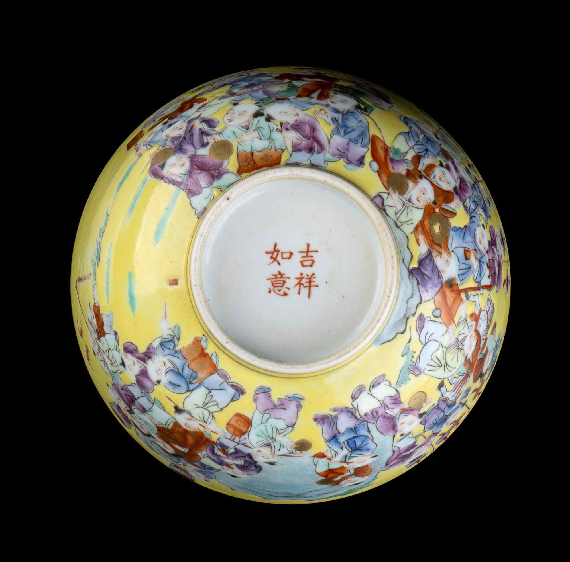 Decoro di bambini su fondo giallo, marchio 吉祥如意 (Ji Xiang Ru Yi) al centro della base.