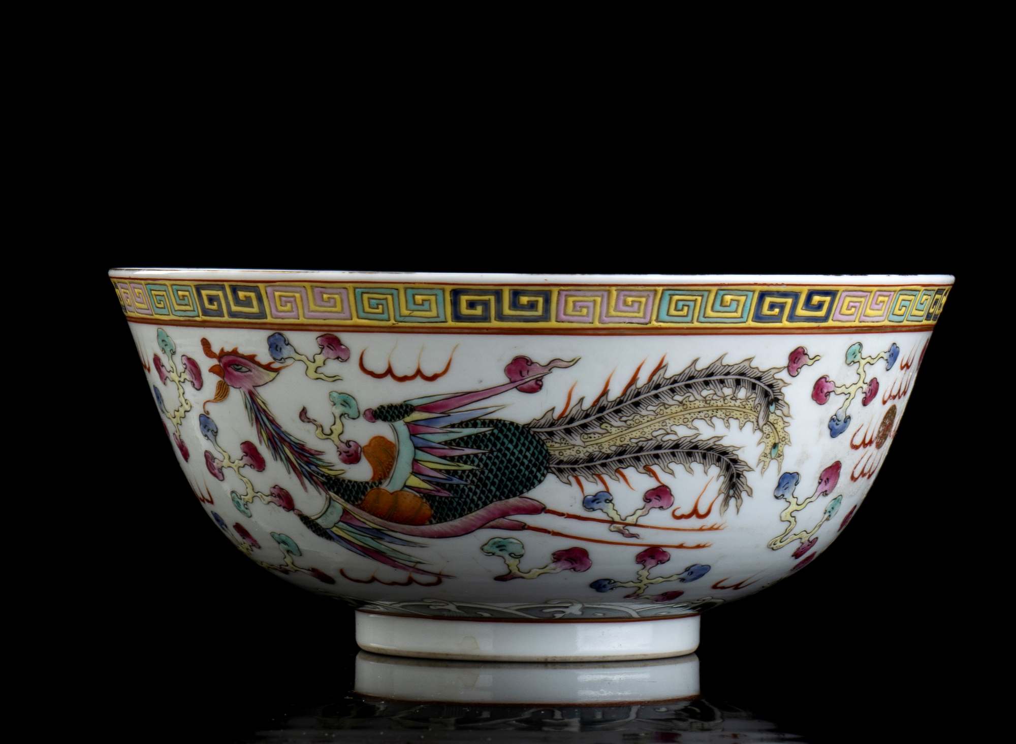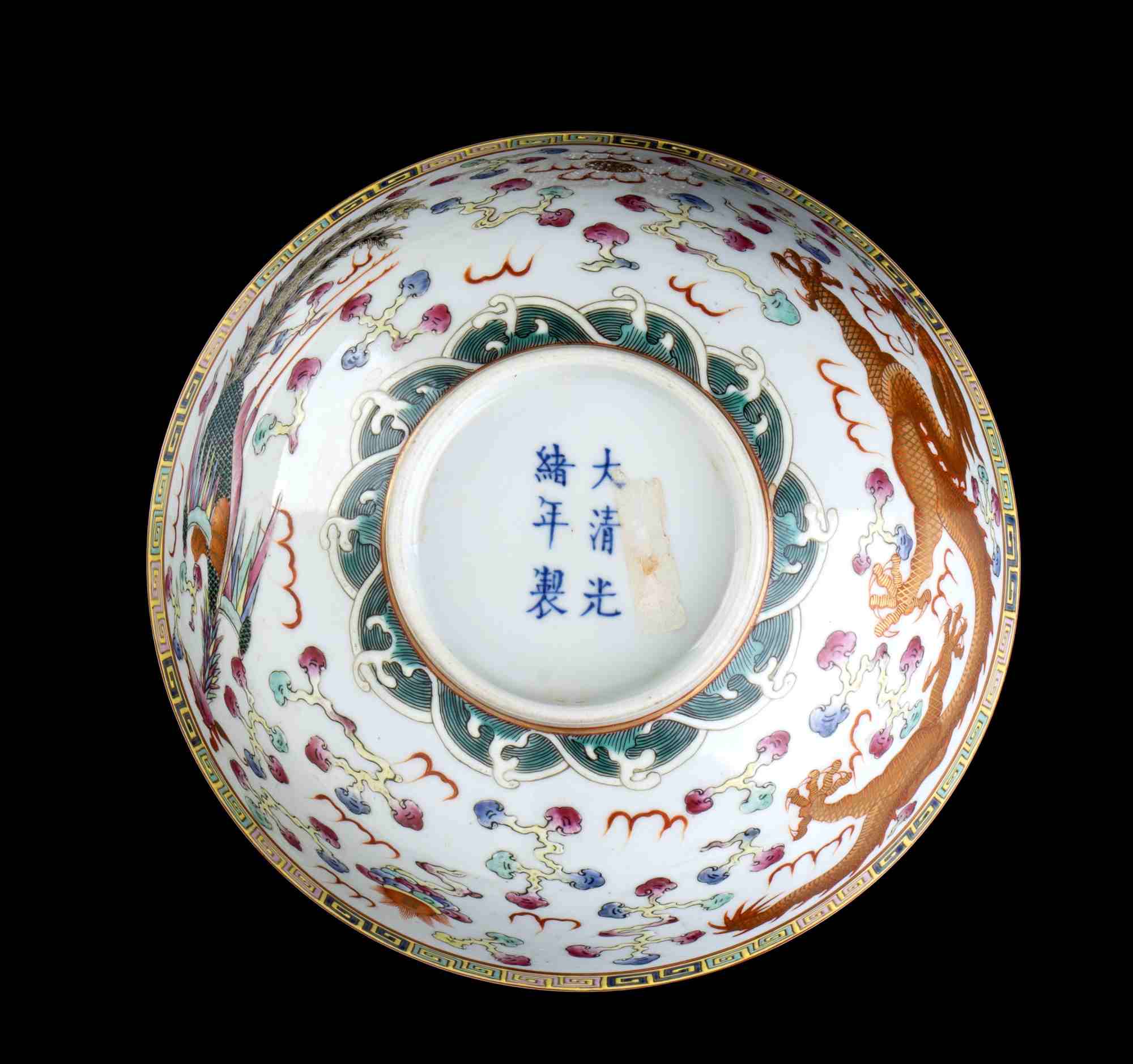 Sull'esterno decoro di drago e fenice in volo tra nuvole stilizzate, marchio Guangxu al centro della base.