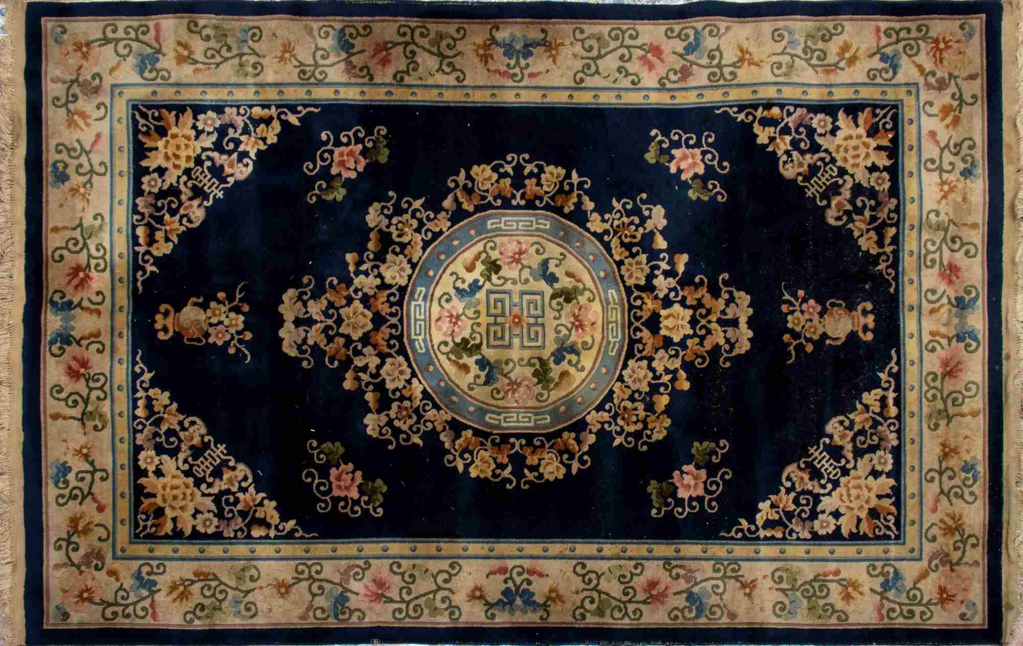 Fondo blu e ocra, al centro un medaglione circolare intorno al quale si dispongono composizioni floreali in policromia.