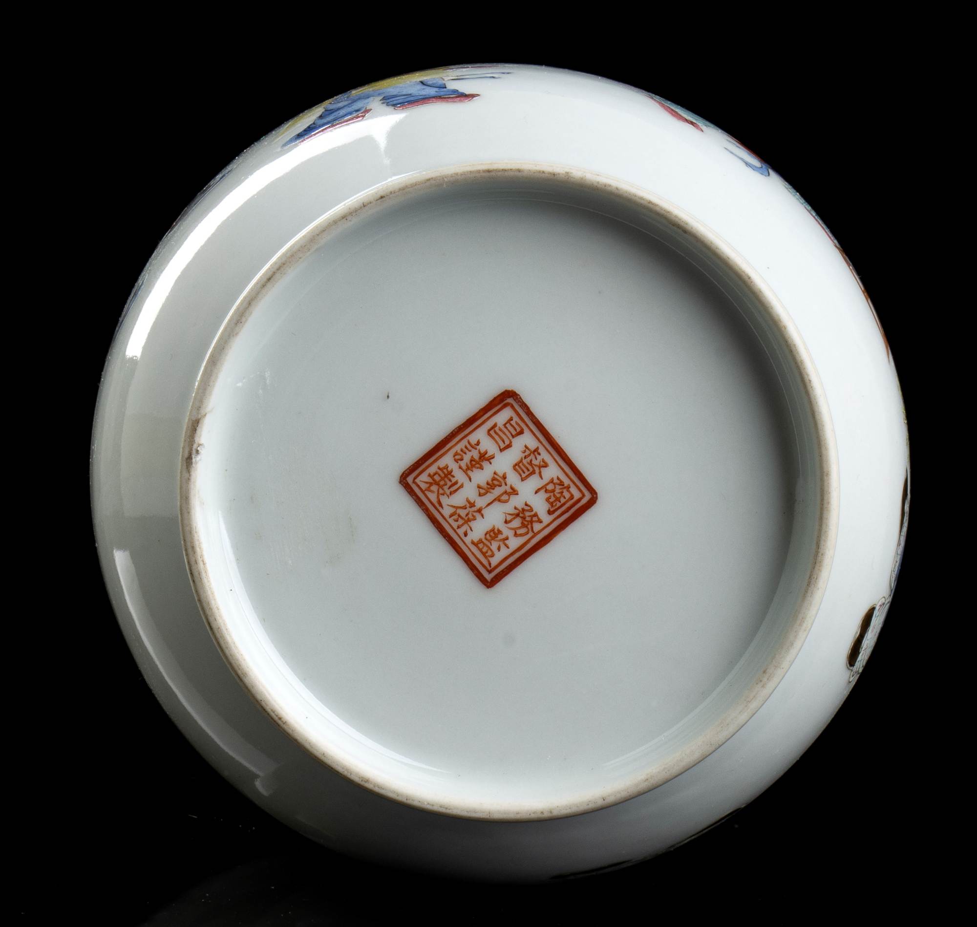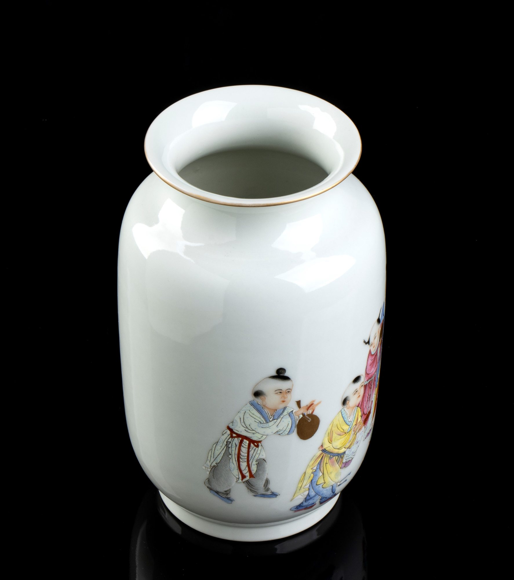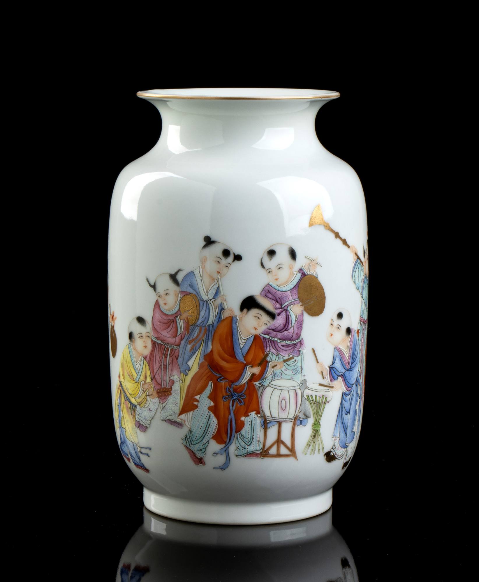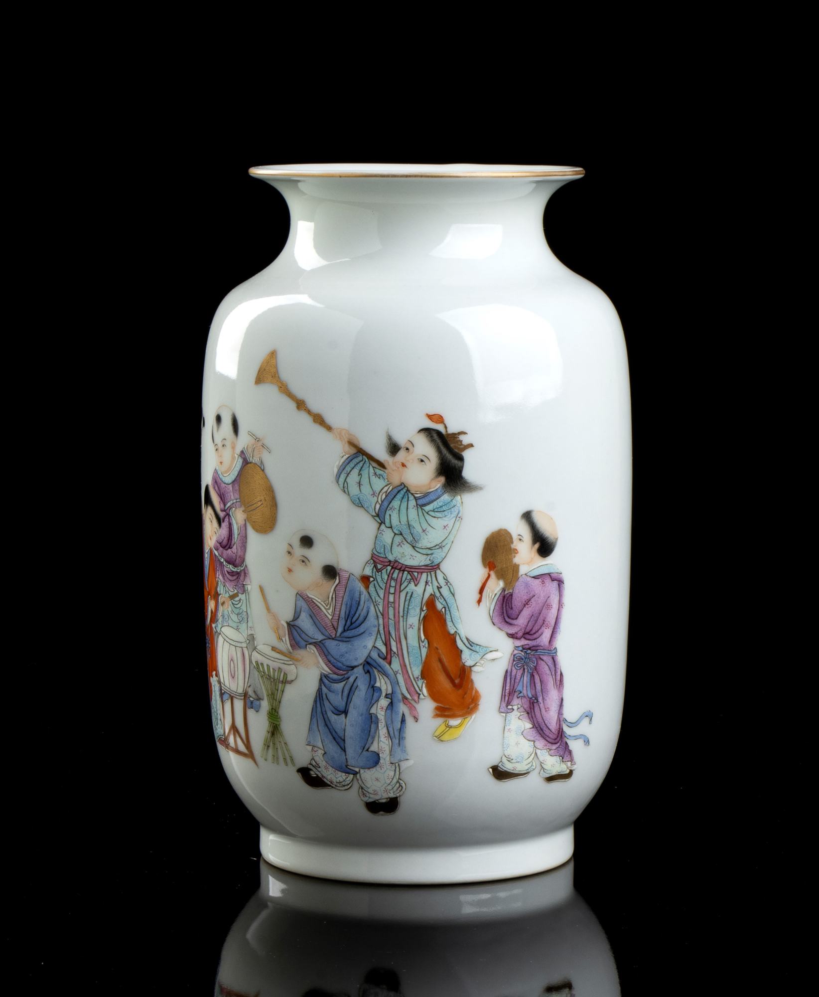 La fine decorazione consiste di bambini intenti a suonare, marchio 陶务监督郭葆昌谨制 (Taowu Jiandu Guo Baochang Jingzhi) al centro della base.