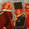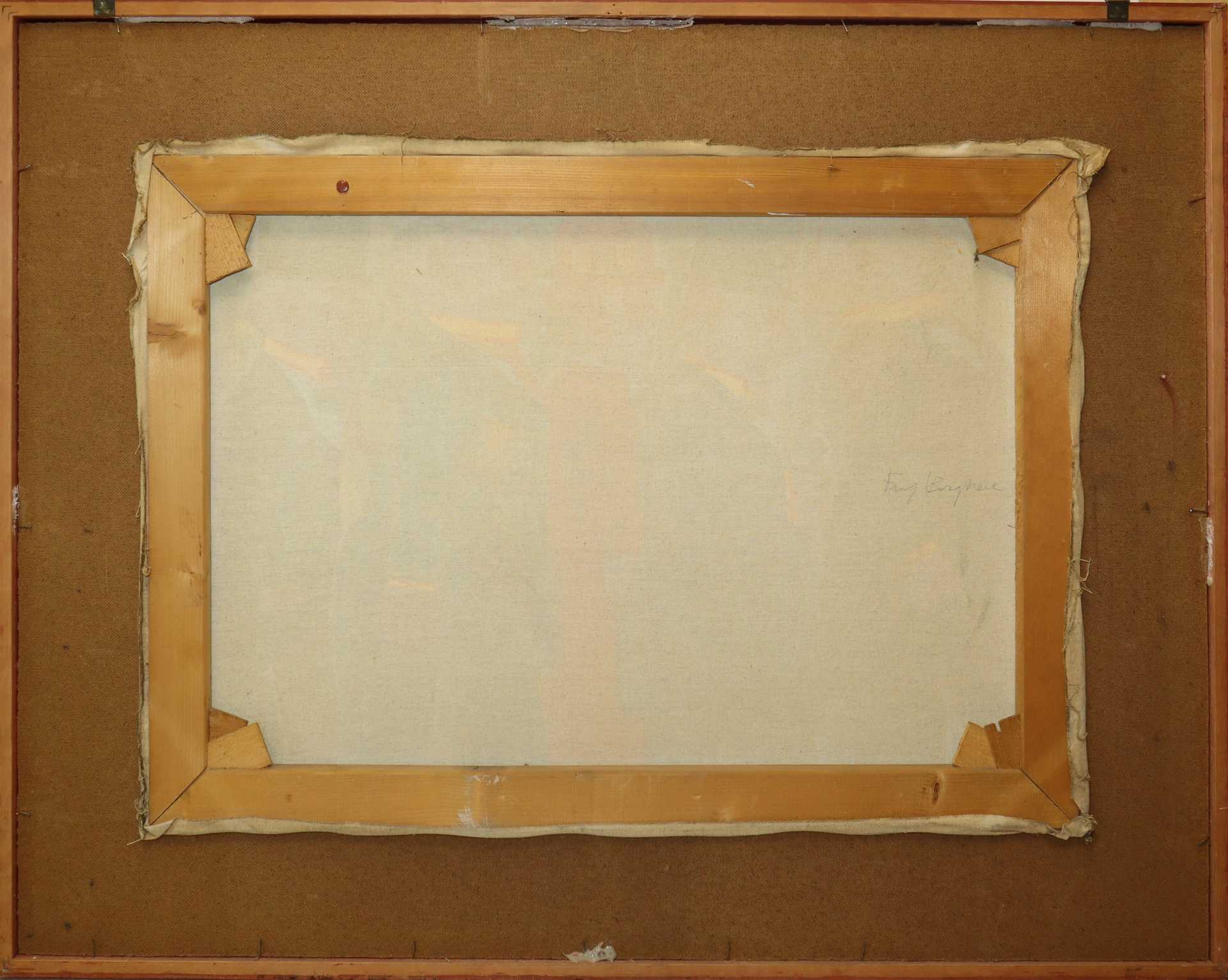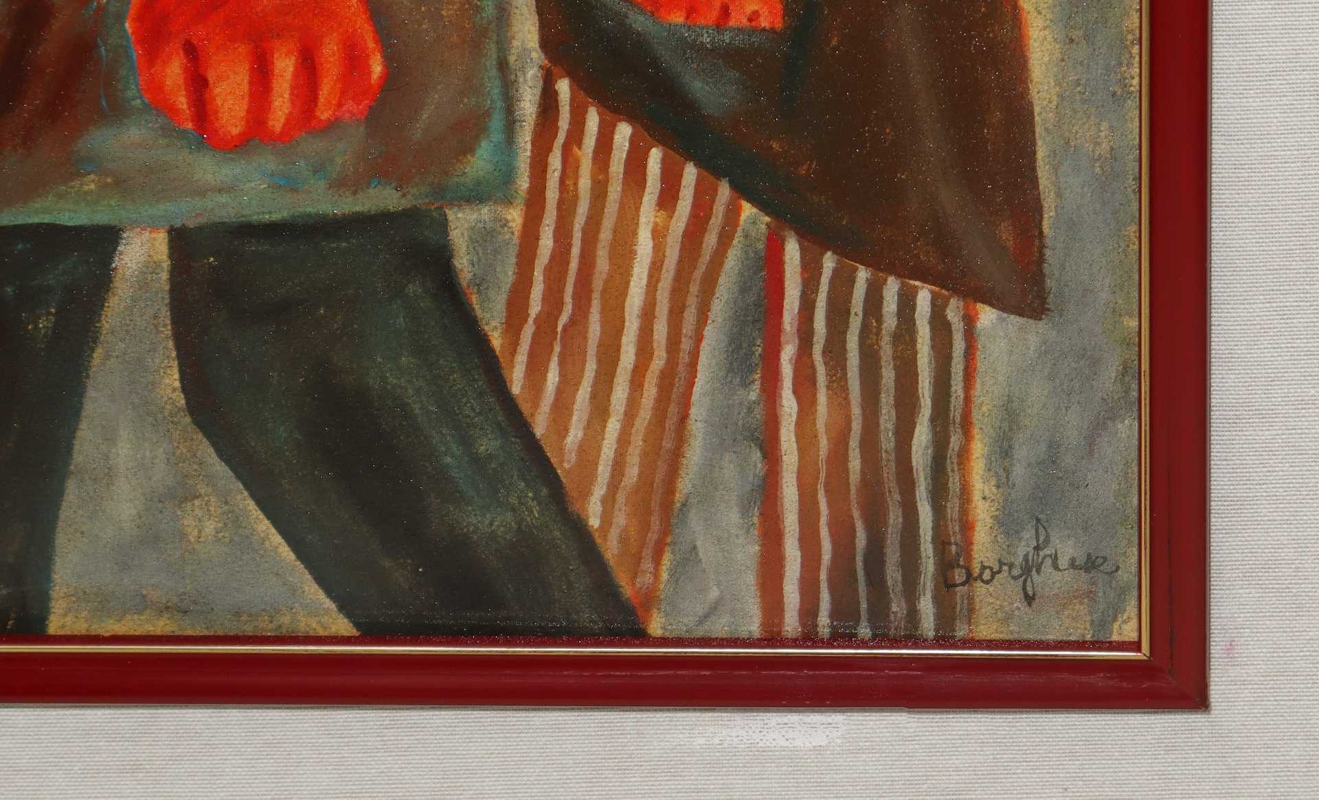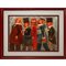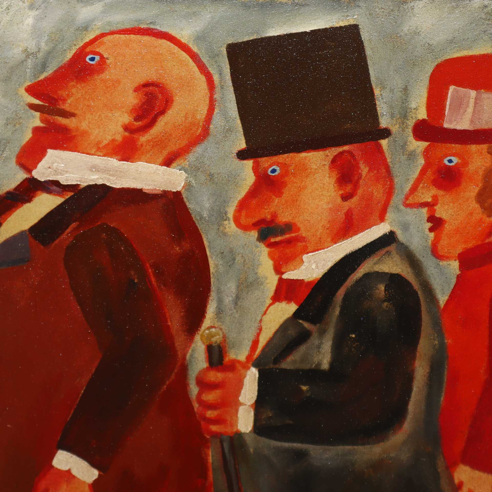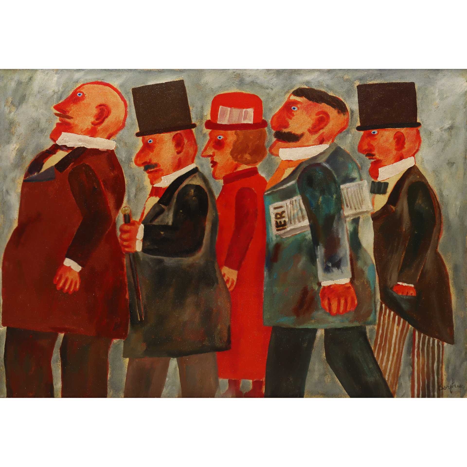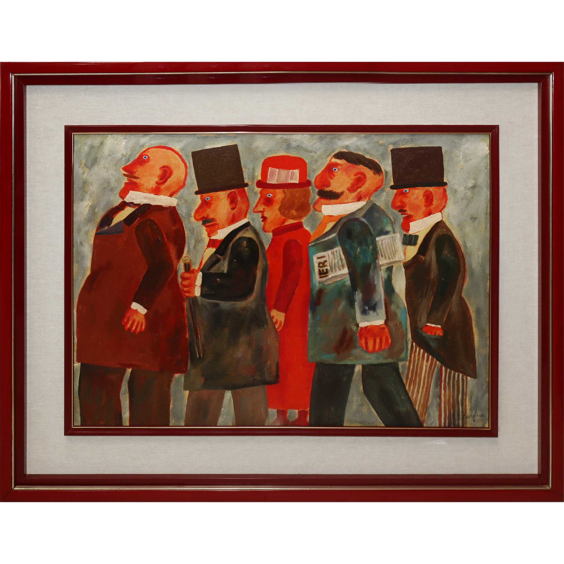 Franz Borghese - Personaggi in fila H cm 50,5x70x5 - in cornice H cm 74x93 Olio su tela Firmato al fronte in basso a destra. Firmato a penna al retro a sinistra.