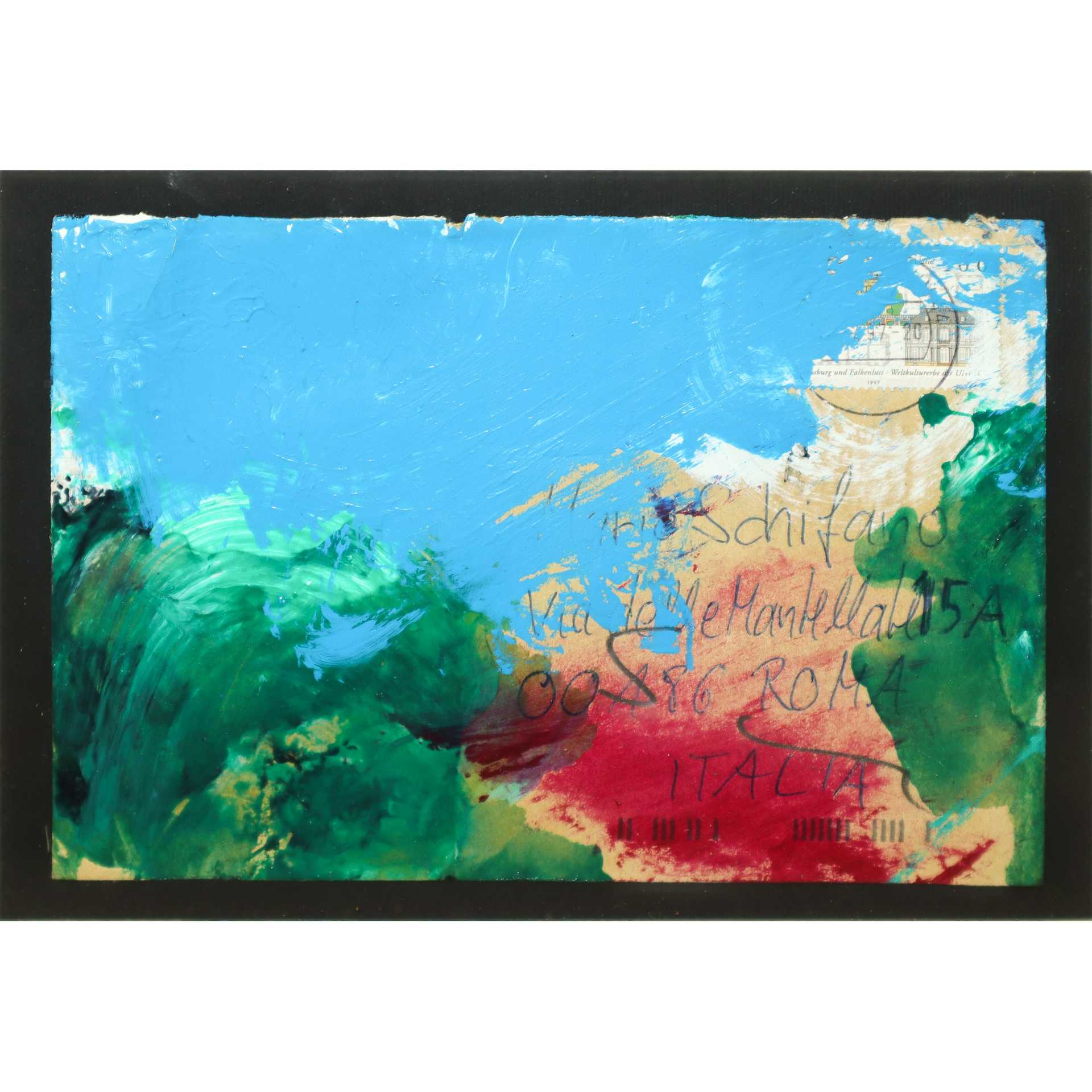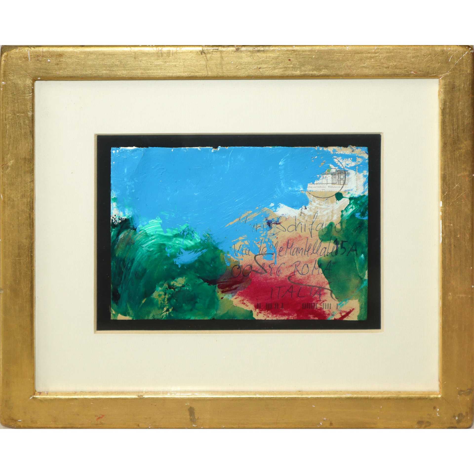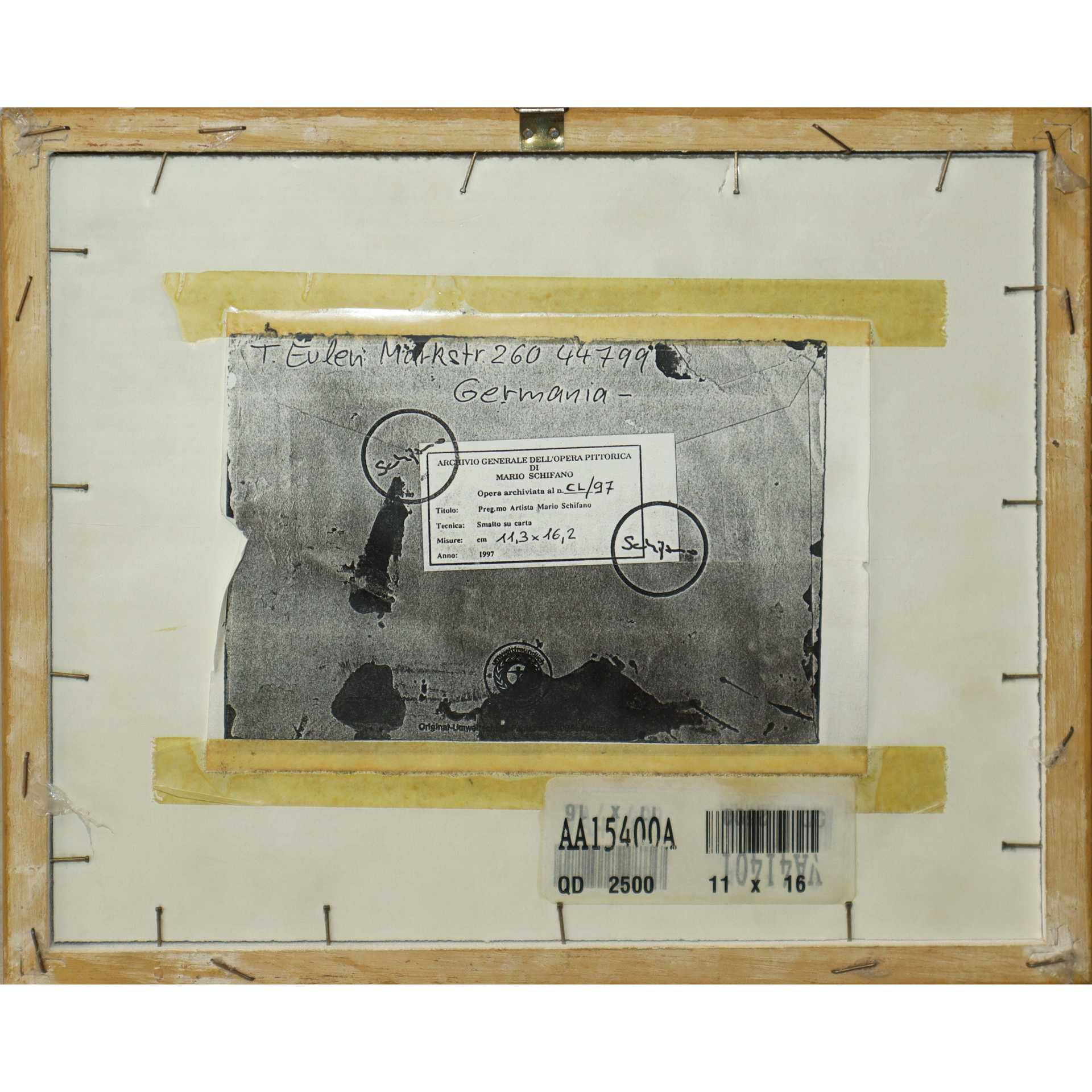 Mario Schifano (Homs Libia 20/09/1934-Roma 26/01/1998) - Le mantellate , Roma, 1997 cm 11,3x16,2, in cornice cm 25x30 Smalto si cartoncino Firmato sul fronte e titolato. Archivio Generale dell'Opera Pittorica Mario Schifano al numero CL/97
