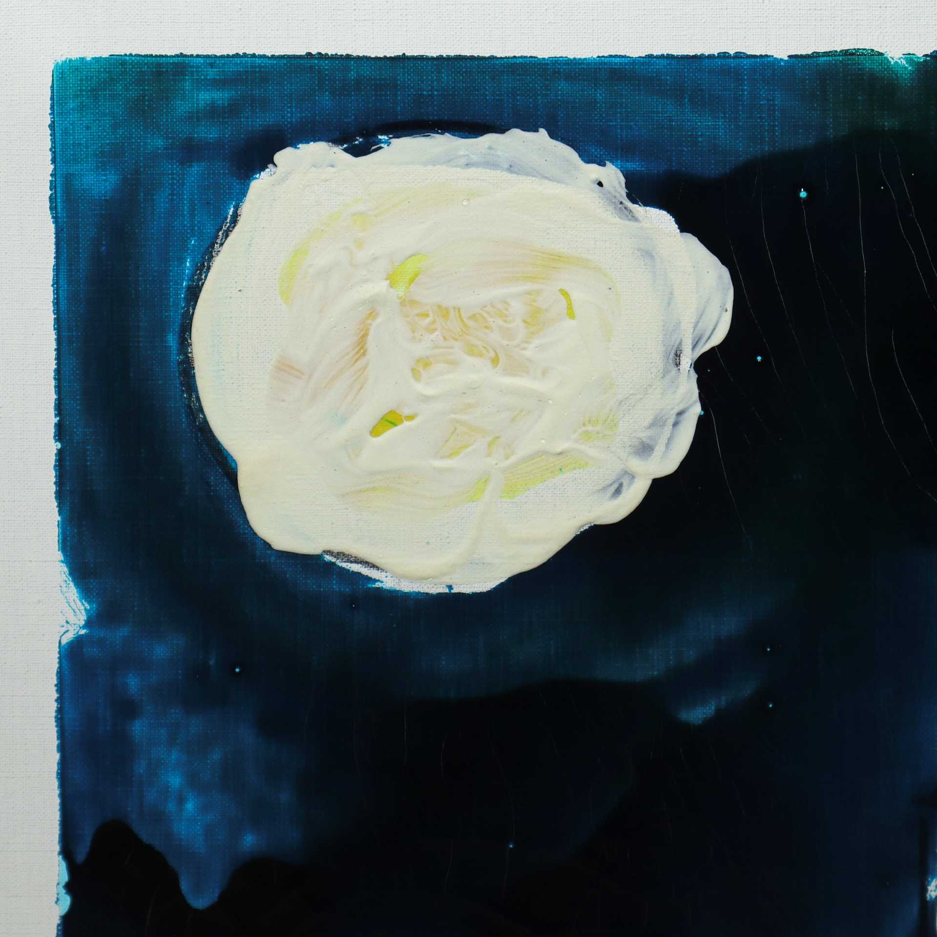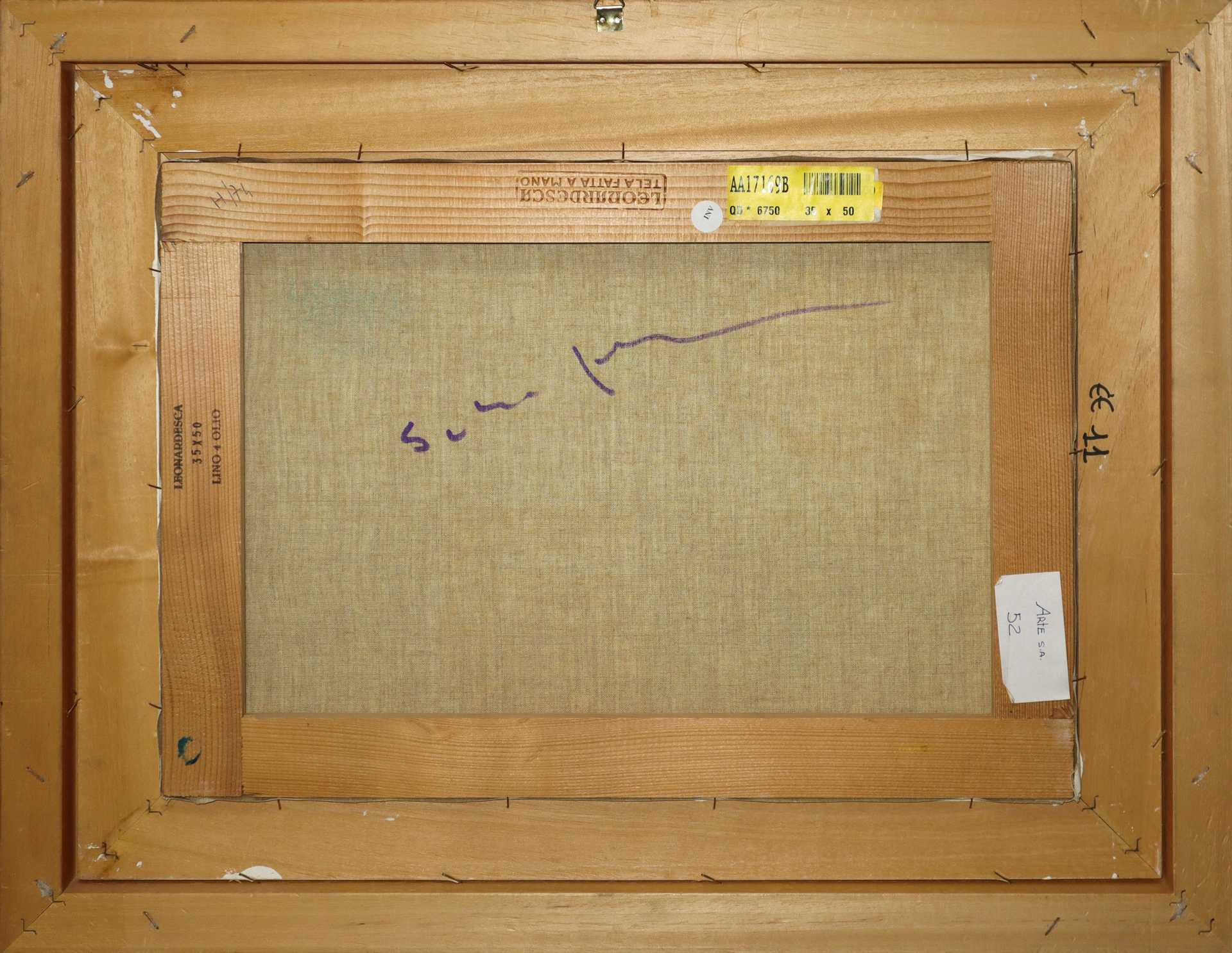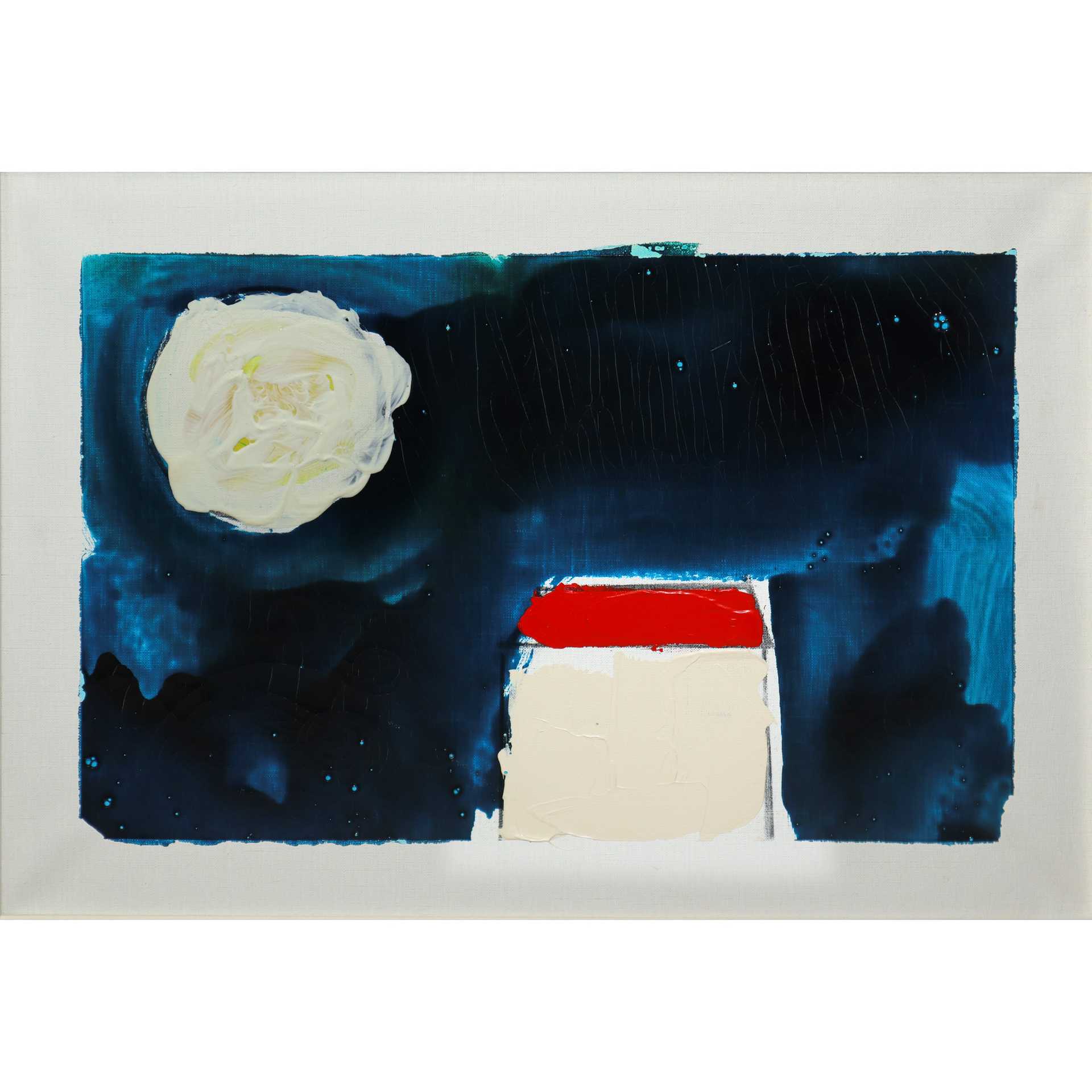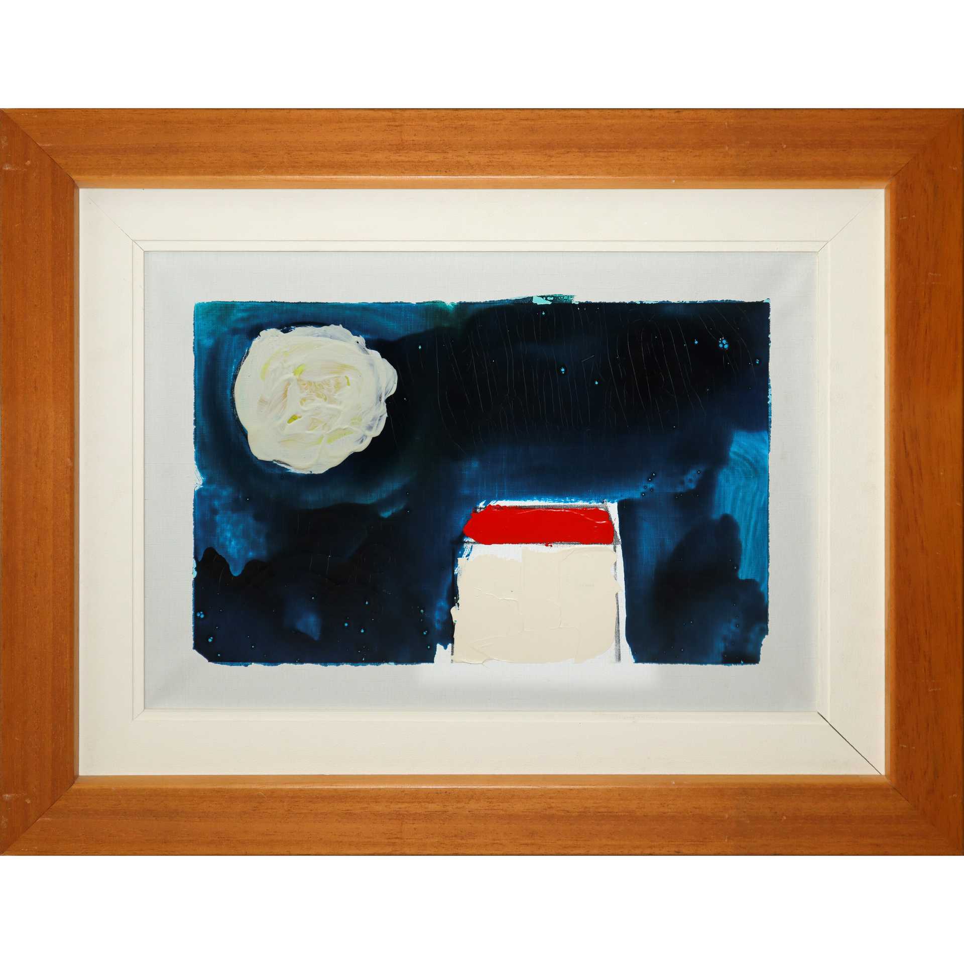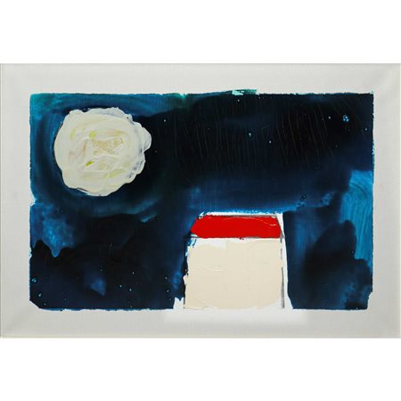 Mario Schifano (Homs Libia 20/09/1934-Roma 26/01/1998) - Casa con luna 35x50 in cornice cm 55x69 Smalti su tela Firmato al retro. Opera in fase di archiviazione presso gli Archivi Mario Schifano.