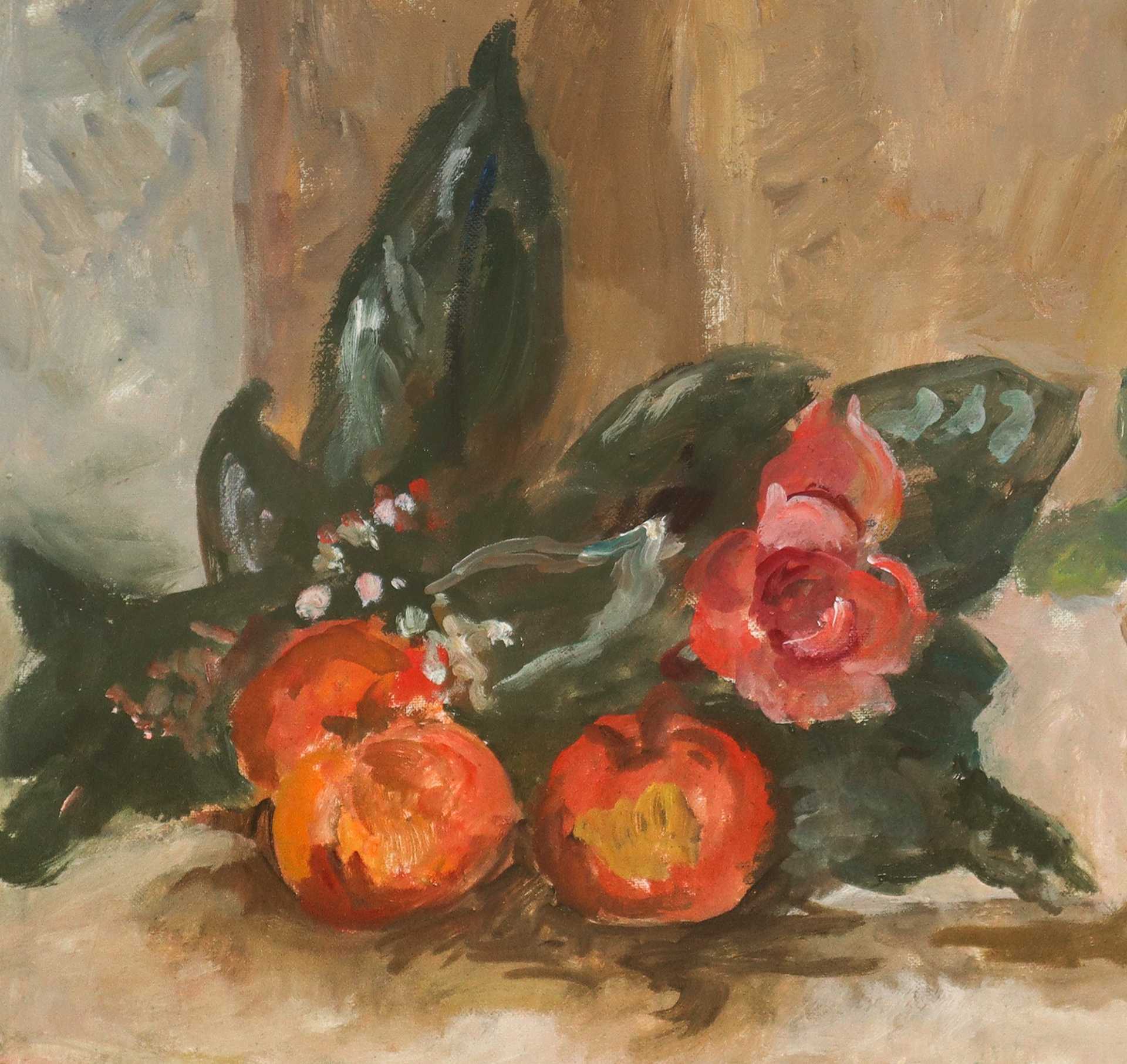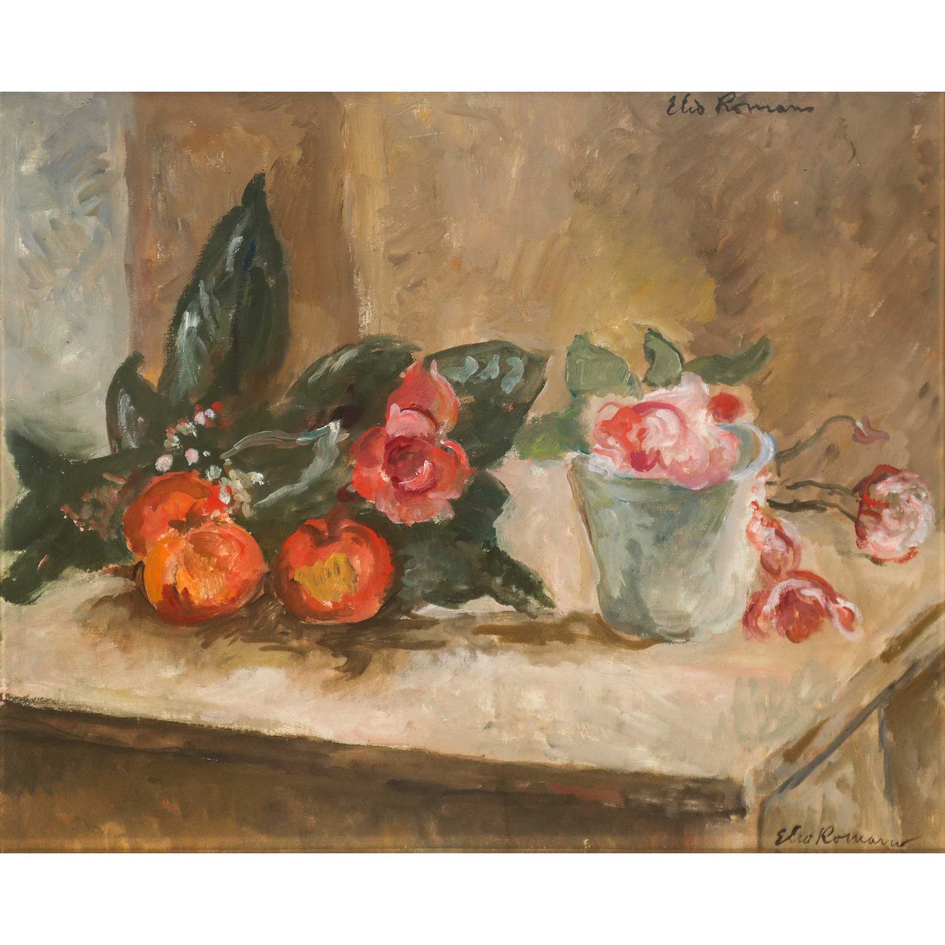Elio Romano (Trapani 1909-Catania 1996) - Natura morta di fiori e frutta cm 50x60 in cornice Cm 66x76 Olio su tela Firmato in basso e in alto a destrs