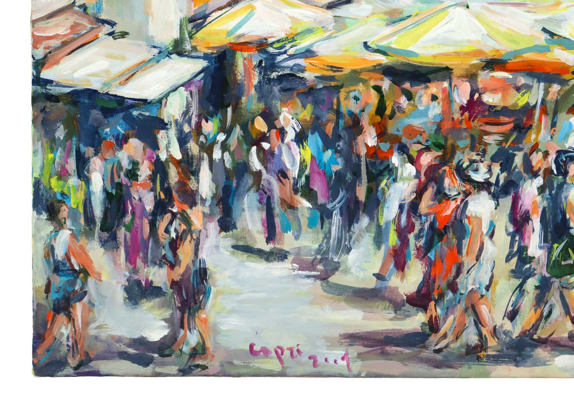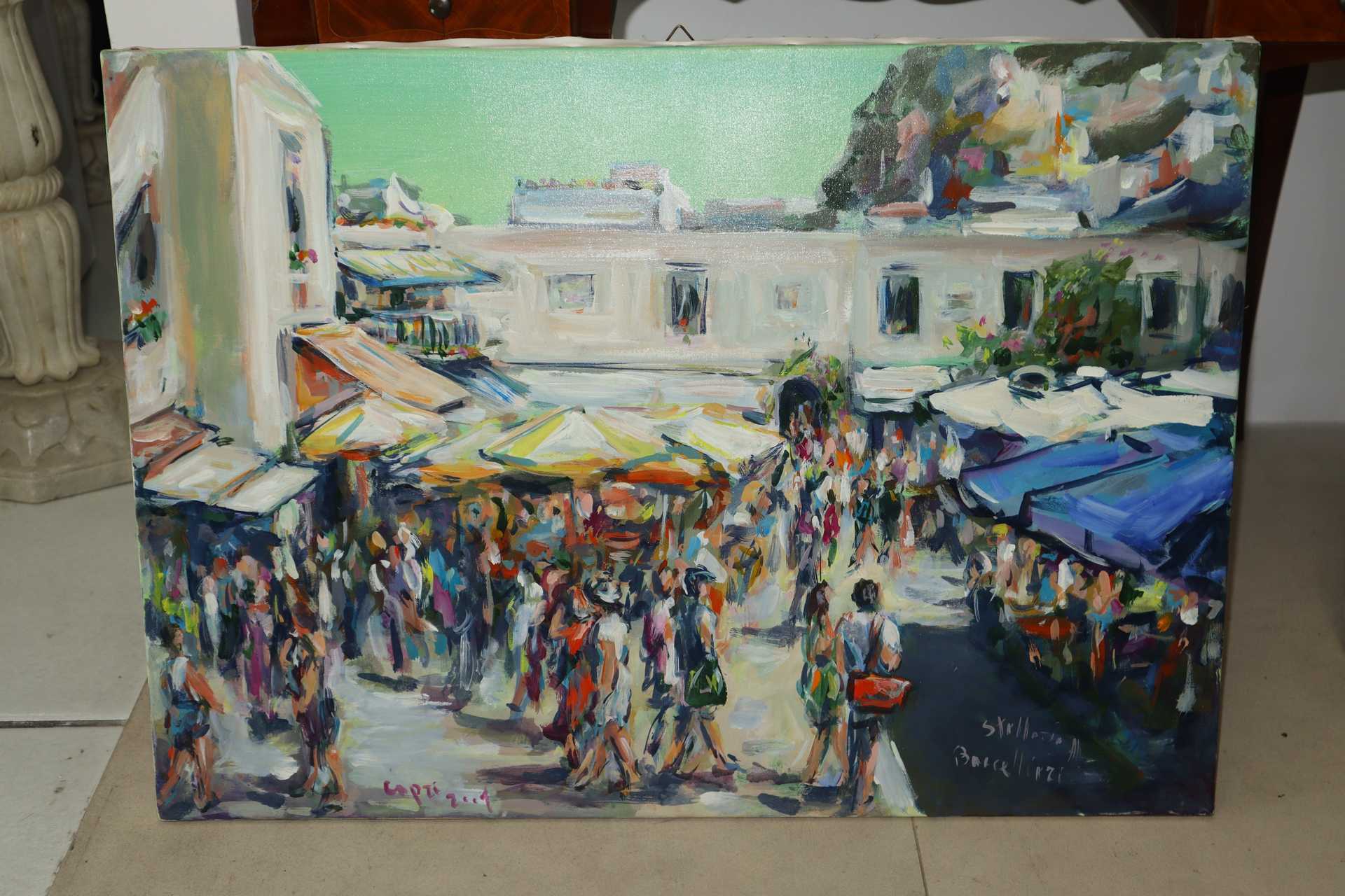 Stellario Baccellieri (Reggio Calabria 1950) - Mercato di Capri, 2001 cm 50x70 Olio su tela Firmato in basso a destra e a sinitra Capri 2001. Opera sprovvista di cornice