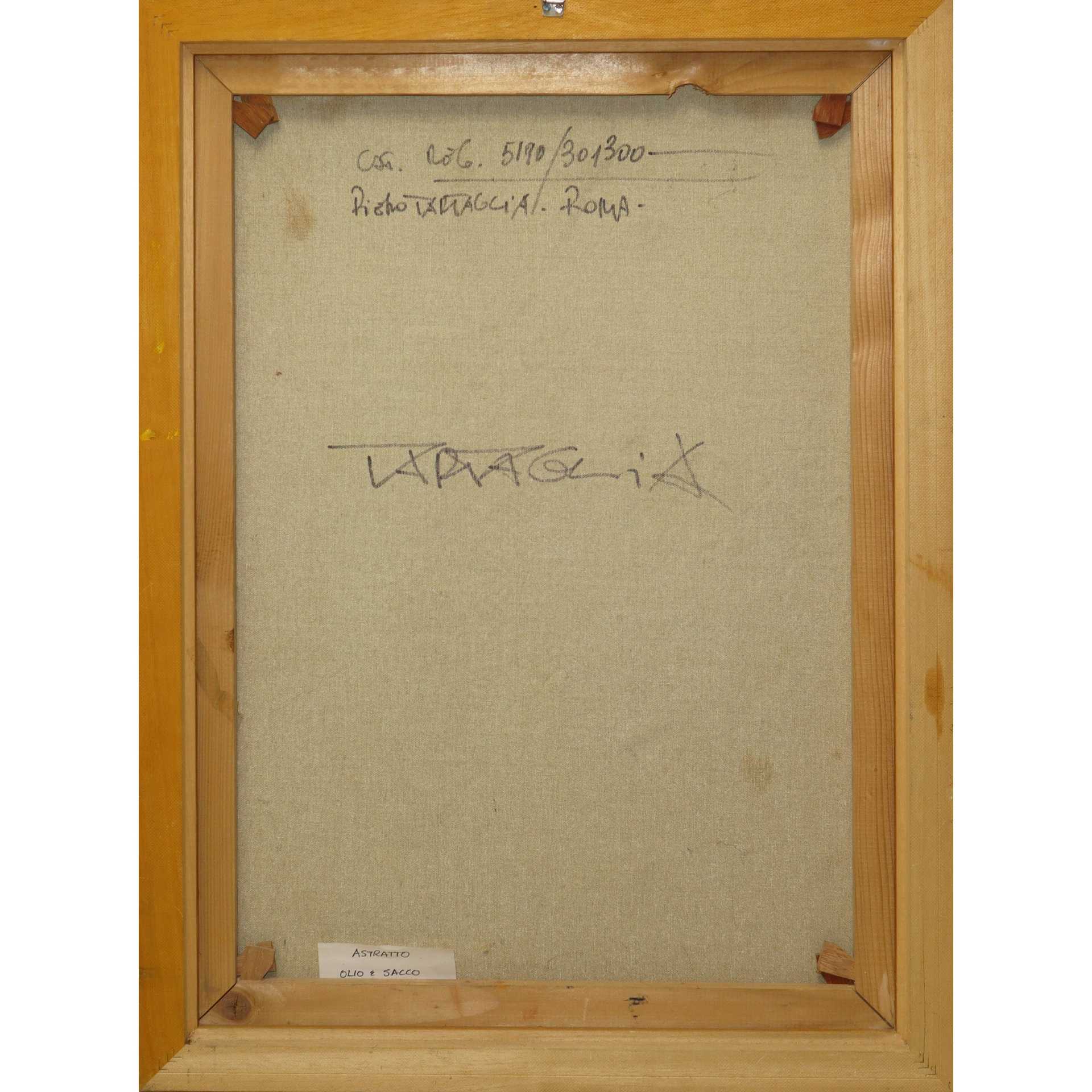 Piero Tartaglia (Civitavecchia 05/10/1933-Roma 01/05/2008) - Composizione astratta H cm 50x70 Tecnica mista su tela, olio e sacco Firmato in basso a sinistra. Al retro firmato, catalogo al N.51/90 301300 dell'Archivio Piero Tartaglia Roma.
