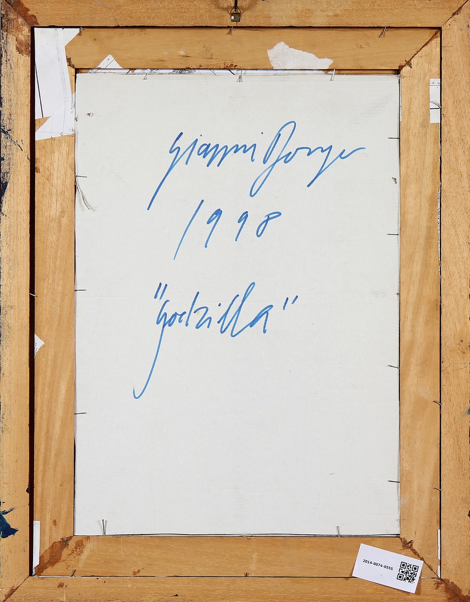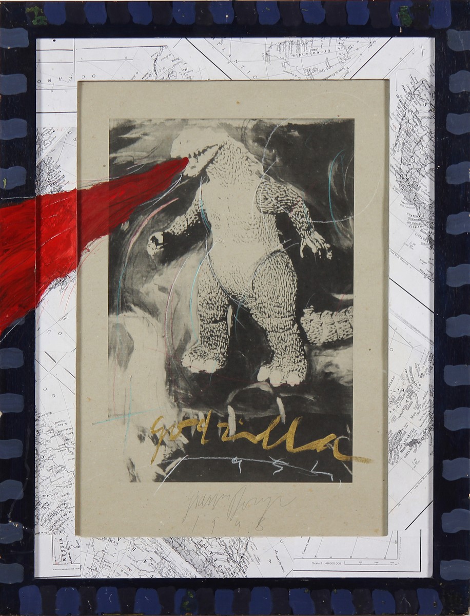 DORIGO GIANNI (n. 1953) Godzilla. 1998. Collage e tecnica mista su cartoncino. Cm 51,00 x 66,00 x 1,00. Firma e data in basso al centro. Al retro titolo, firma ed anno. Autentica dell' artista su fotografia come da documentazione allegata all' opera.