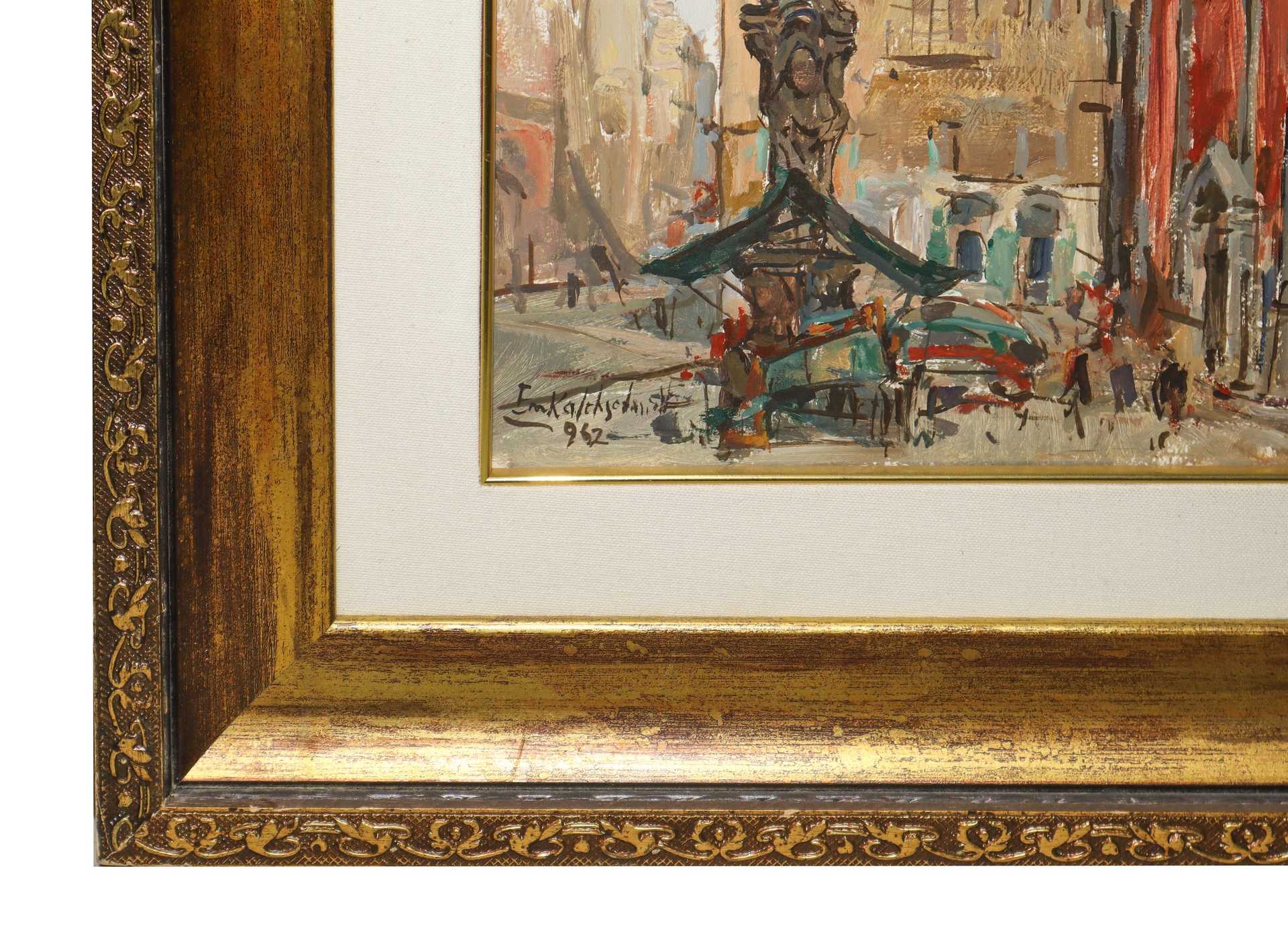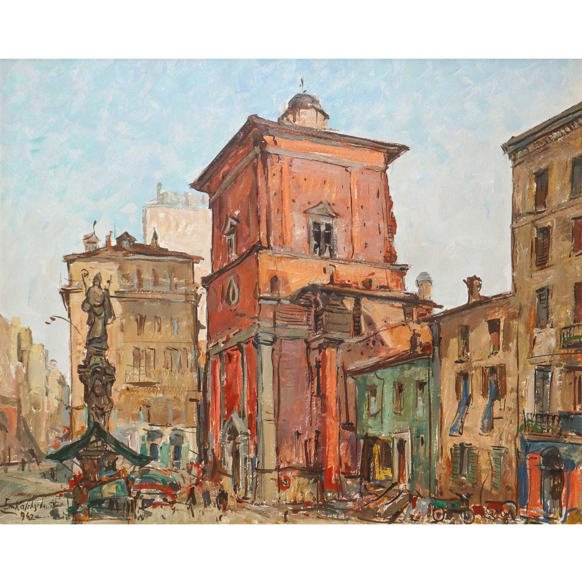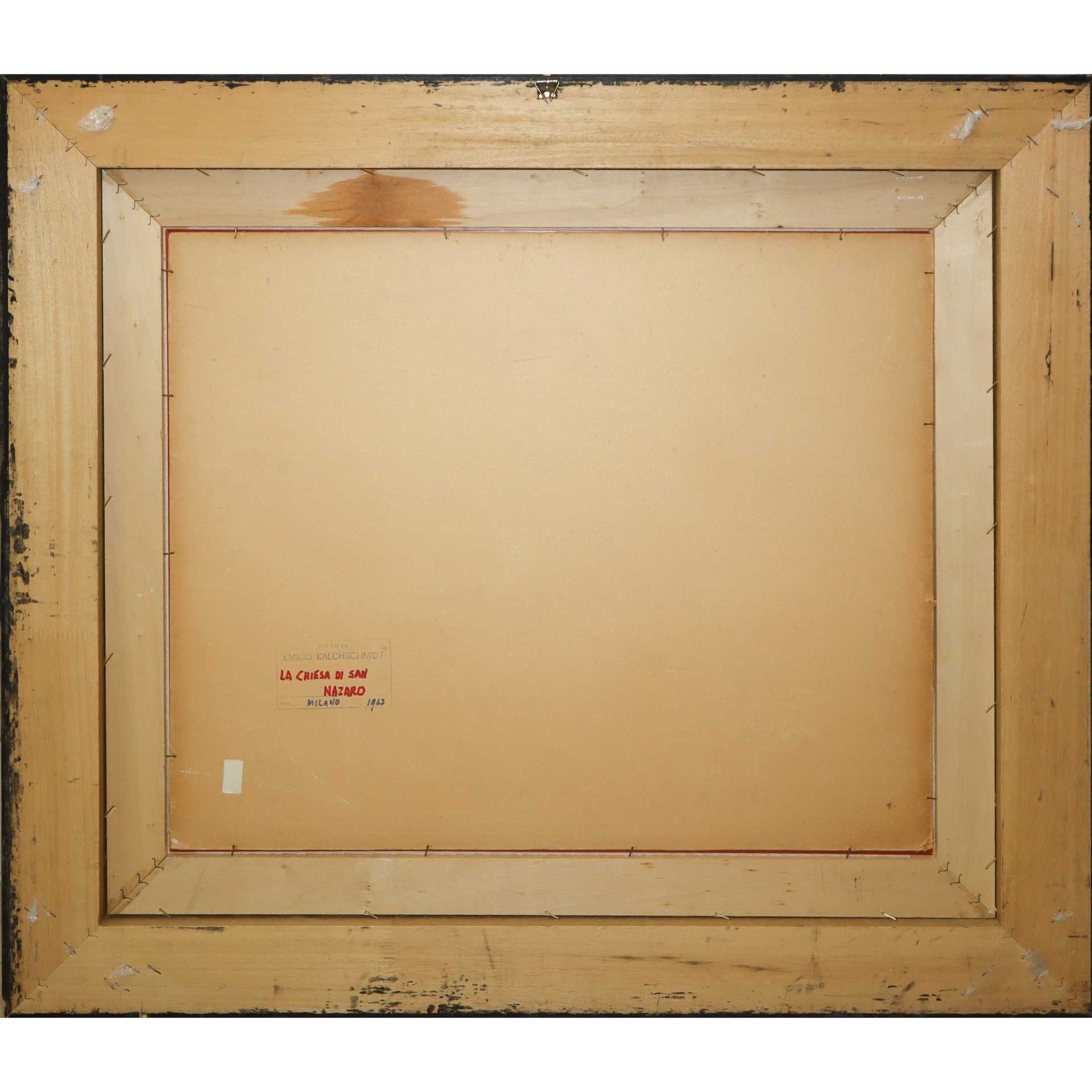 Emilio Kalchschmidt (Novara 1902-1983) - Chiesa di San Lazzaro, Milan, 1962 H cm 60x50 - in cornice H cm 76x86 Olio su tavola Firmato al fronte a sinistra. Al retro timbro del pittore e titolo