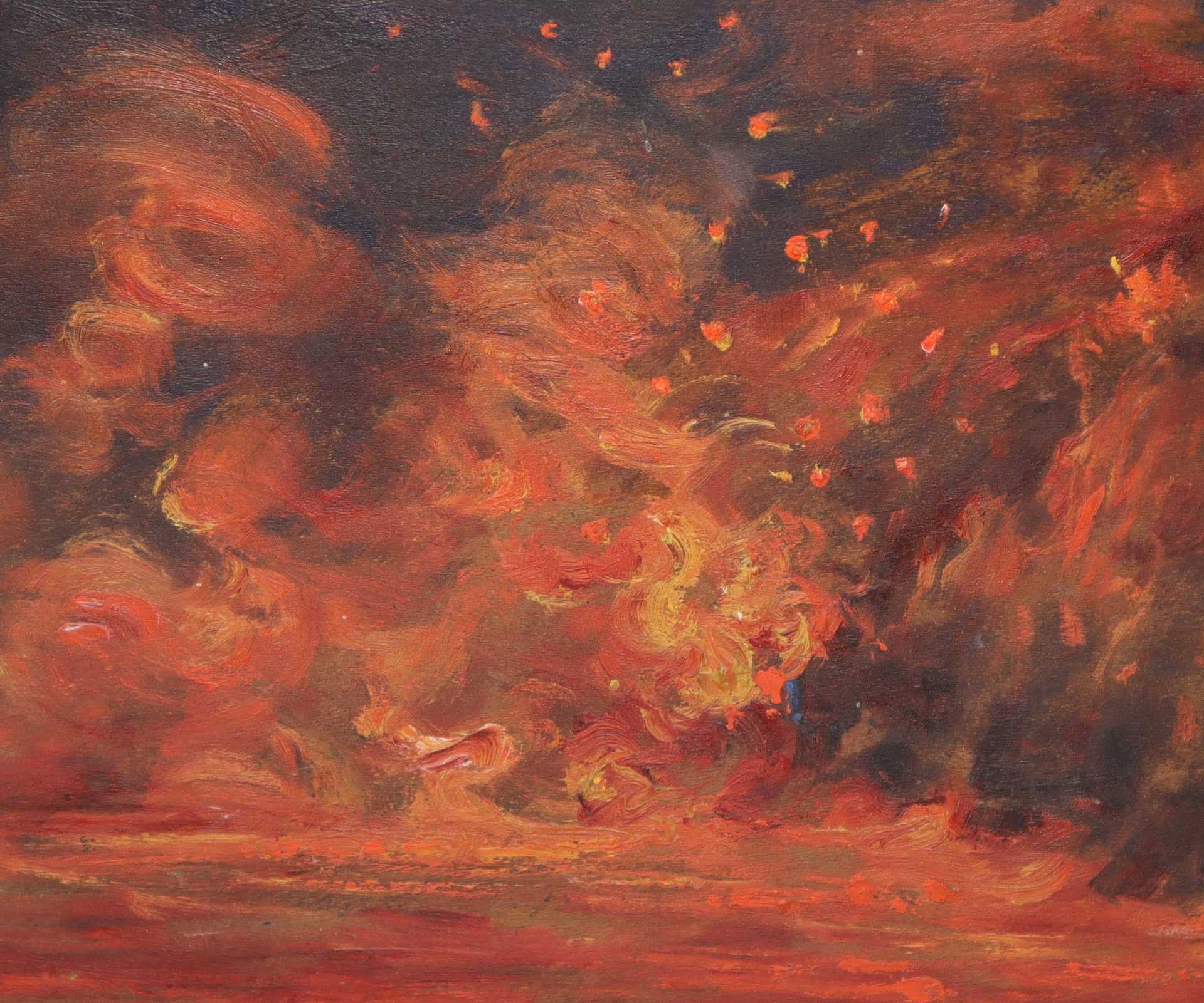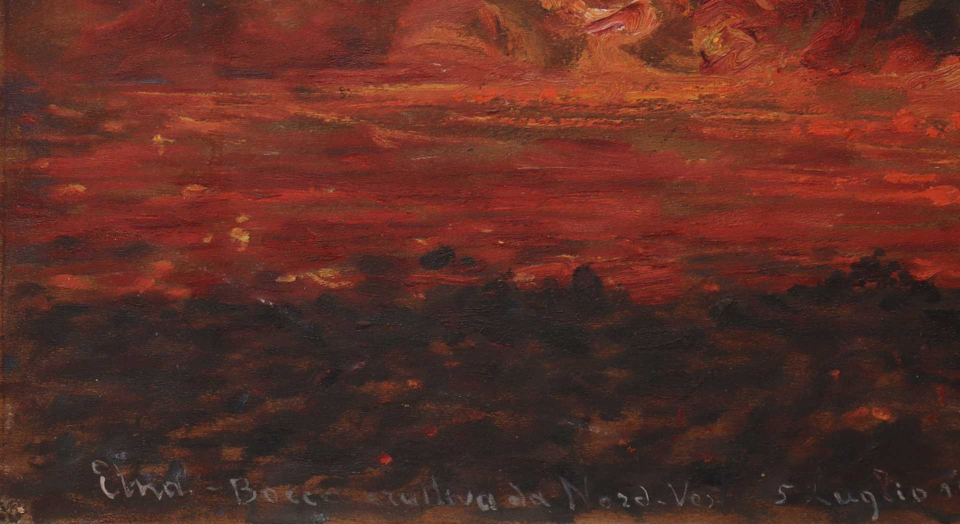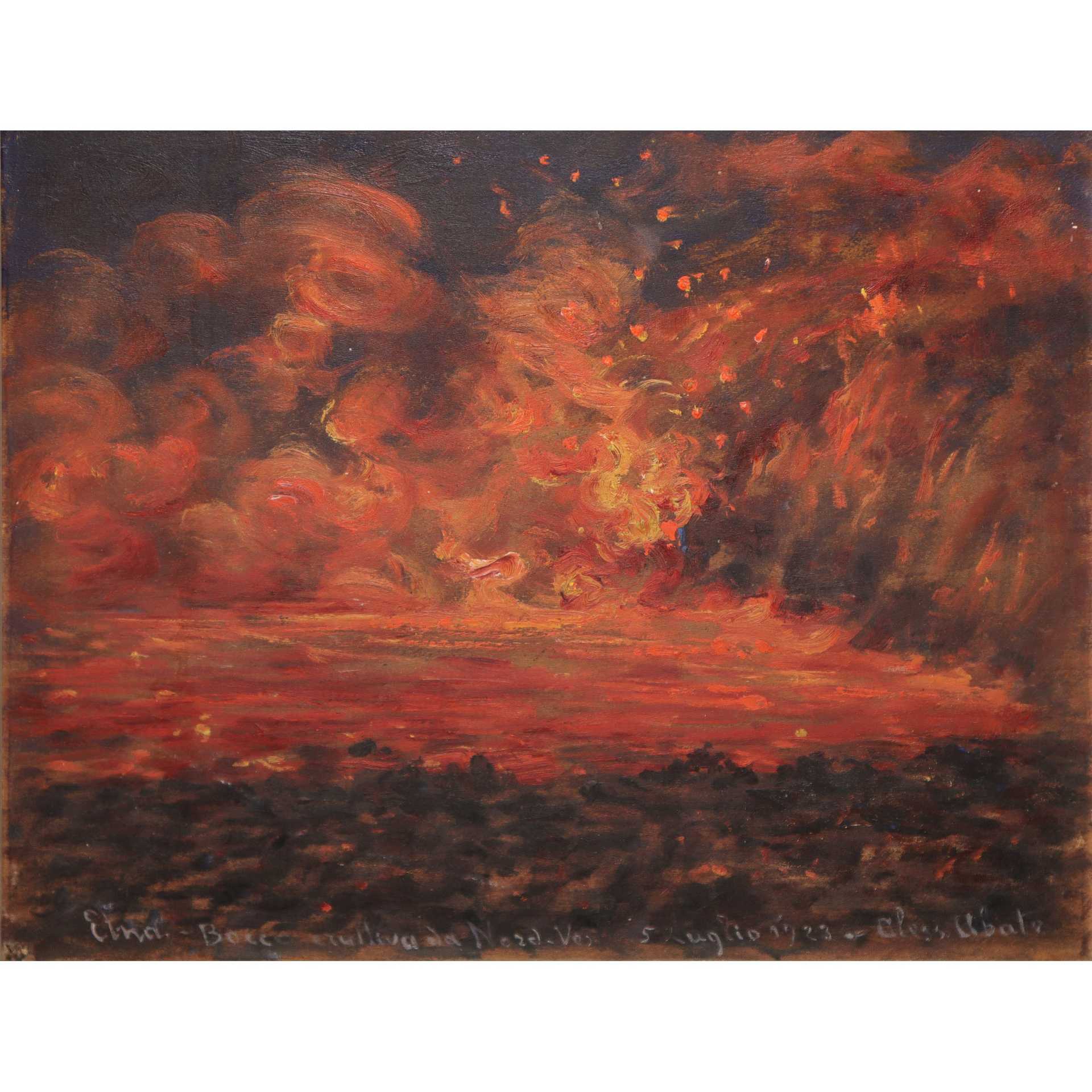 Alessandro Abate (Catania 25/11/1867-Catania 29/03/1953) - Etna - bocca eruttiva da nord ovest, 1923 H cm 32x38 - in cornice H cm 50x55 Olio su tavola Al basso scritta "Etna - bocca eruttiva da nord ovest", 5 luglio 1923 e firma