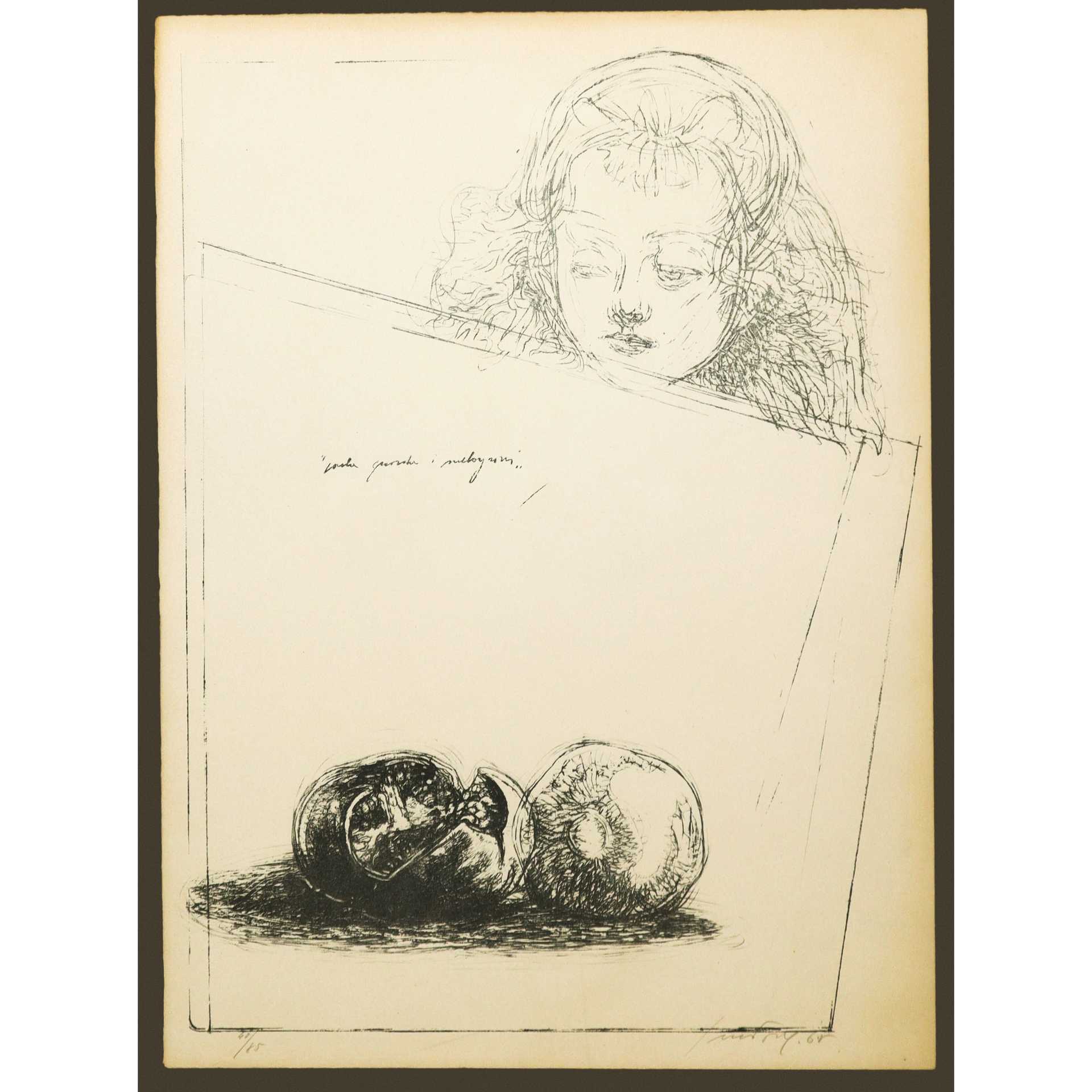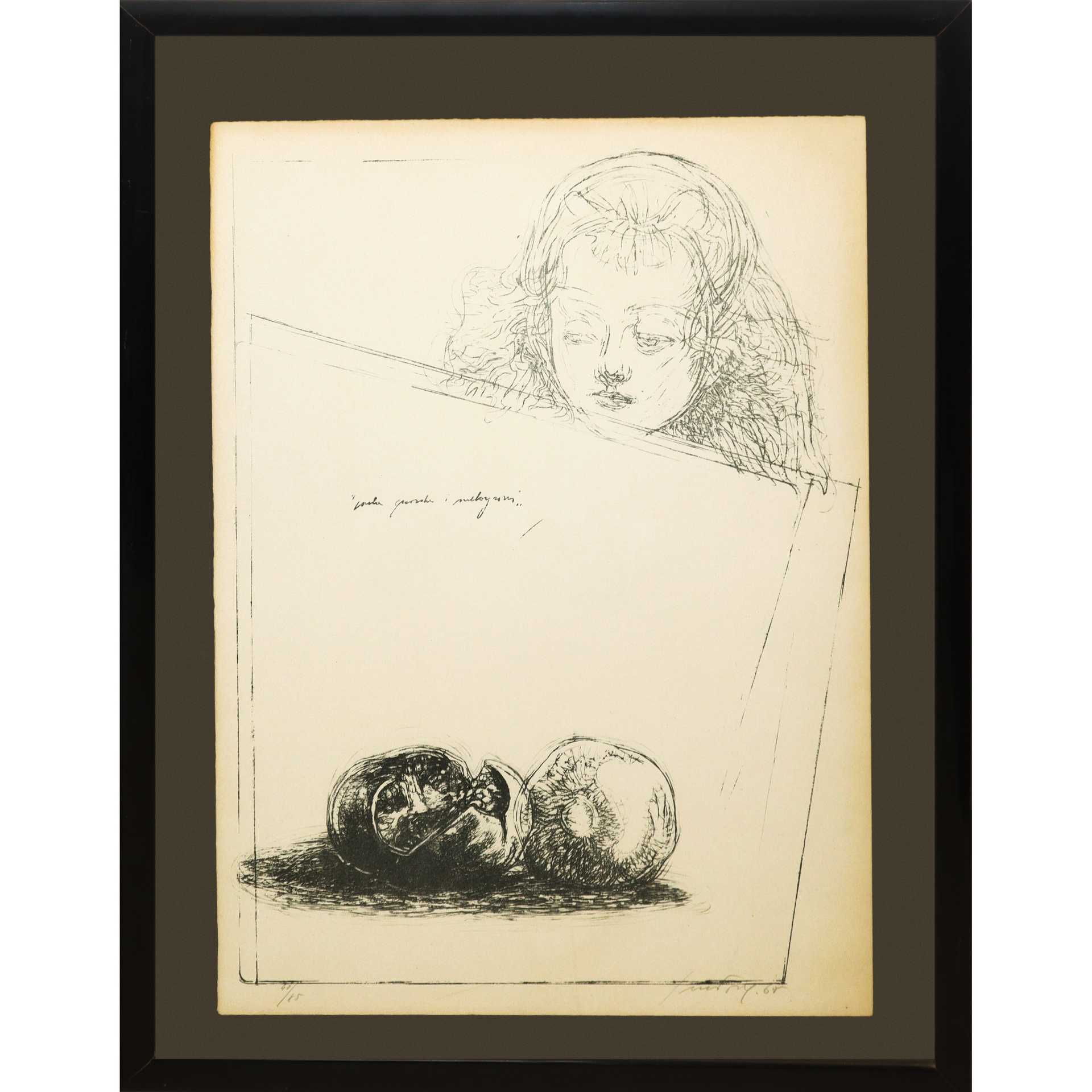 Piero Guccione (Scicli 1935-Modica 2018) - Paola guarda il melograno, 1968 H cm 62x45 - in cornice H cm 73x59 litografia 40/85. Firmato al fronte in basso a destra