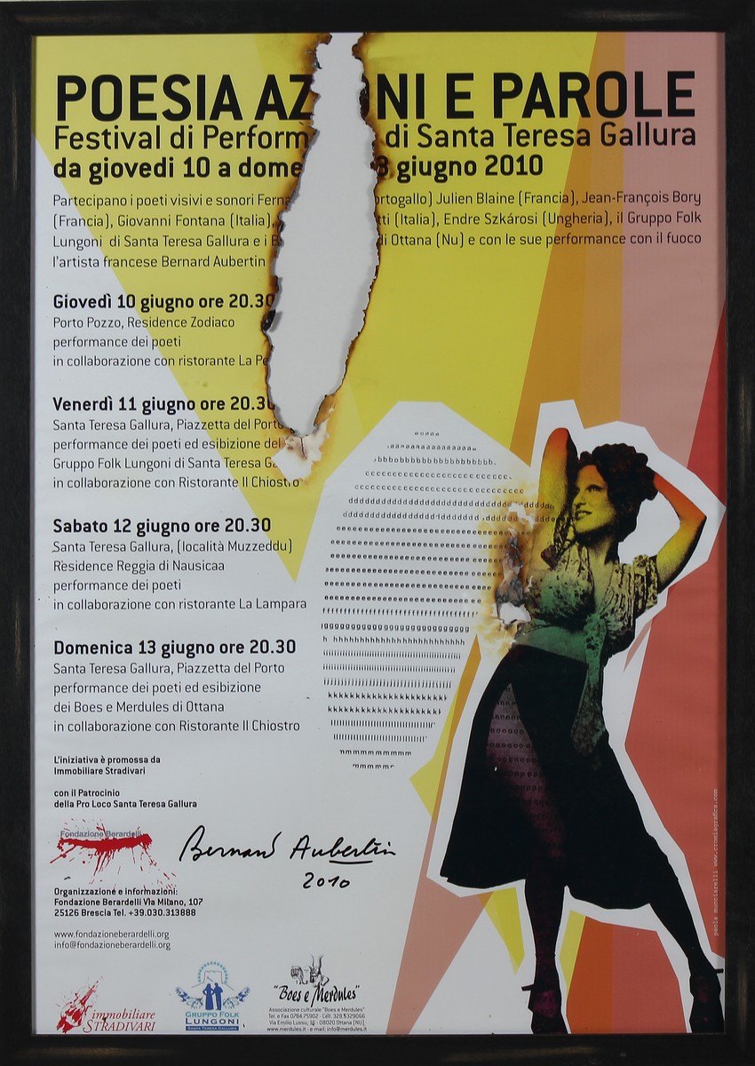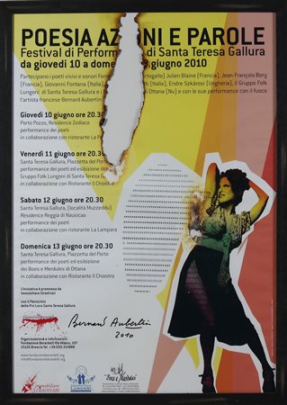 AUBERTIN BERNARD (n. 1934) Poesia azioni e parole. 2010. Poster bruciato. Cm 70,00 x 100,00. Firma e data in basso. Autentica dell'artista su fotografia. Cornice presente