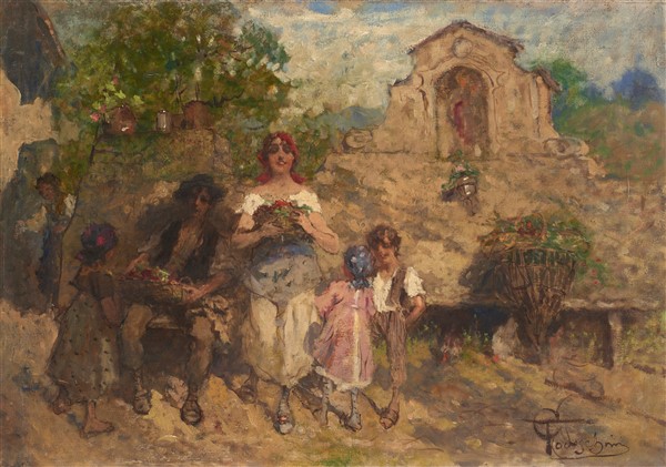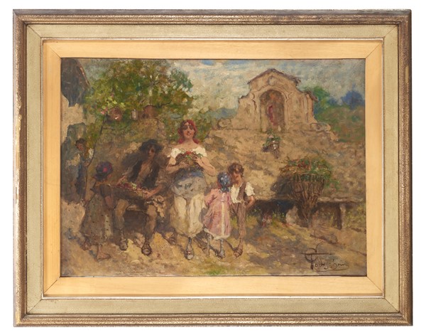 Giovanni Battista Todeschini "La raccolta delle ciliegie" olio su tela (cm 50x7