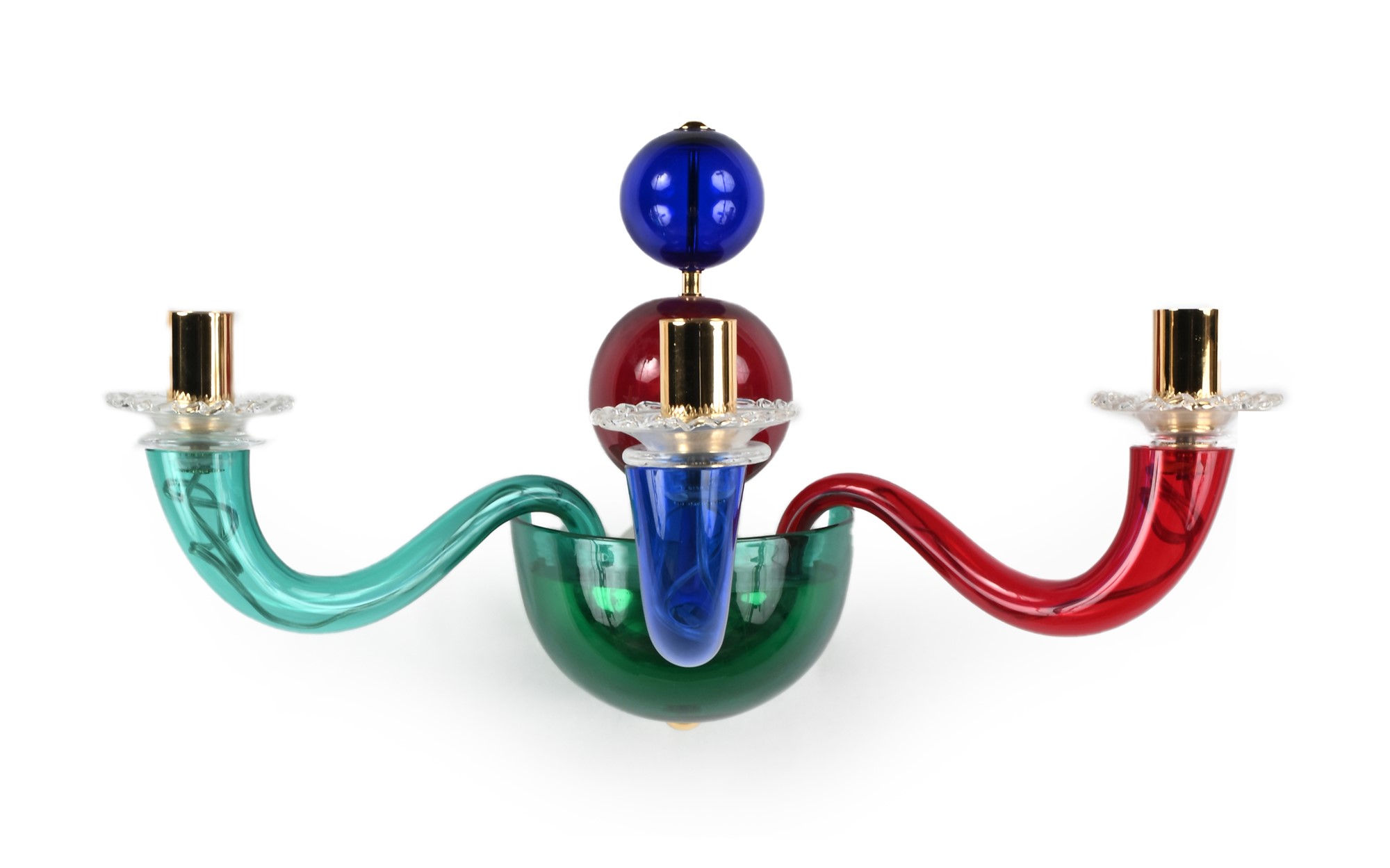 Applique a tre braccia, esecuzione Venini, Murano Anni '80 cm 55x37x22 Vetro soffiato incolore, policromo e metallo dorato. Firma "Giò Ponti per Venini"