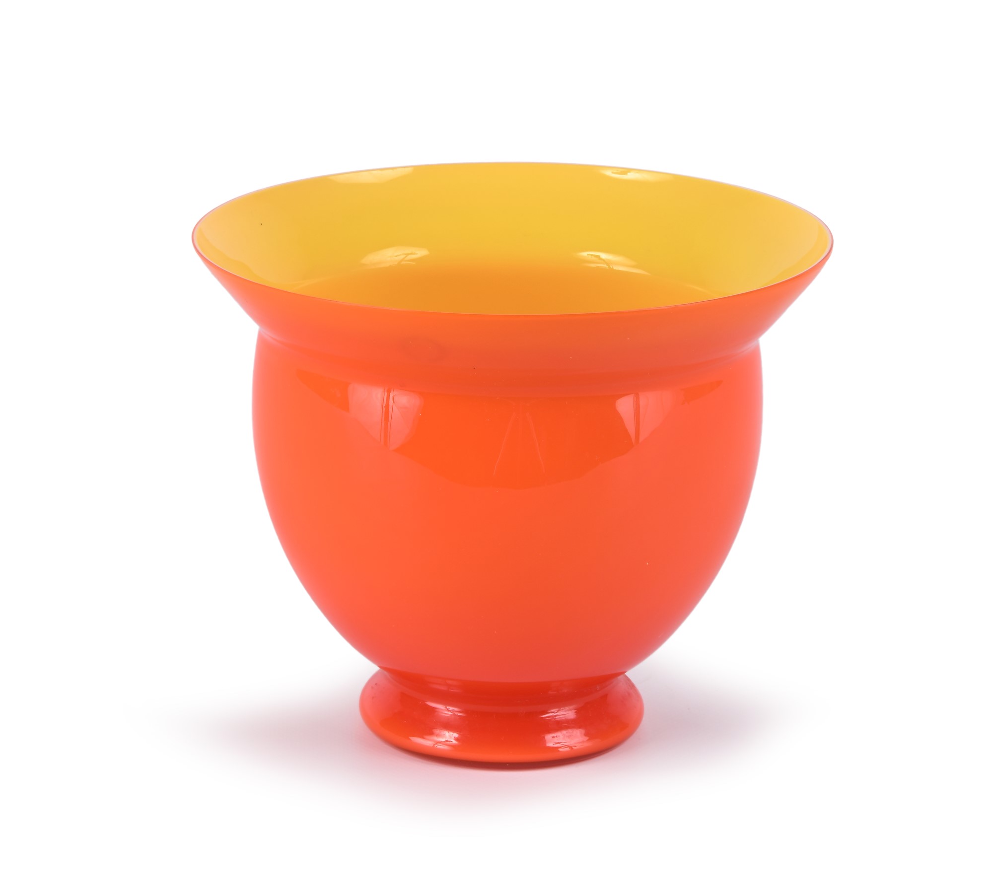 Vaso in vetro giallo con sovrapposizione arancio per le vetrerie Venini 1993 cm h 17x20,5 Firma e data sotto la base "Venini '93 A. Mendini"