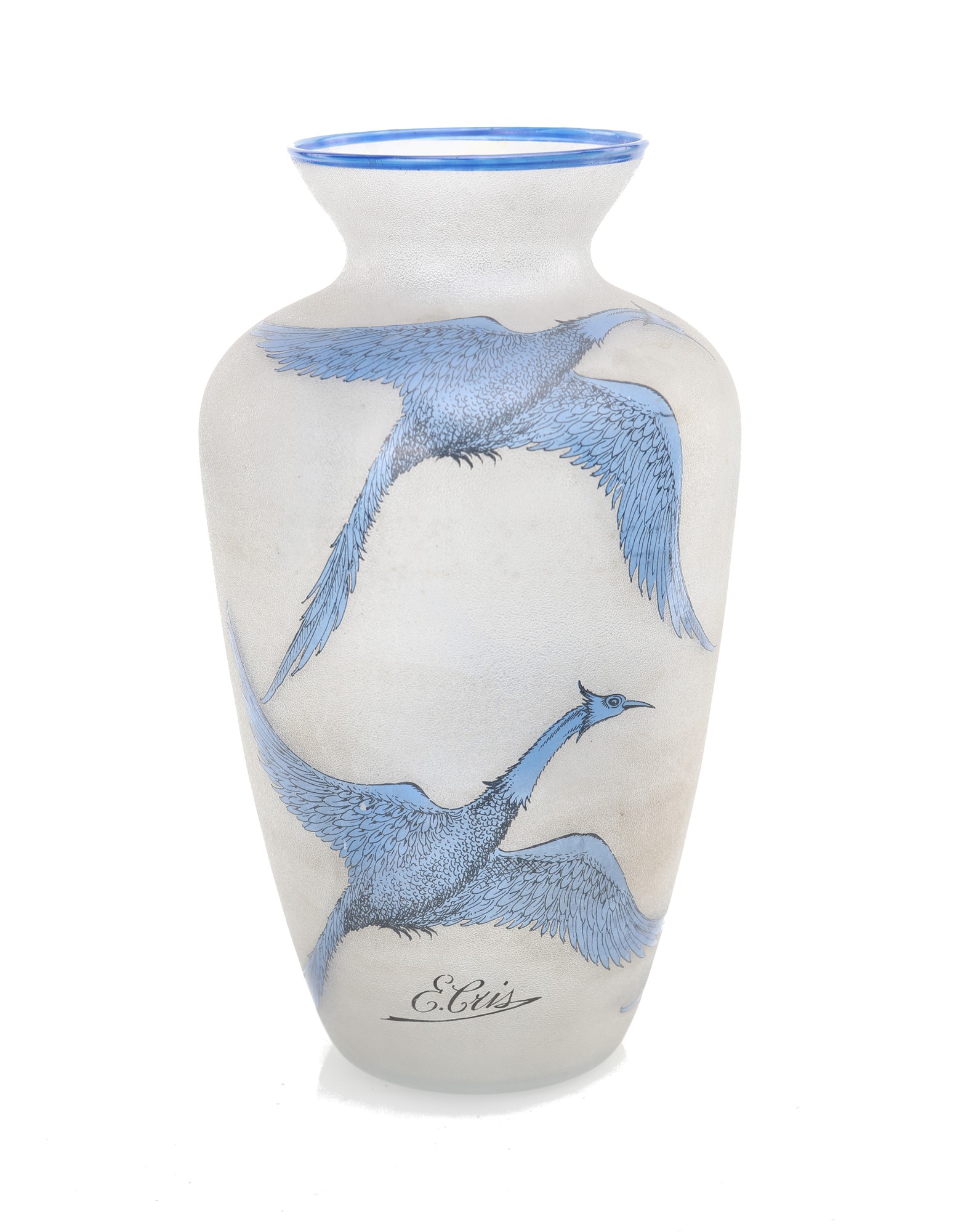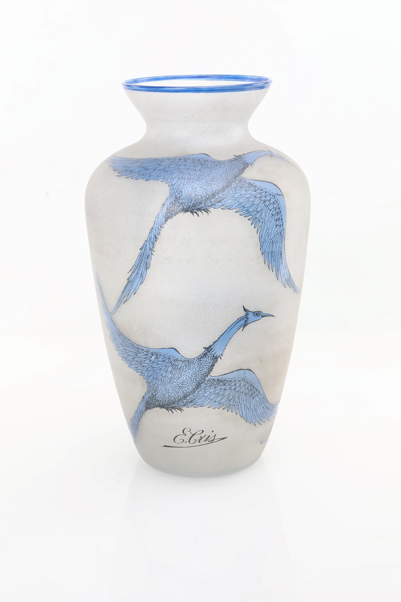 Vaso in vetro sabbiato, Francia Anni '70 altezza cm 34 decorato in blu da quattro figure di airone in volo. Firmato E. Cris