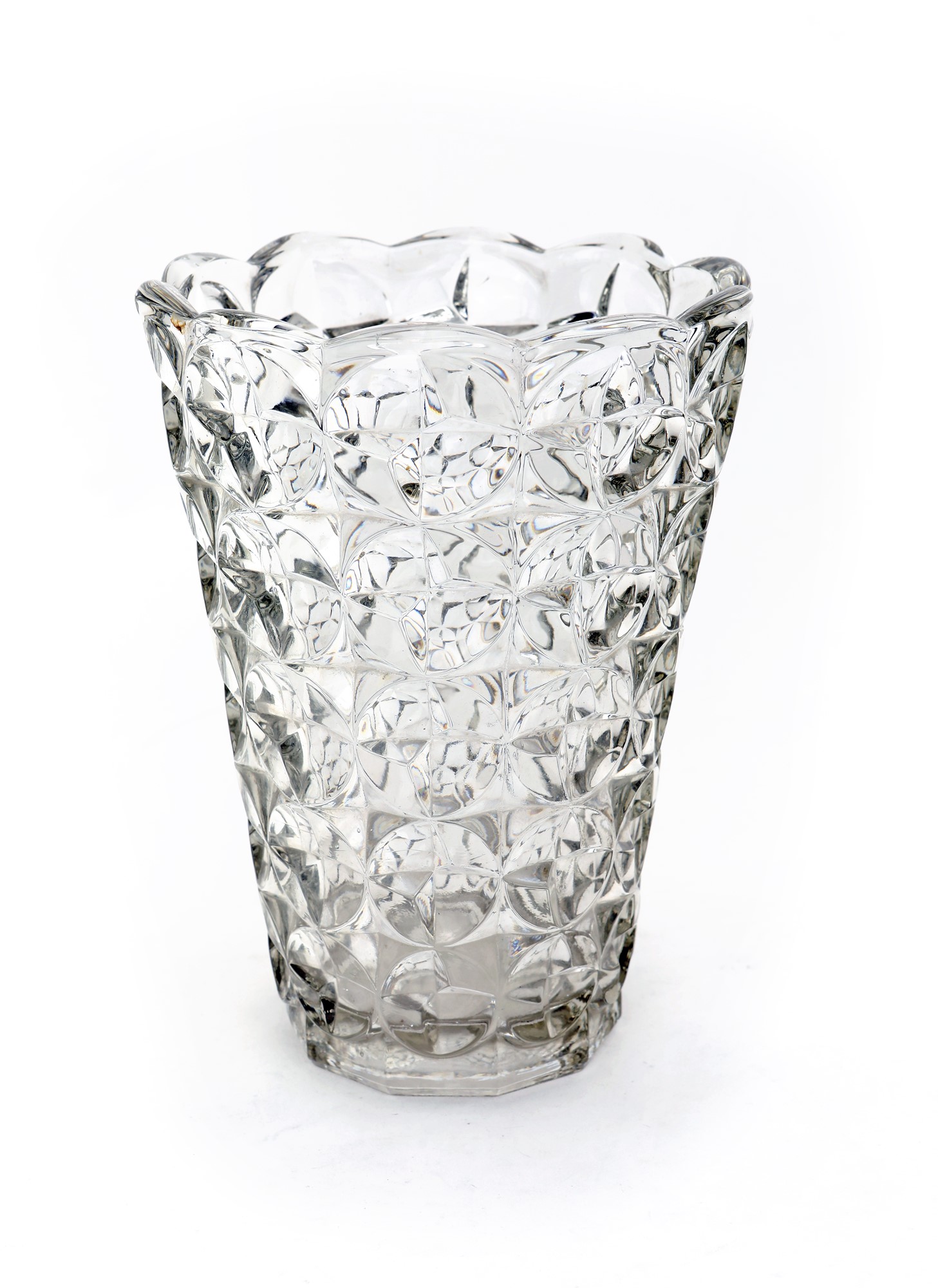 Vaso in vetro pressato incolore Anni '60 cm 24,5x18 corpo conico con orlo...