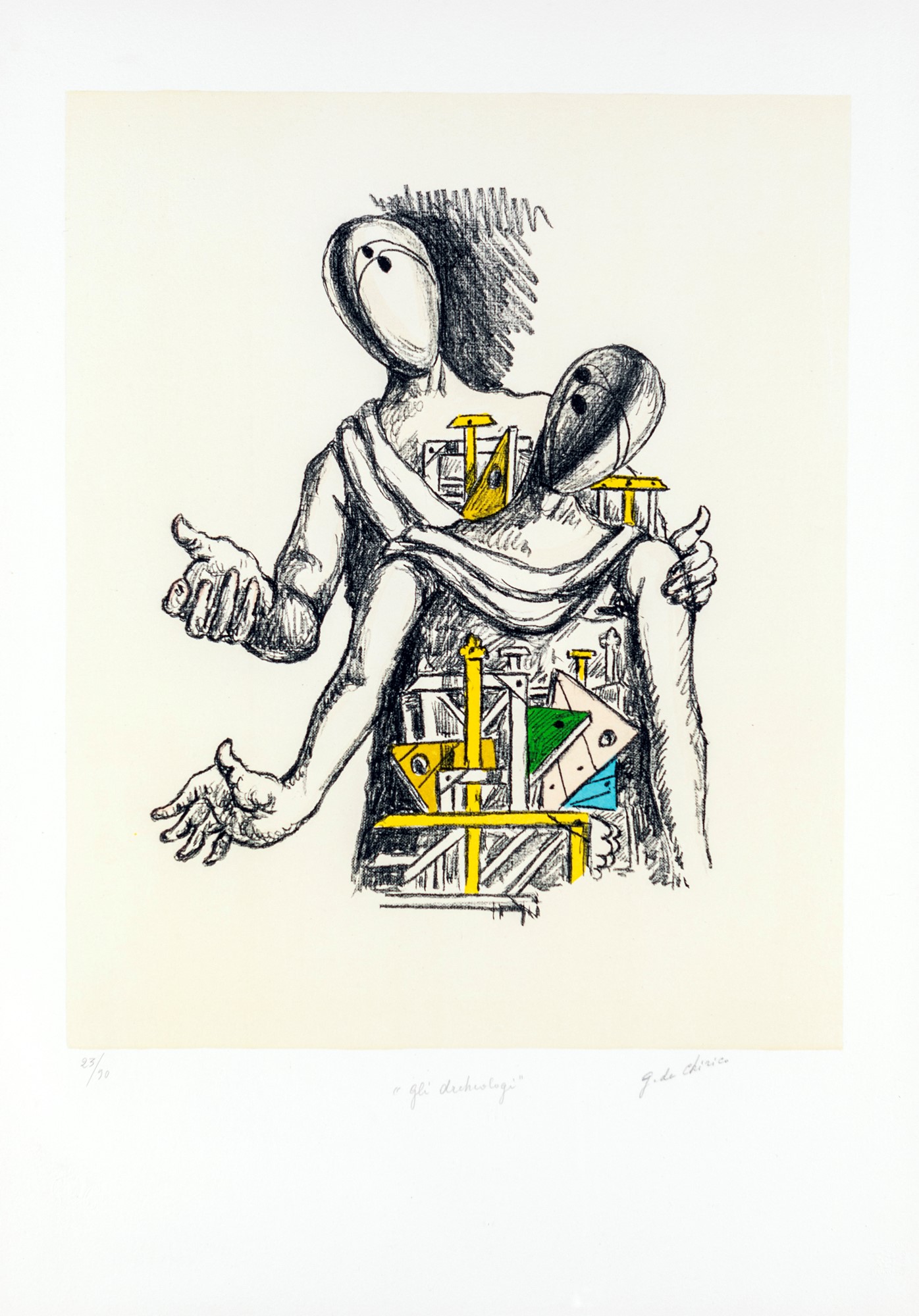 Giorgio De Chirico (Volo 1888-Roma 1978) Gli Archeologi Litografia cm 70x52,5...