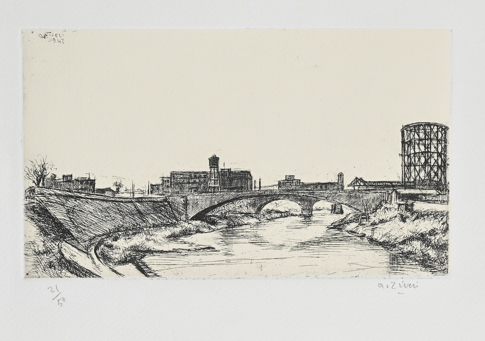 Fiume con ponte 1947 Acquaforte cm 35x50 Firma e numerazione "A. Ziveri 21/50". Firma e data in lastra.