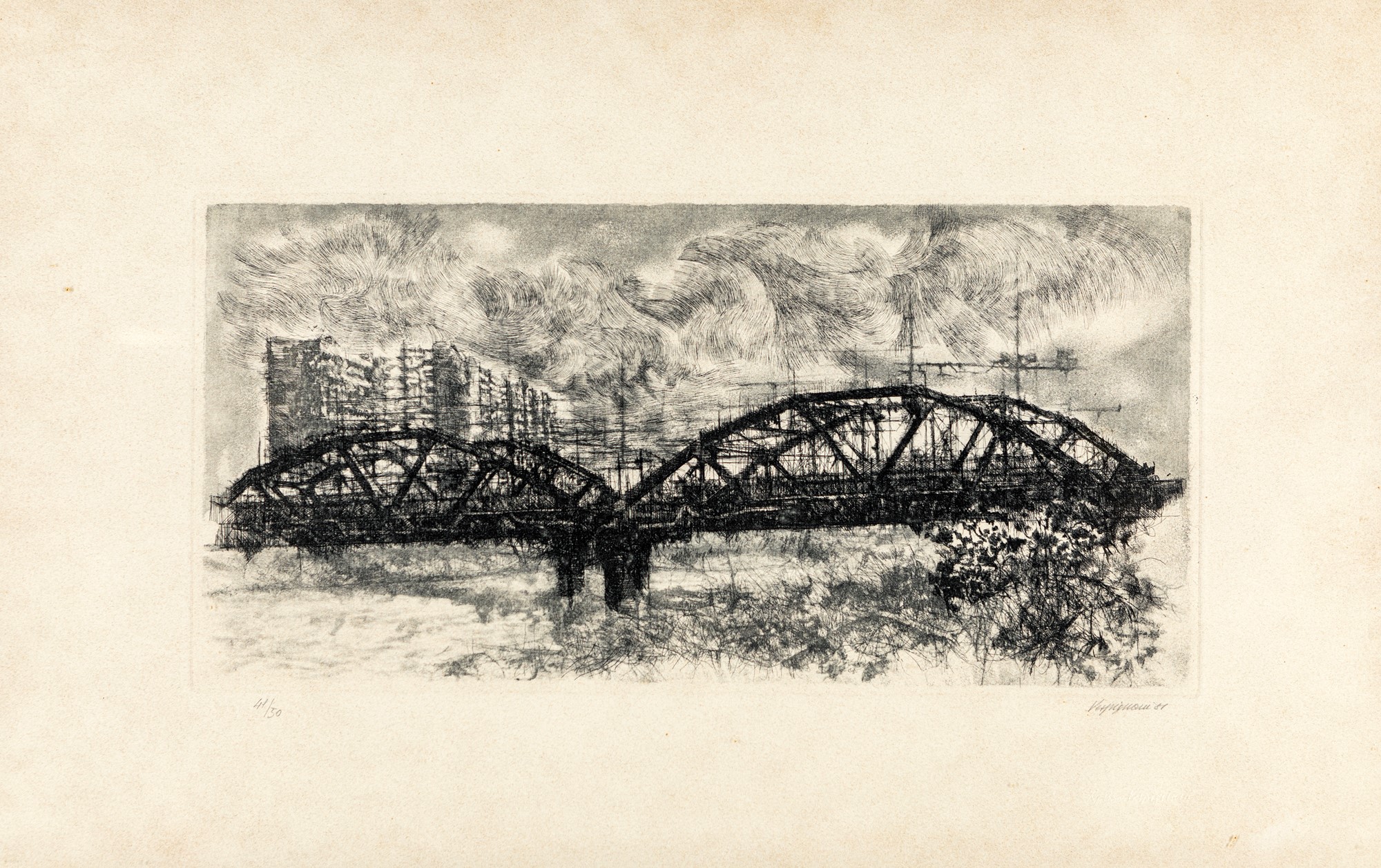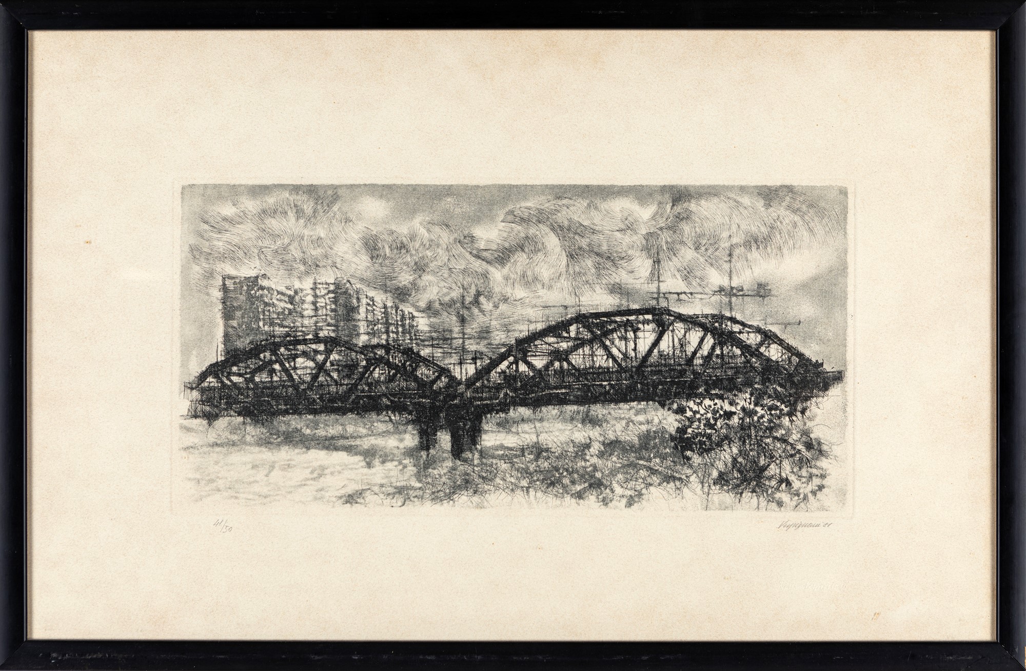 Ponte di Ferro 1981 Acquaforte/acquatinta cm 44x71 - in cornice cm 49x75 Firma, data e numerazione "Vespignani '81, 41/50". Timbro a secco Renzo Vespignani".