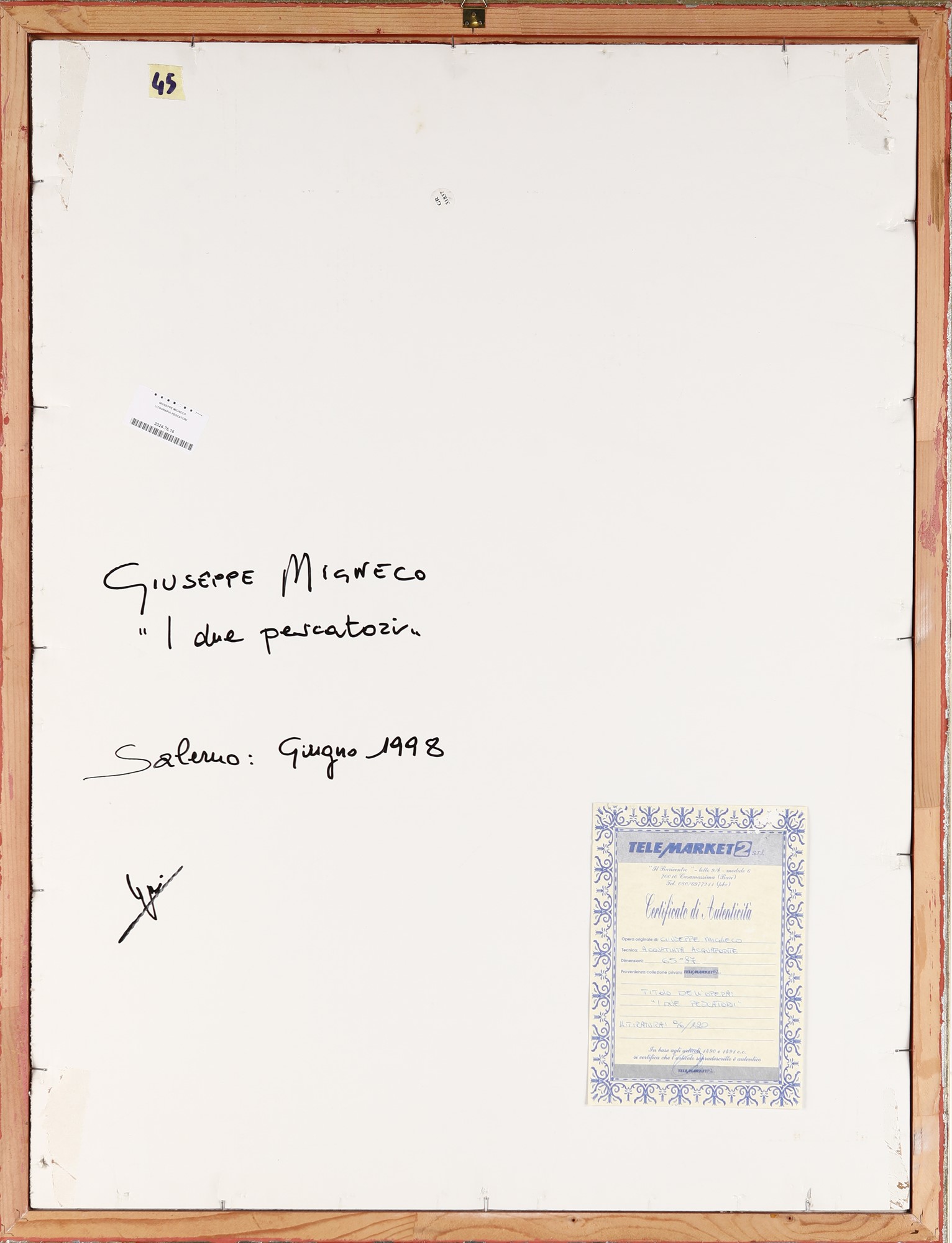I due pescatori Acquaforte/acquatinta cm 86x65 - in cornice cm 92x71 Firma e numerazione "Migneco 96/120". Al verso reca etichetta Telemarket