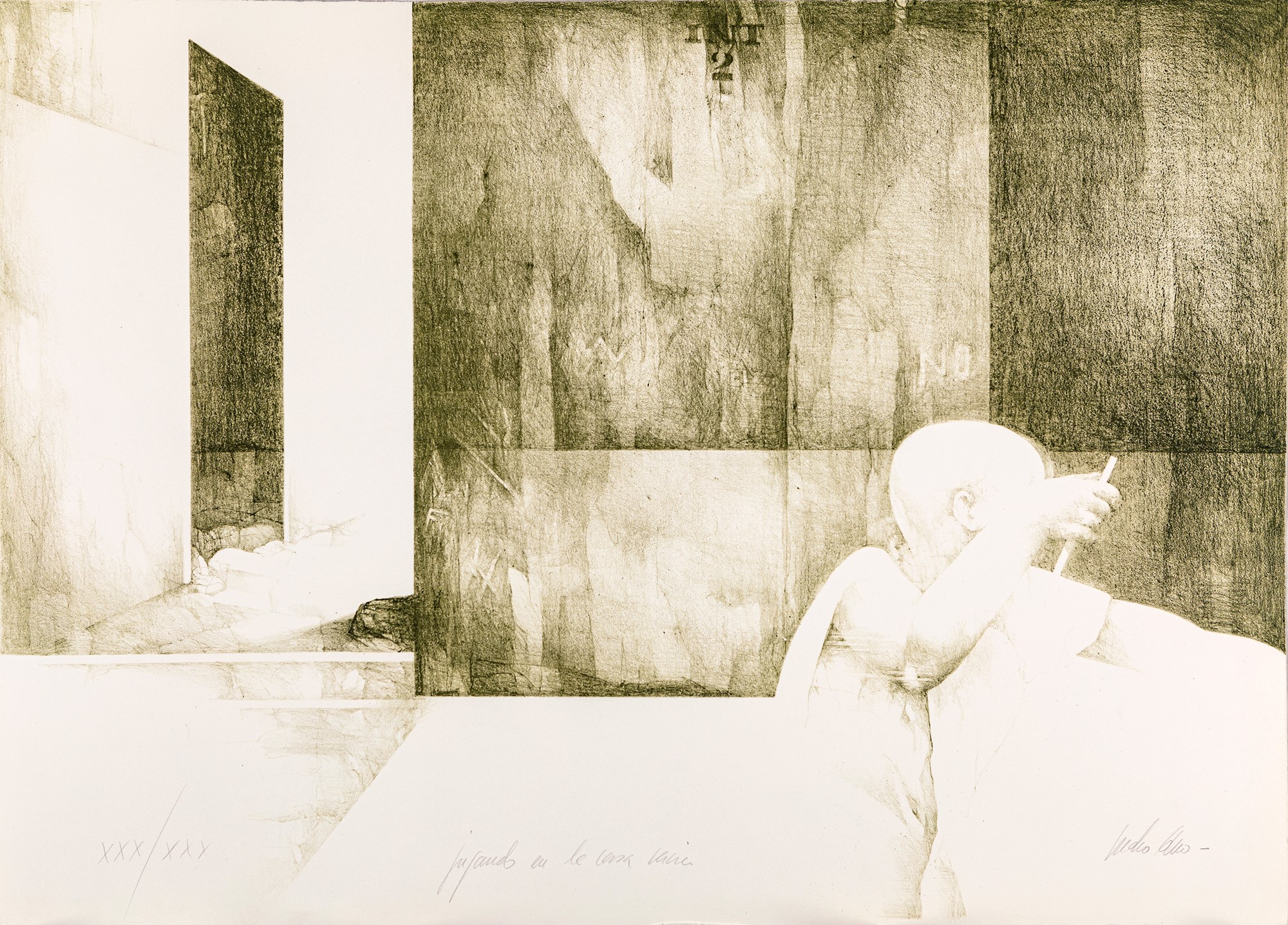 Giocando nella casa vuota 1982 Litografia cm 50x70 Firma, titolo e numerazione "Pedro Cano XXX/XXX". Etichetta dello stampatore Il Torchio Romano