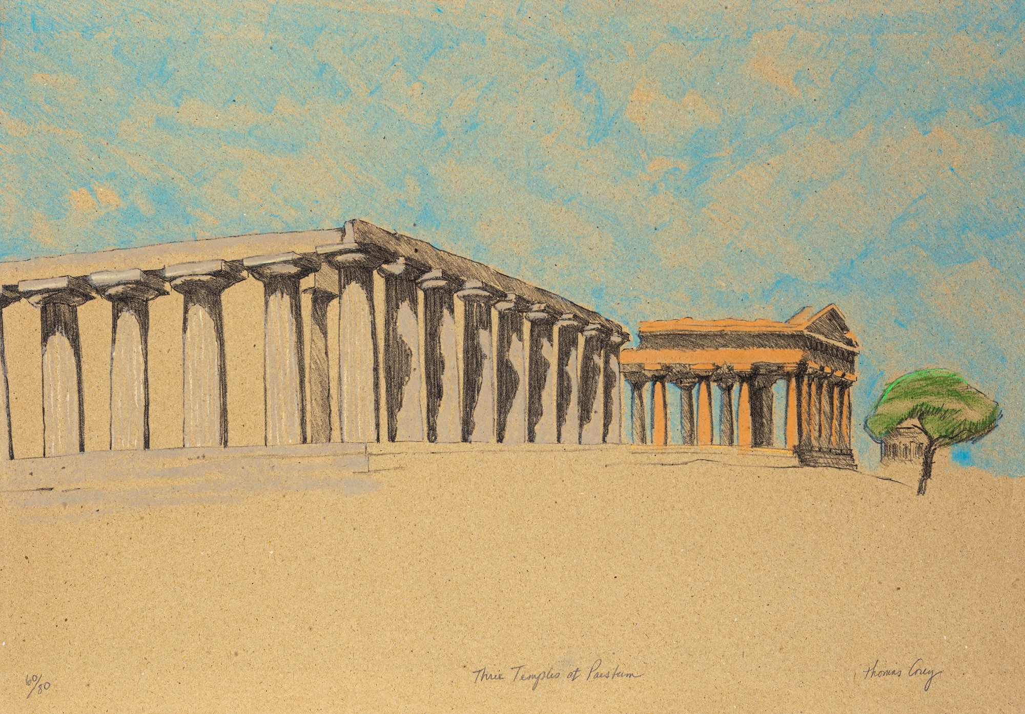 Three Temples at Paestum Litografia colorata a mano cm 54x78 Firma, titolo e numerazione "Thomas Corey, 60/80". Al verso etichetta dello stampatore "Il Torchio Romano"